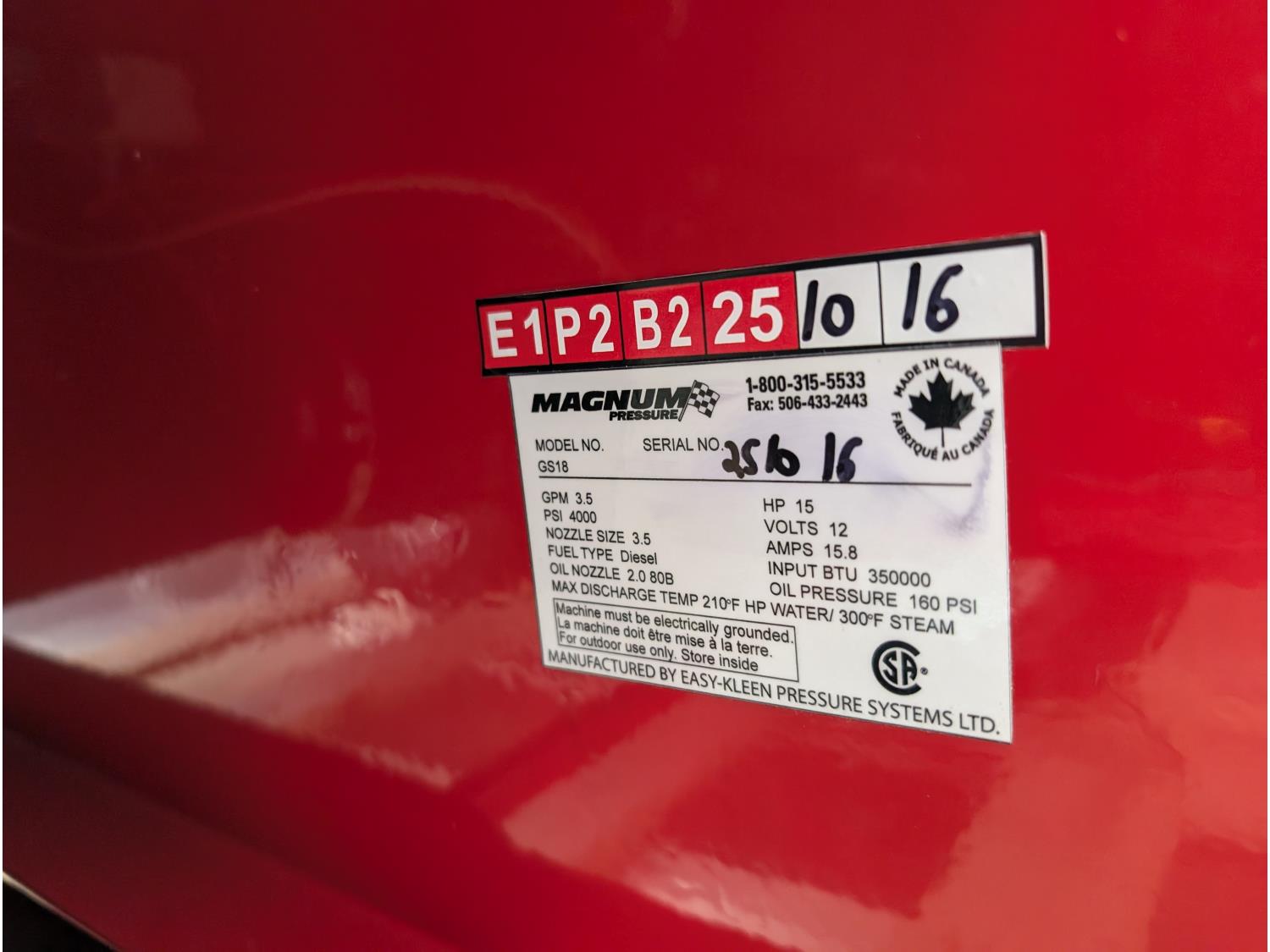 3.5 GPM at 4000 PSI, 15 HP, gasoline engine, electric start, 12 volt burner, oil/diesel fired burned/thermostat, schedule 80 coil with stainless steel housing, fully welded, powder coated frame, 10 gallon poly fuel tank, 30' hose and wand