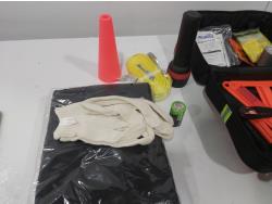 Emergency vehicle safety kit (unused), (1) L/XL safety vest, (6) pairs of nitrile coated work gloves, 12V rotating amber vehicle lamp (unused), snow brush/ice scraper (unused)