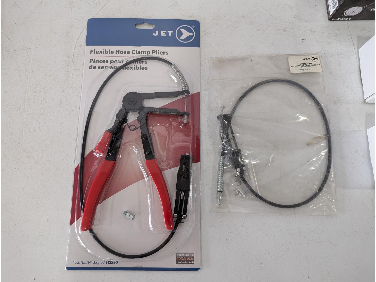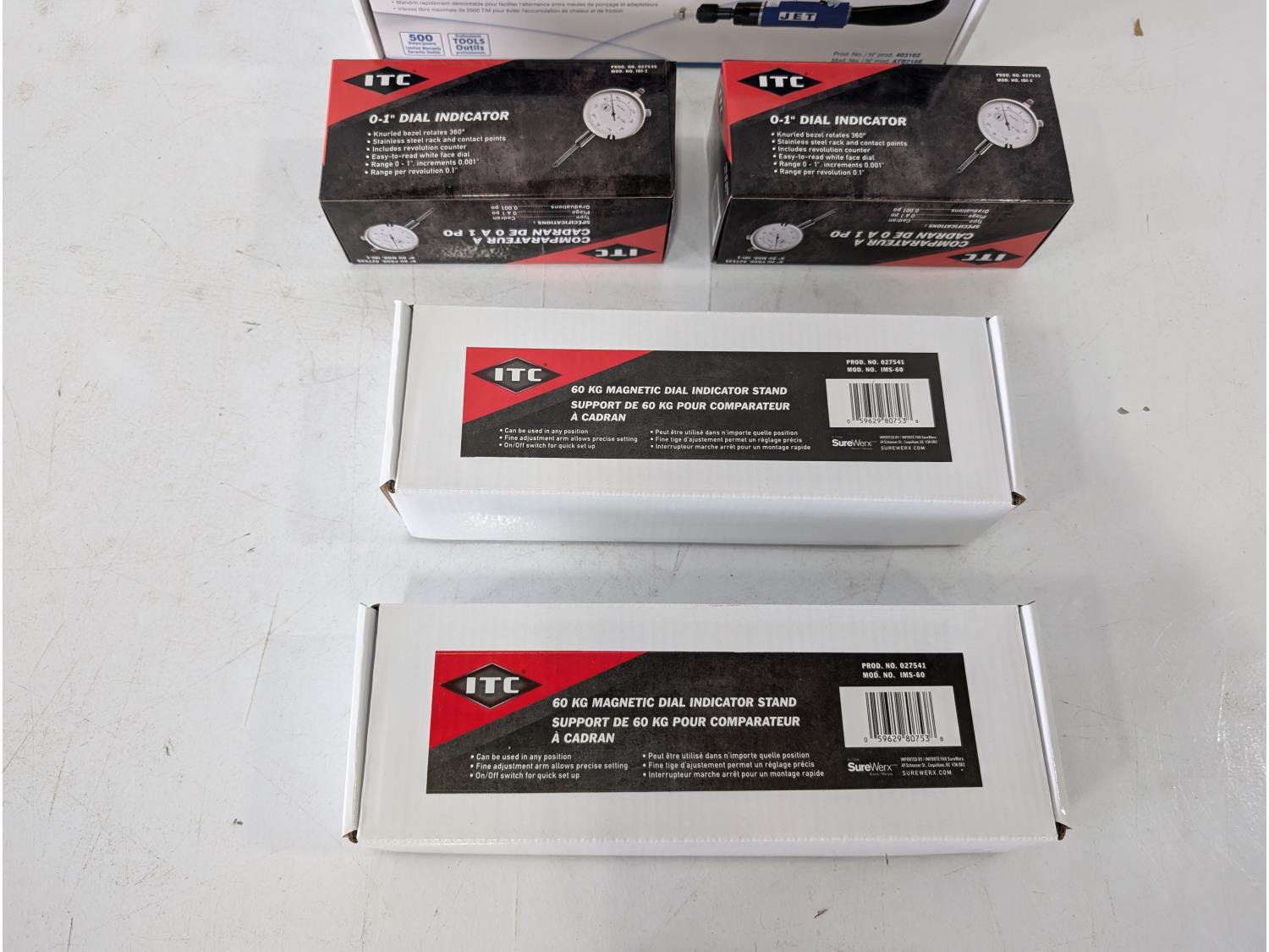 (2) 60 kg magnetic dial indicator stand, tire buffer, (2) 0-1 inch dial indicator, 27 mm 3/8 inch drive sockets, plastic display, flexible hose clamp pliers with extra cable