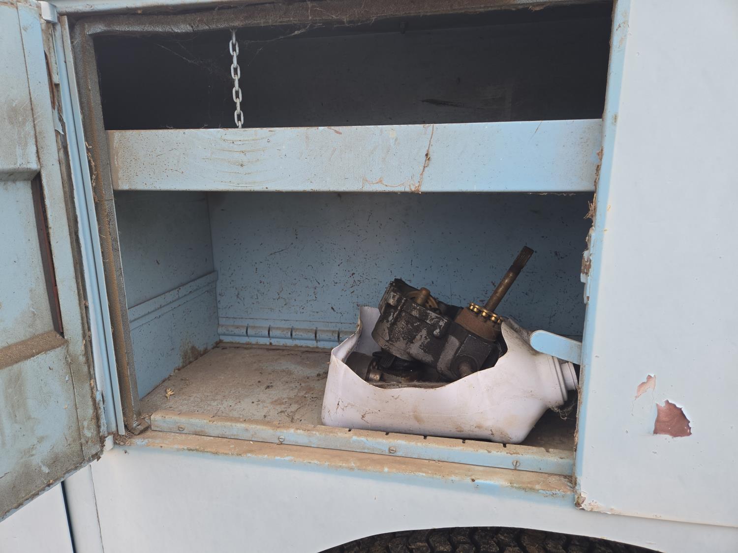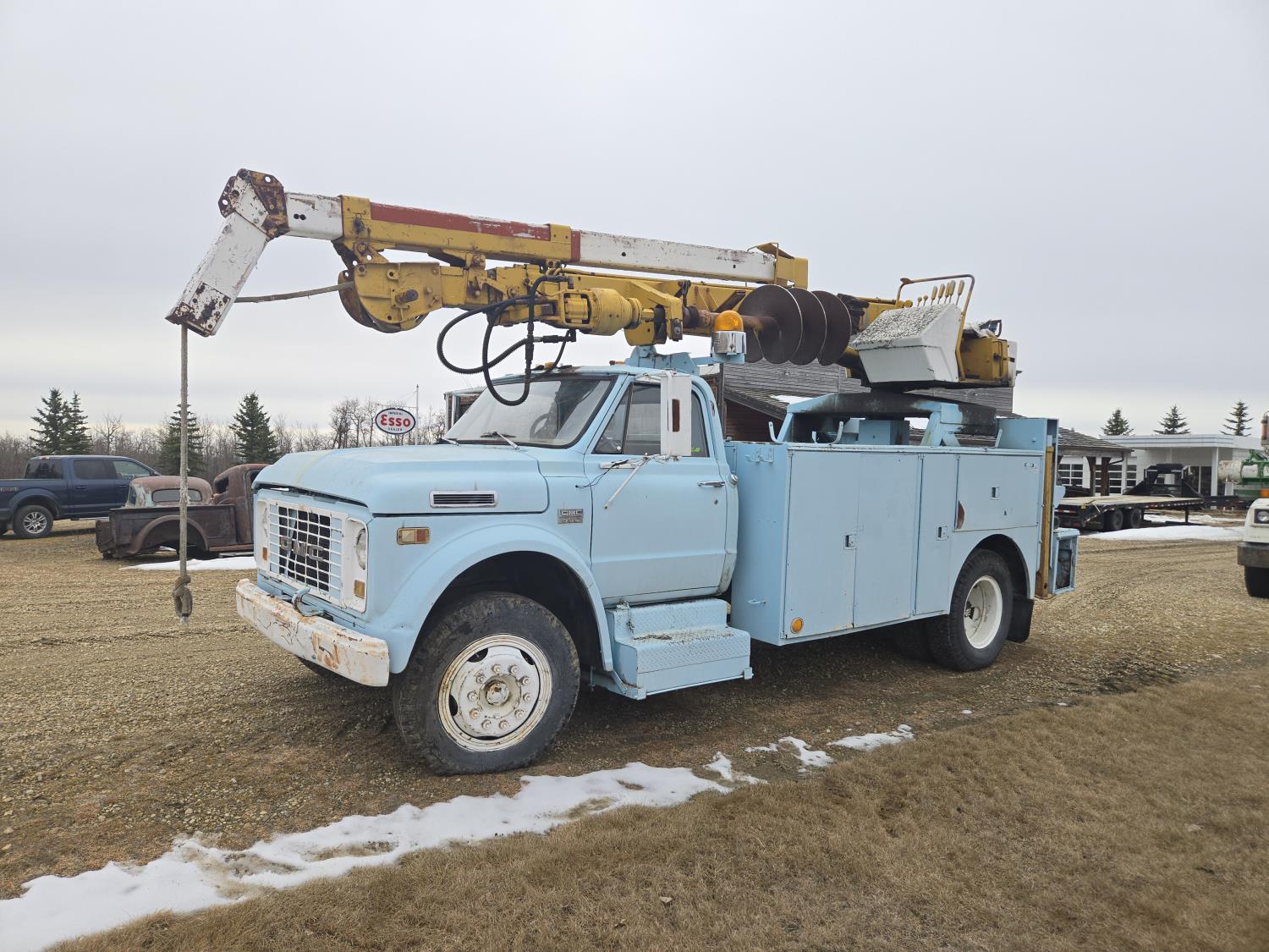 V8 gas engine, 5&2 transmission, digger body with cabinets, Pitman 22 inch auger
