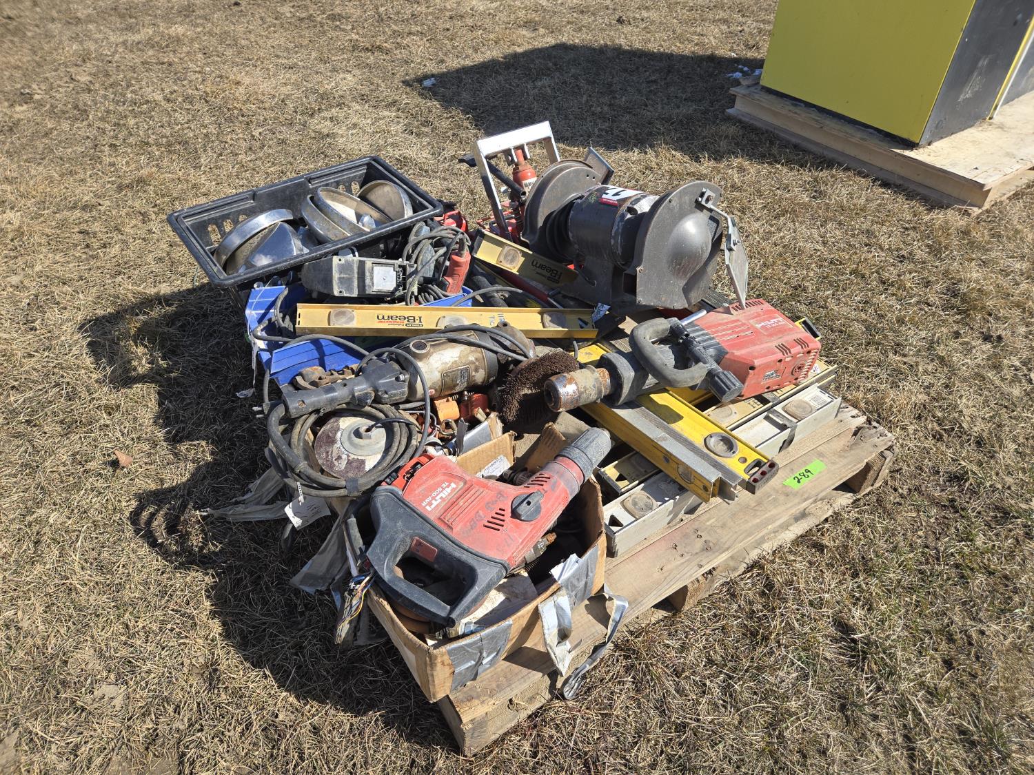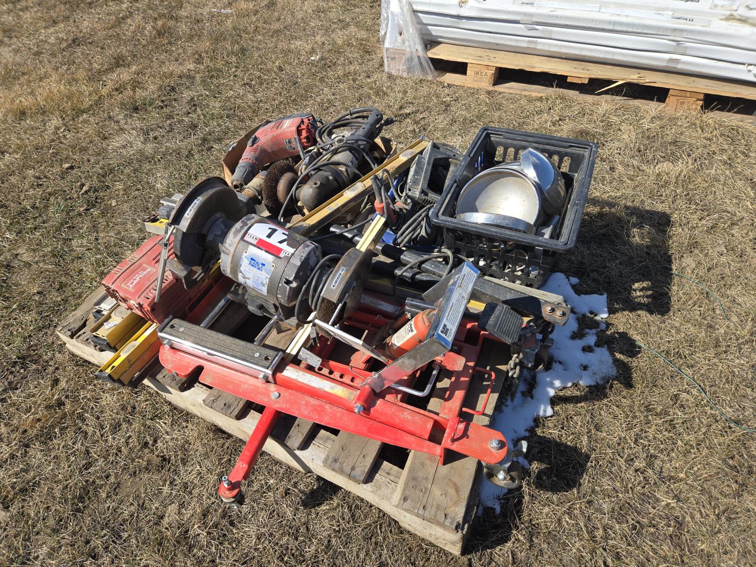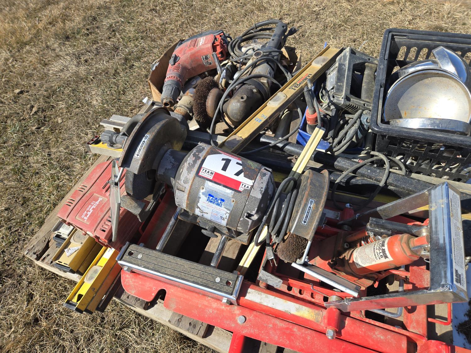 levels, motorcycle lift, bench grinder, miscellaneous tools