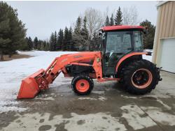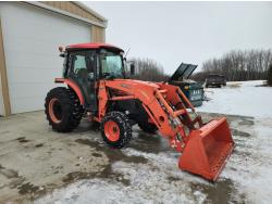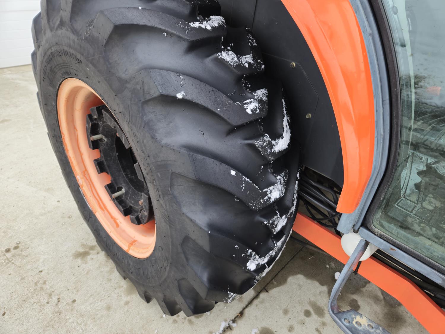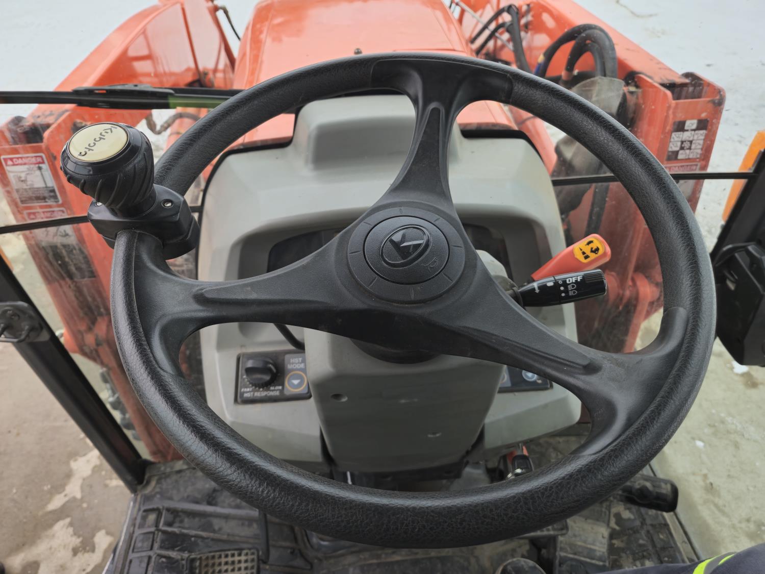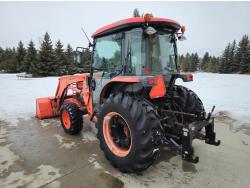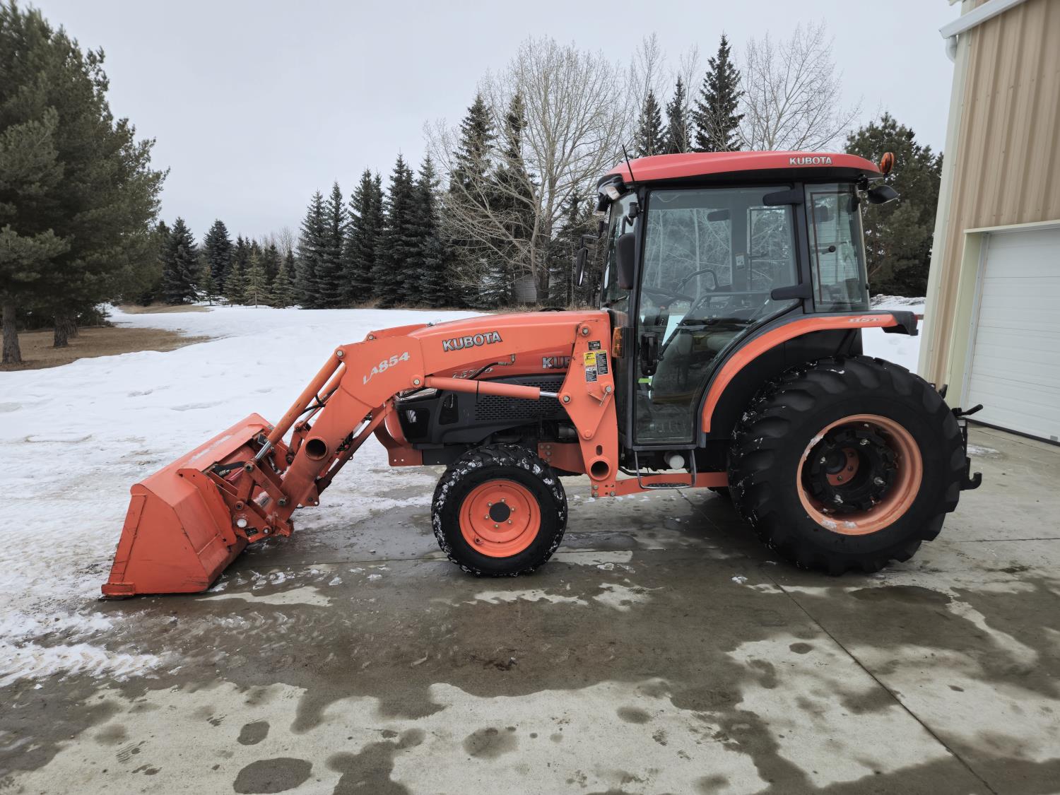 Kubota LA854 loader, 72 inch bucket, grill guard, Kubota 2.4 4 cylinder 59 HP, diesel engine, 50 PTO HP, hydro 3 range transmission, cab, rear differential lock, joystick, A/C, radio, hydraulic Q/A bucket, 540 PTO, Q/A 3 point hitch, 2 rear hydraulic outlets, rear wheel weights, 10-16.5 front tires, 17.5L-24 rear tires