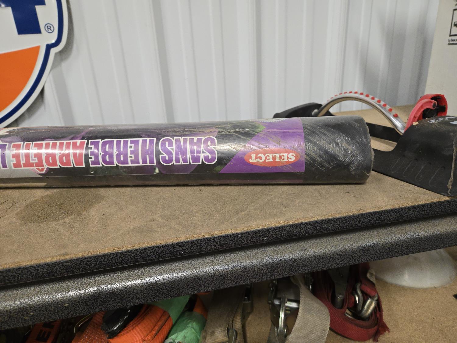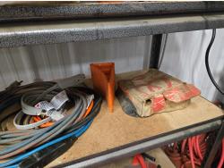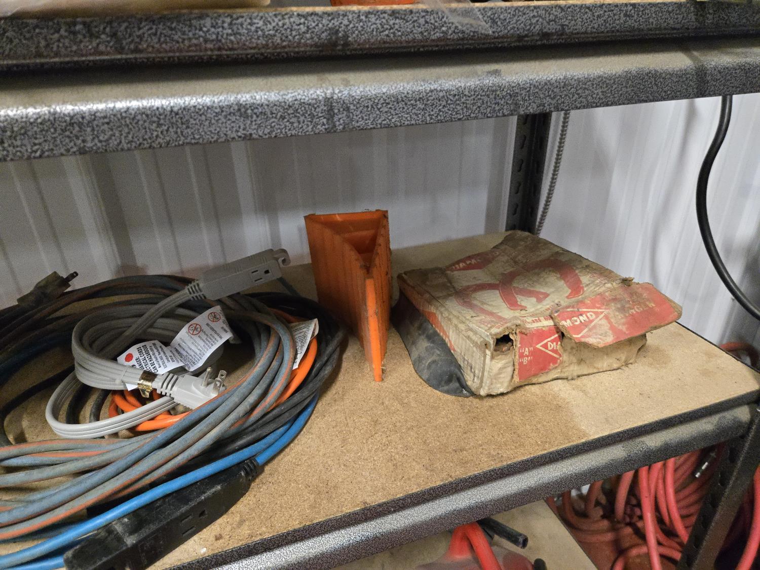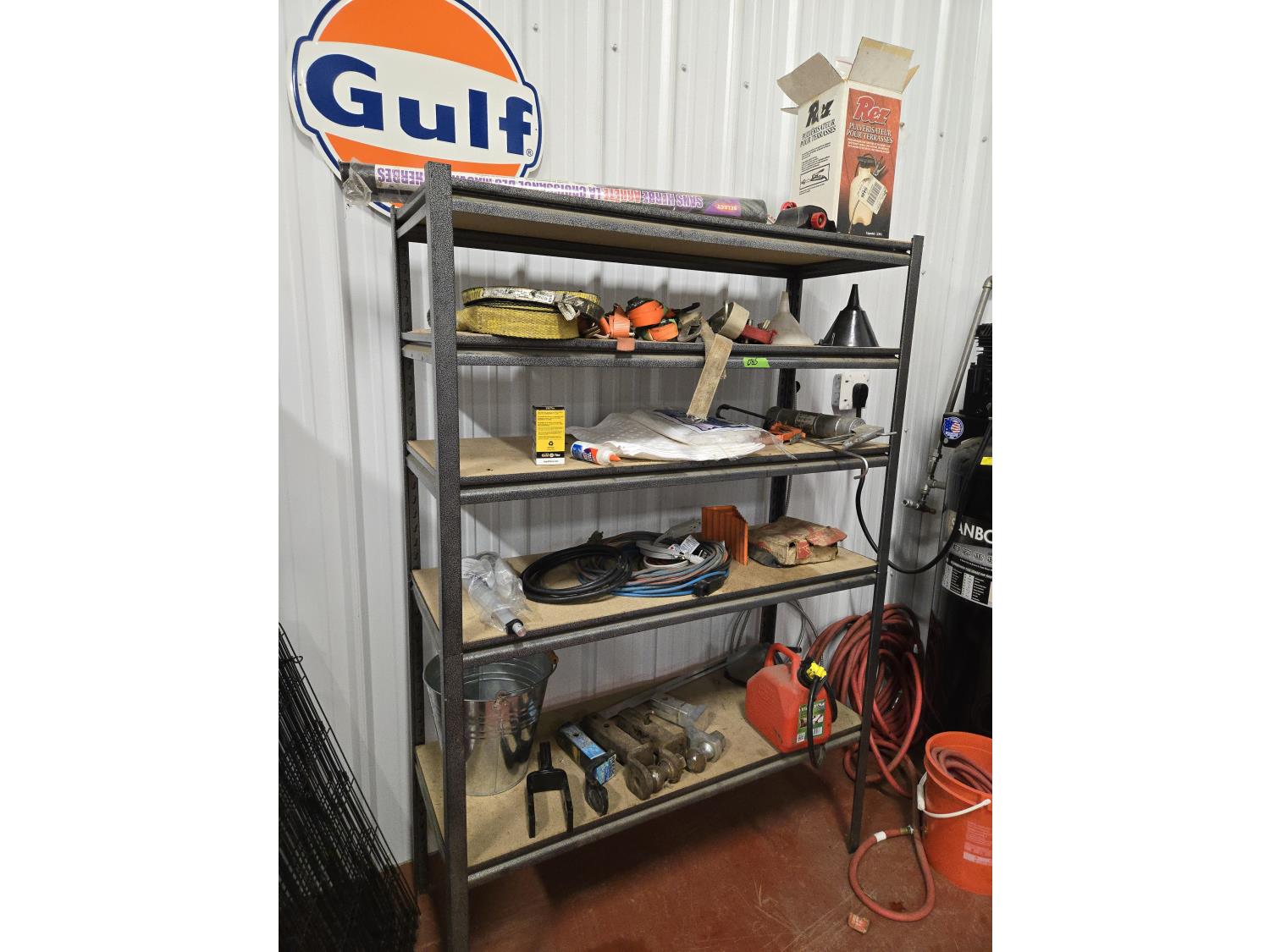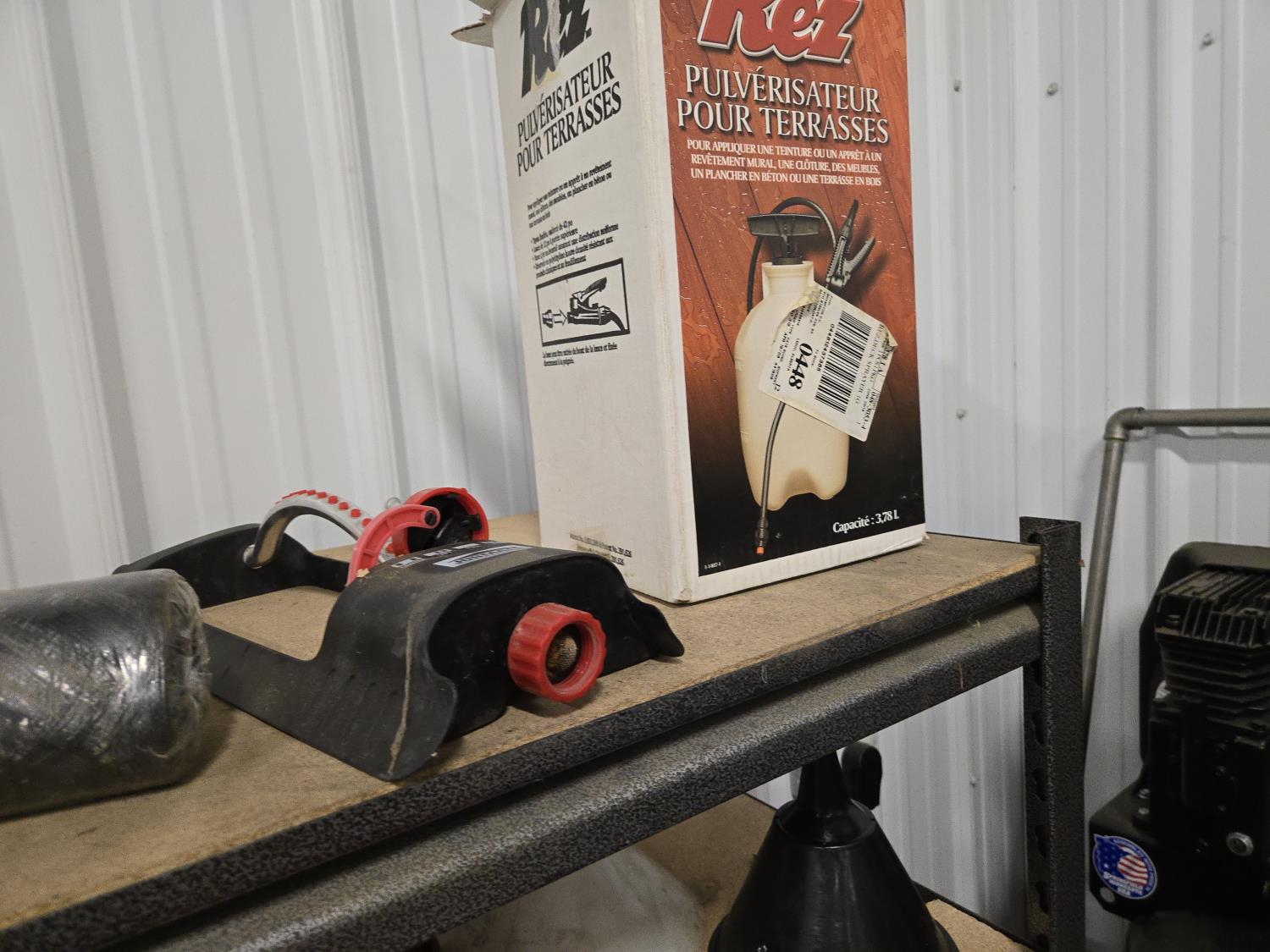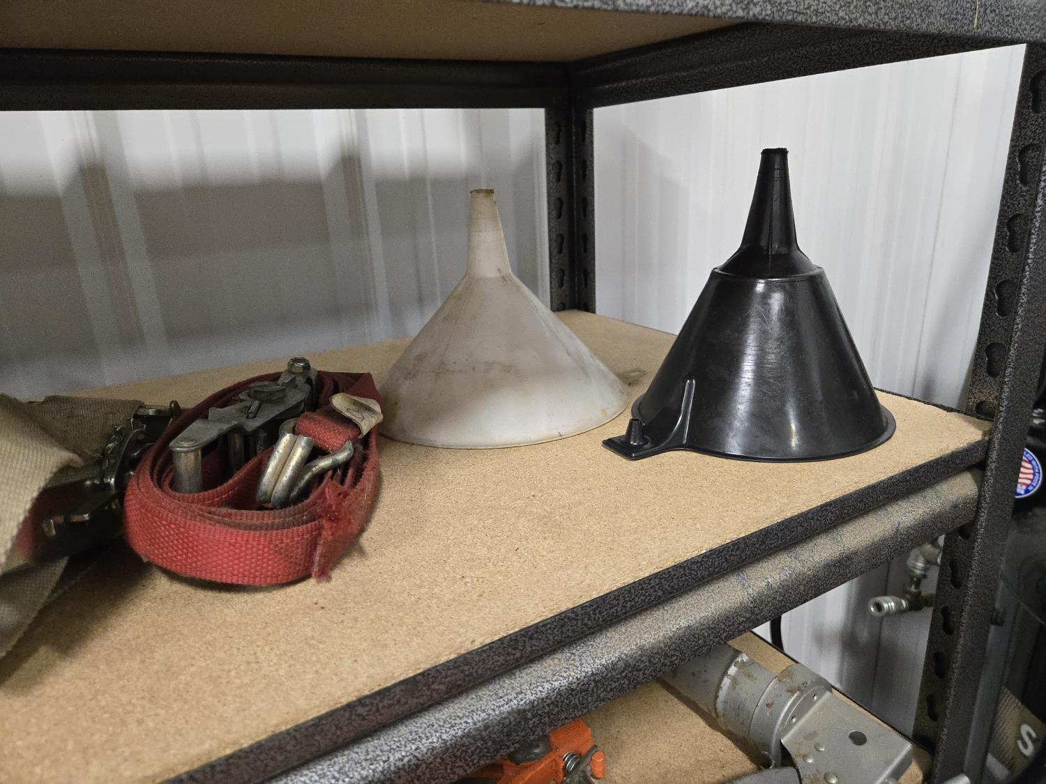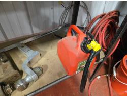 (5) trailer hitches, electrical extension cords, 1.25 poly fuel can, (2) grease guns, selection of cargo straps, hand sprayer, miscellaneous items