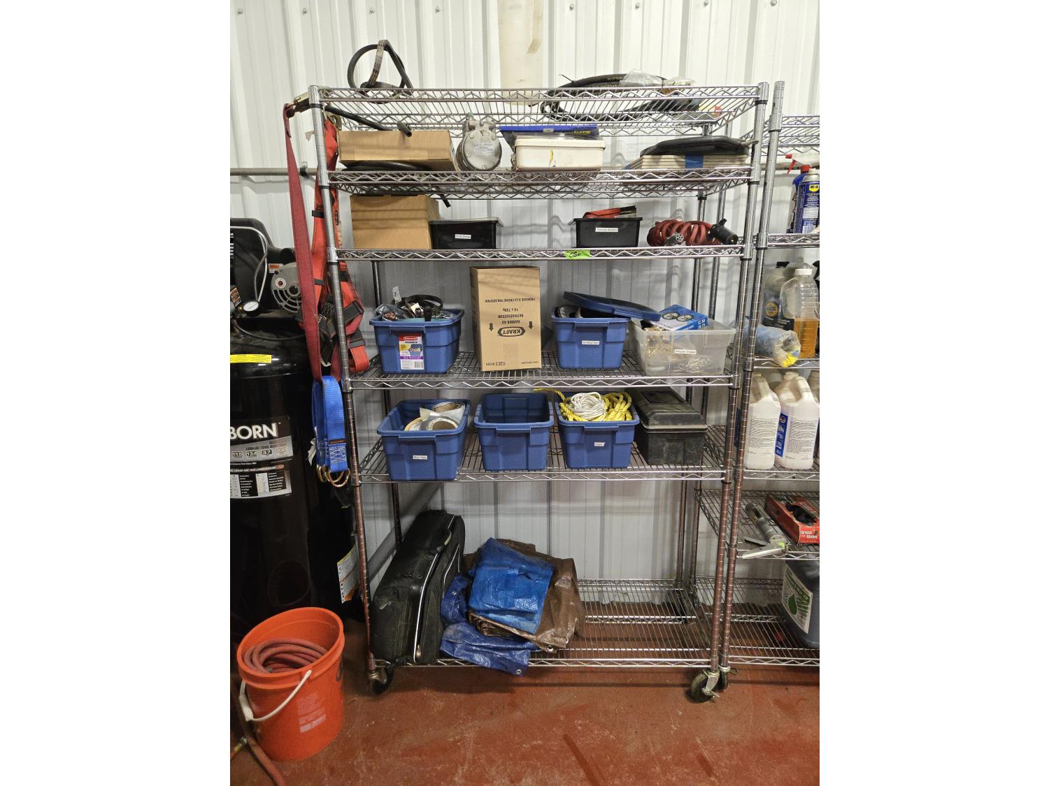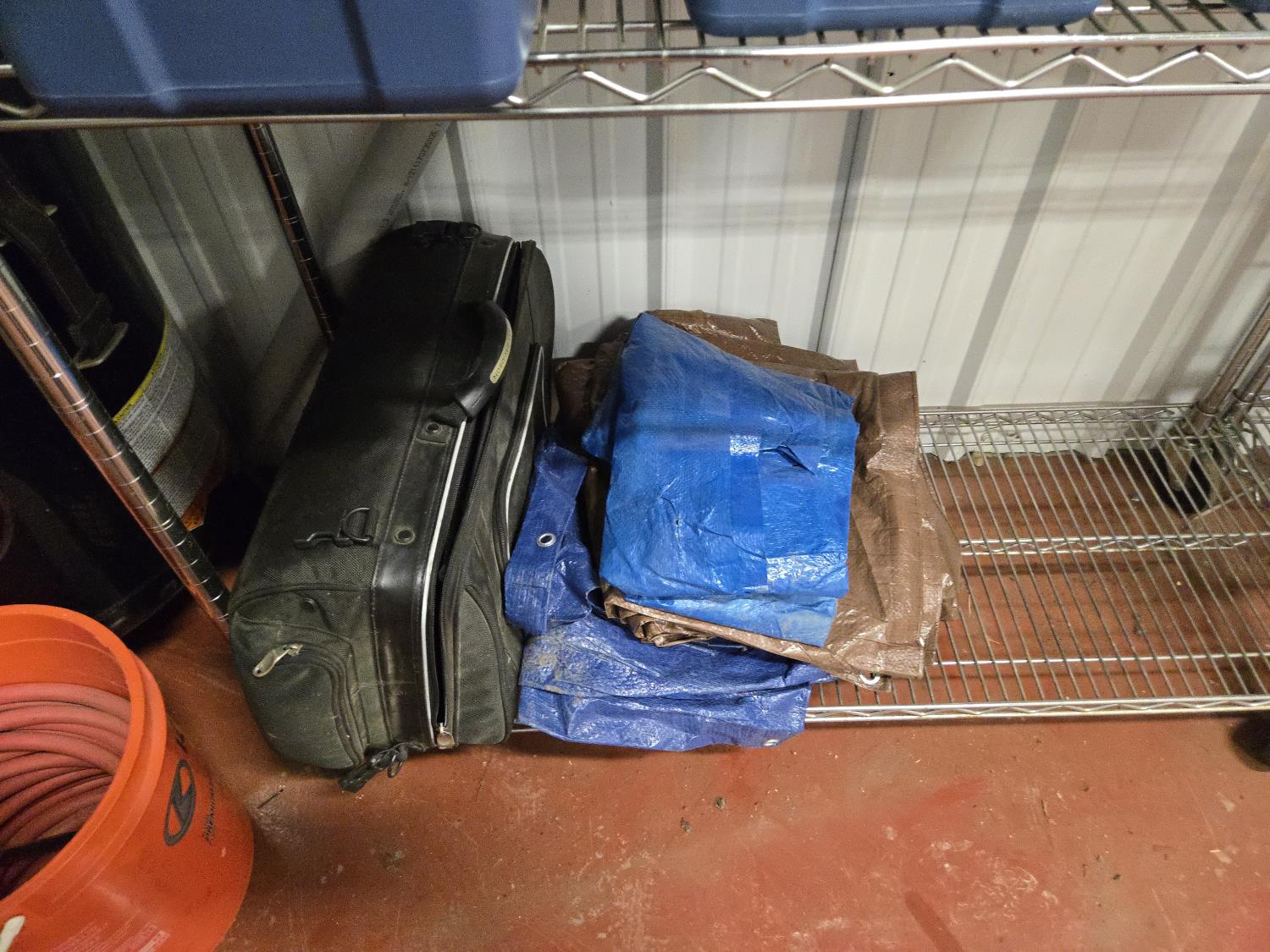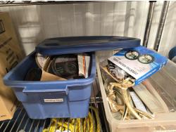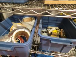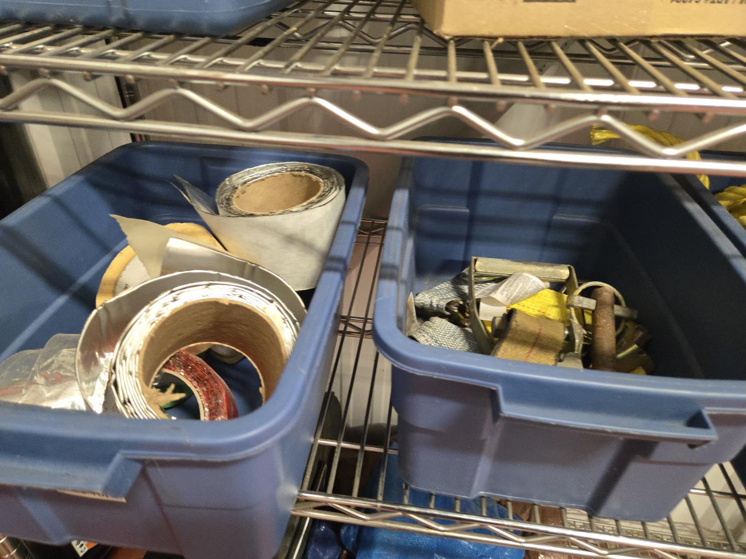poly tarps, trailer connector harness, rope, string, miscellaneous tape, bungee cords, concrete anchors, steel fish tape, Flexible chrome trim, miscellaneous items