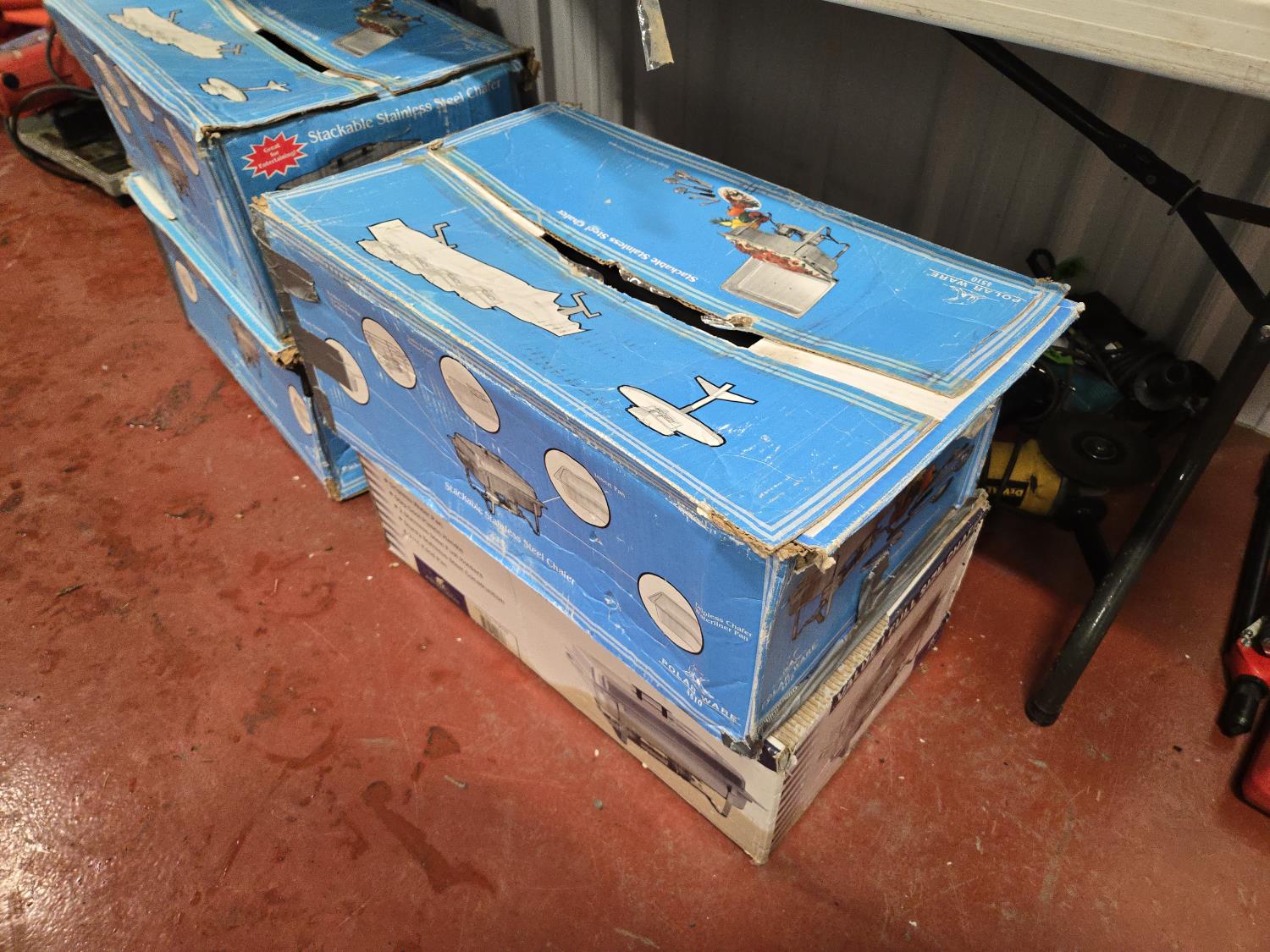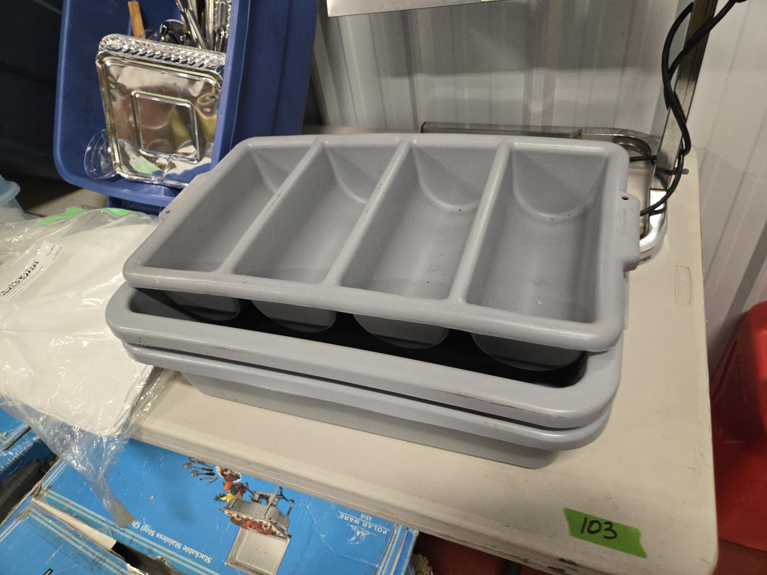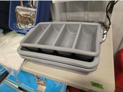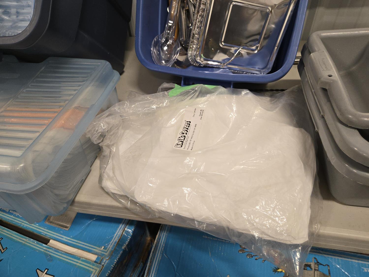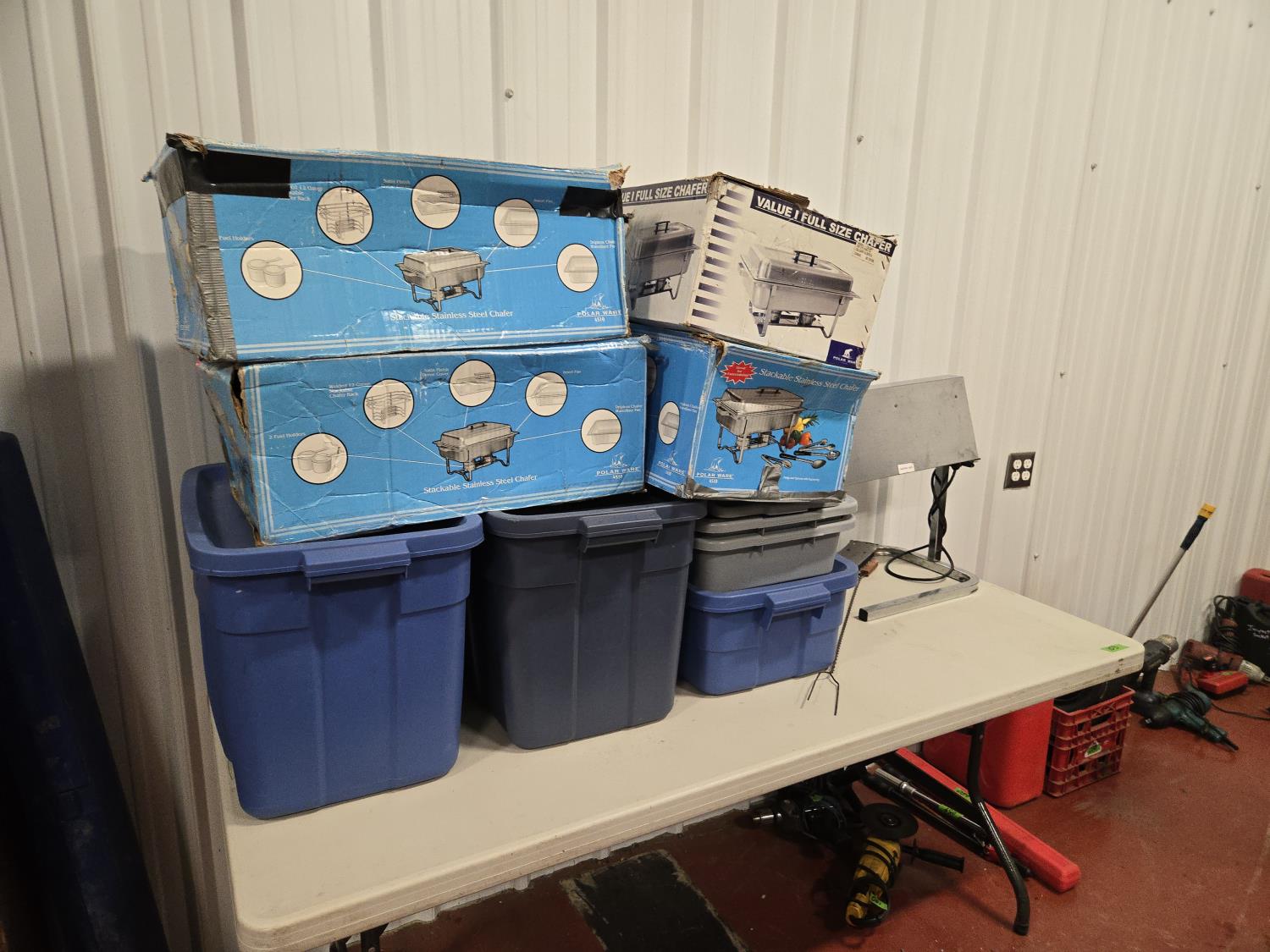 heat lamp, (2) poly trays, selection of disposable cutlery and cups, (4) stainless food warmers, table covers, poly cutlery tray, (3) poly totes, miscellaneous food related items, 30" X 72" folding poly table