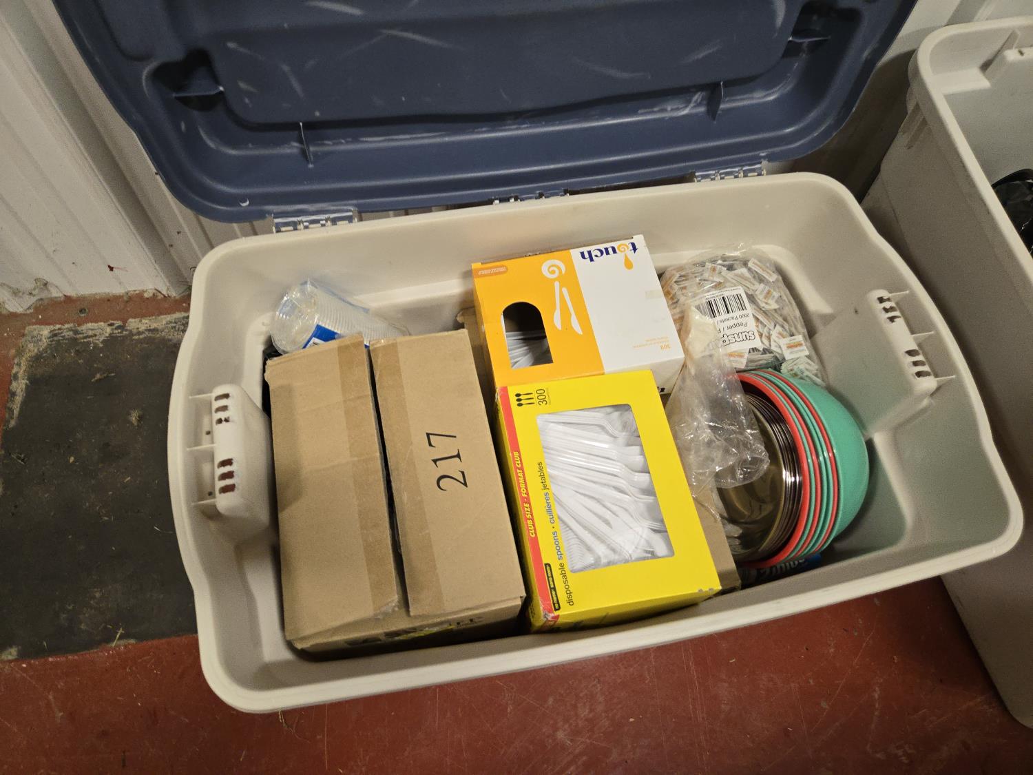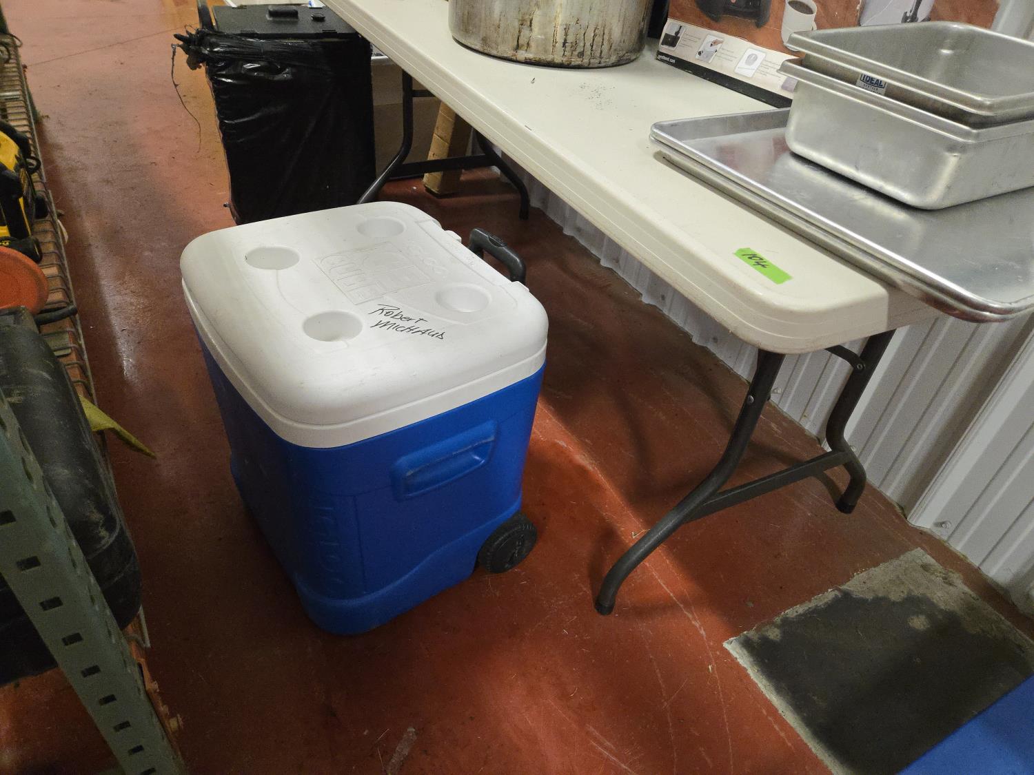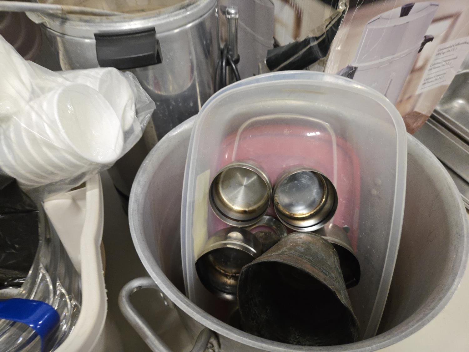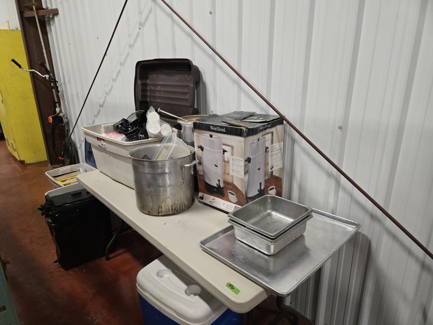 30 inch X 72 inch folding poly table, (2) 18 inch X 26 inch stainless steel trays, (2) 10 inch X 12 inch stainless steel trays, (2) Westbend 100 cup coffee makers, large stock pot, qty of disposable cutlery, large cooler, juice cooler, miscellaneous food related items