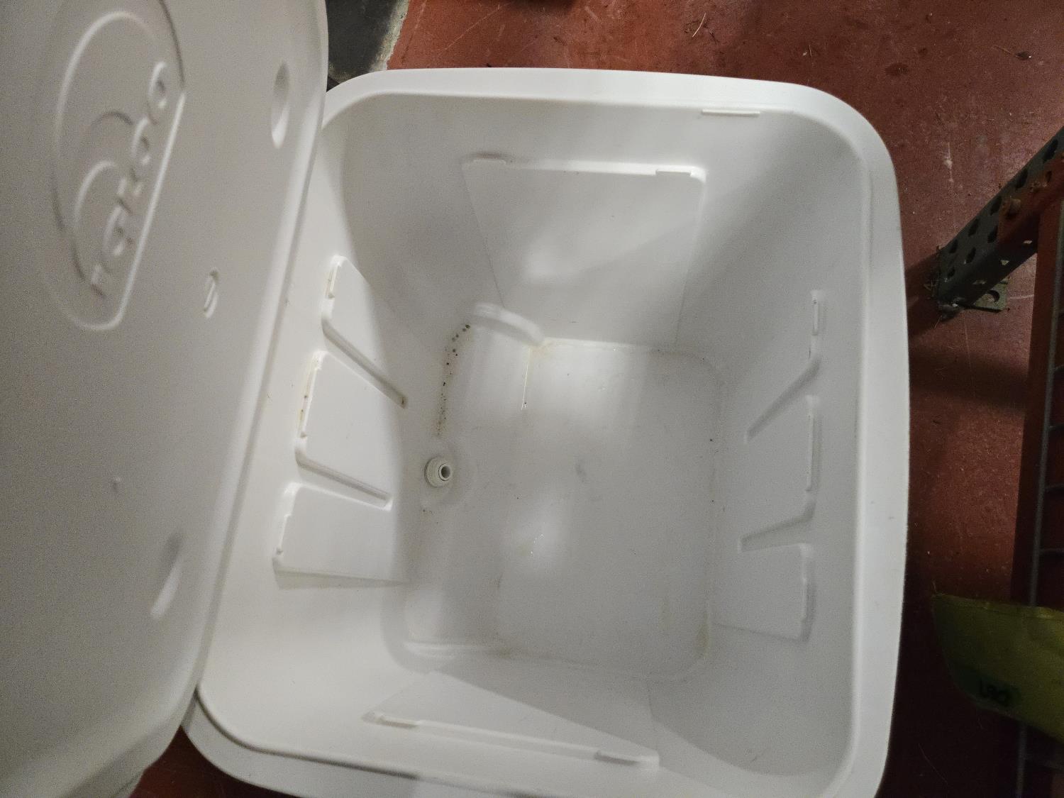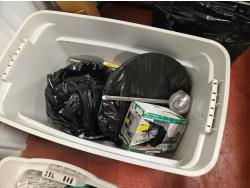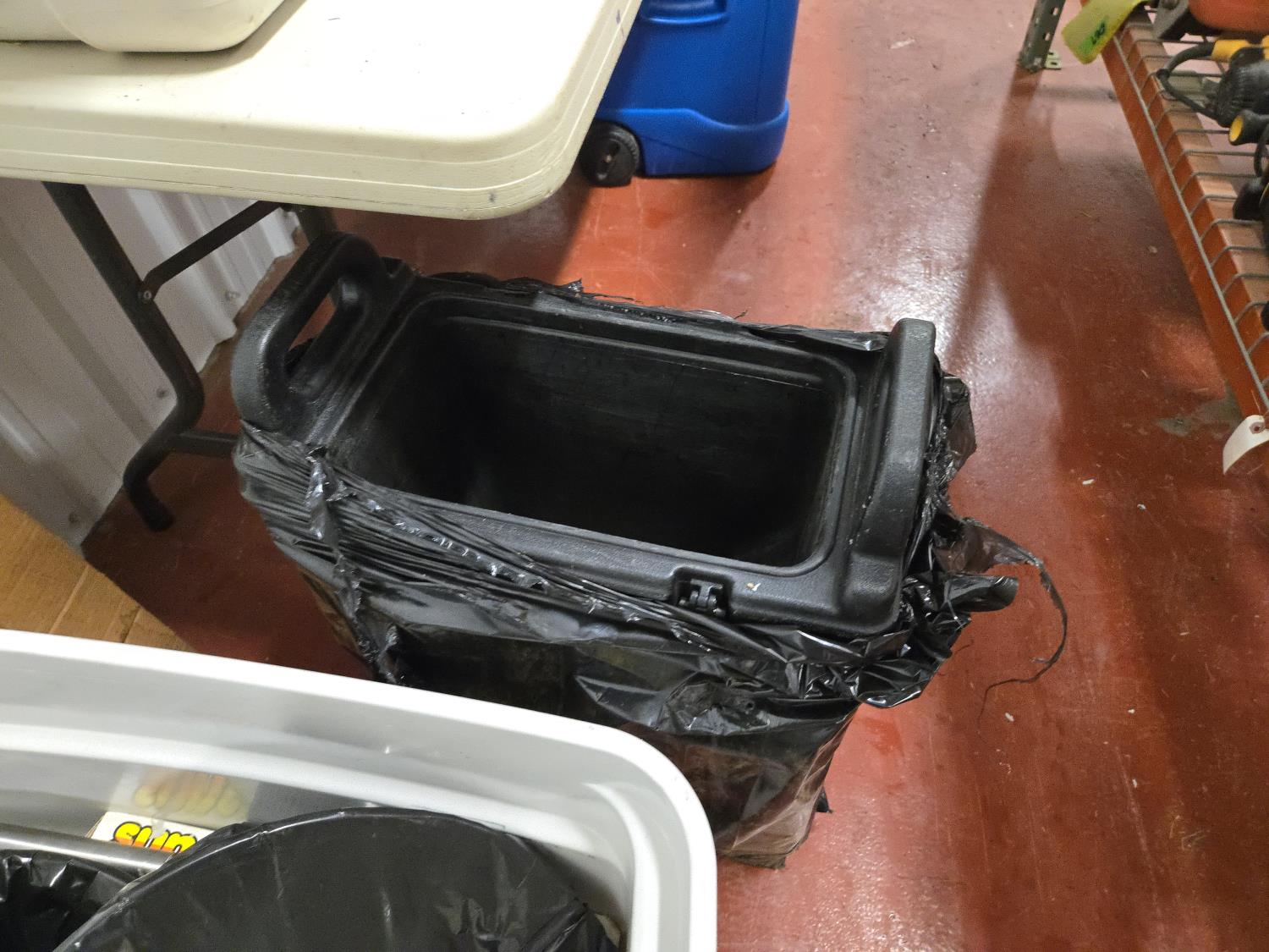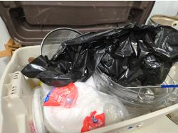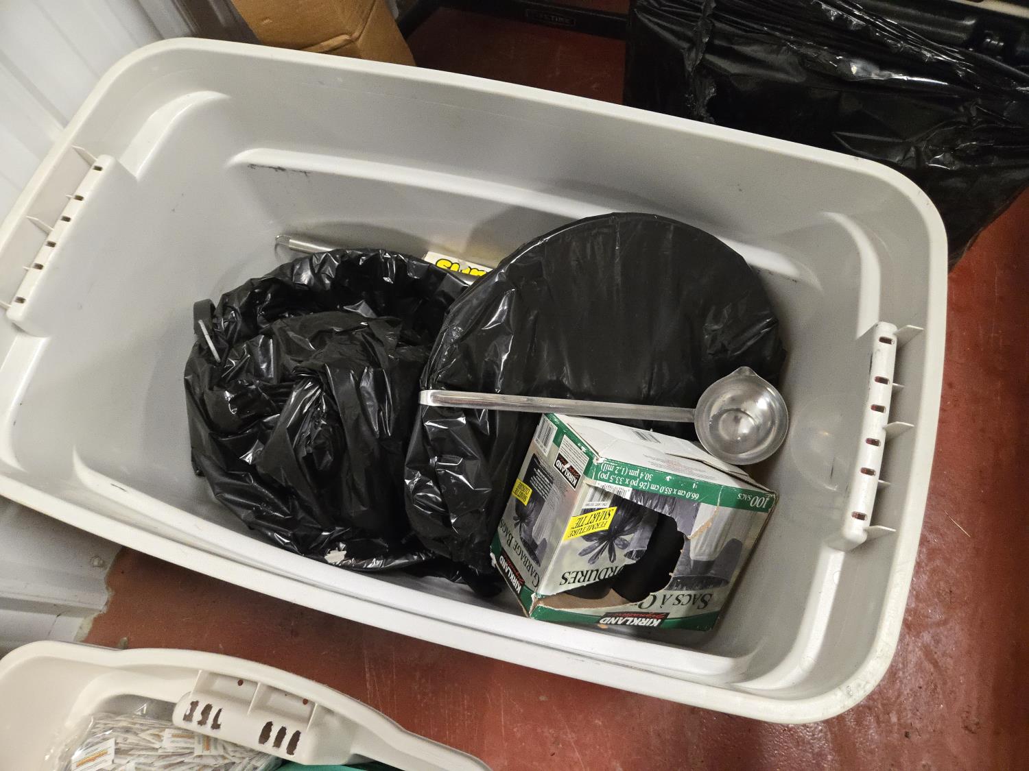 30 inch X 72 inch folding poly table, (2) 18 inch X 26 inch stainless steel trays, (2) 10 inch X 12 inch stainless steel trays, (2) Westbend 100 cup coffee makers, large stock pot, qty of disposable cutlery, large cooler, juice cooler, miscellaneous food related items
