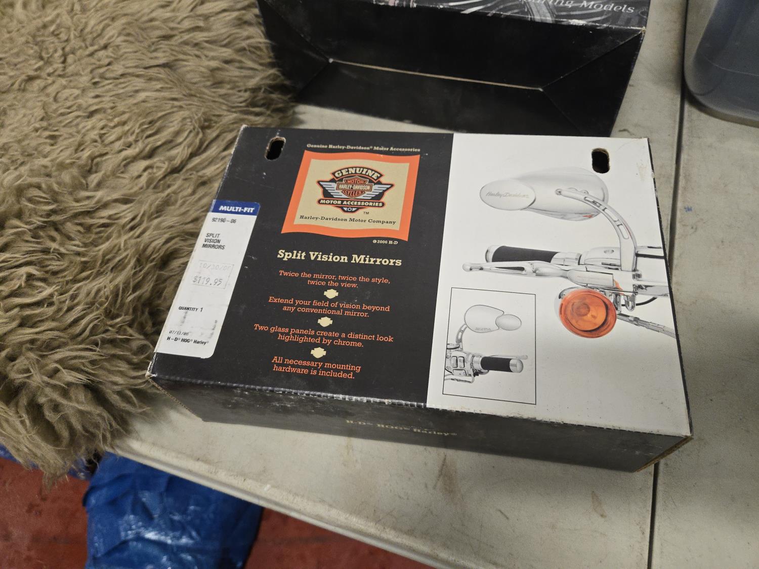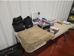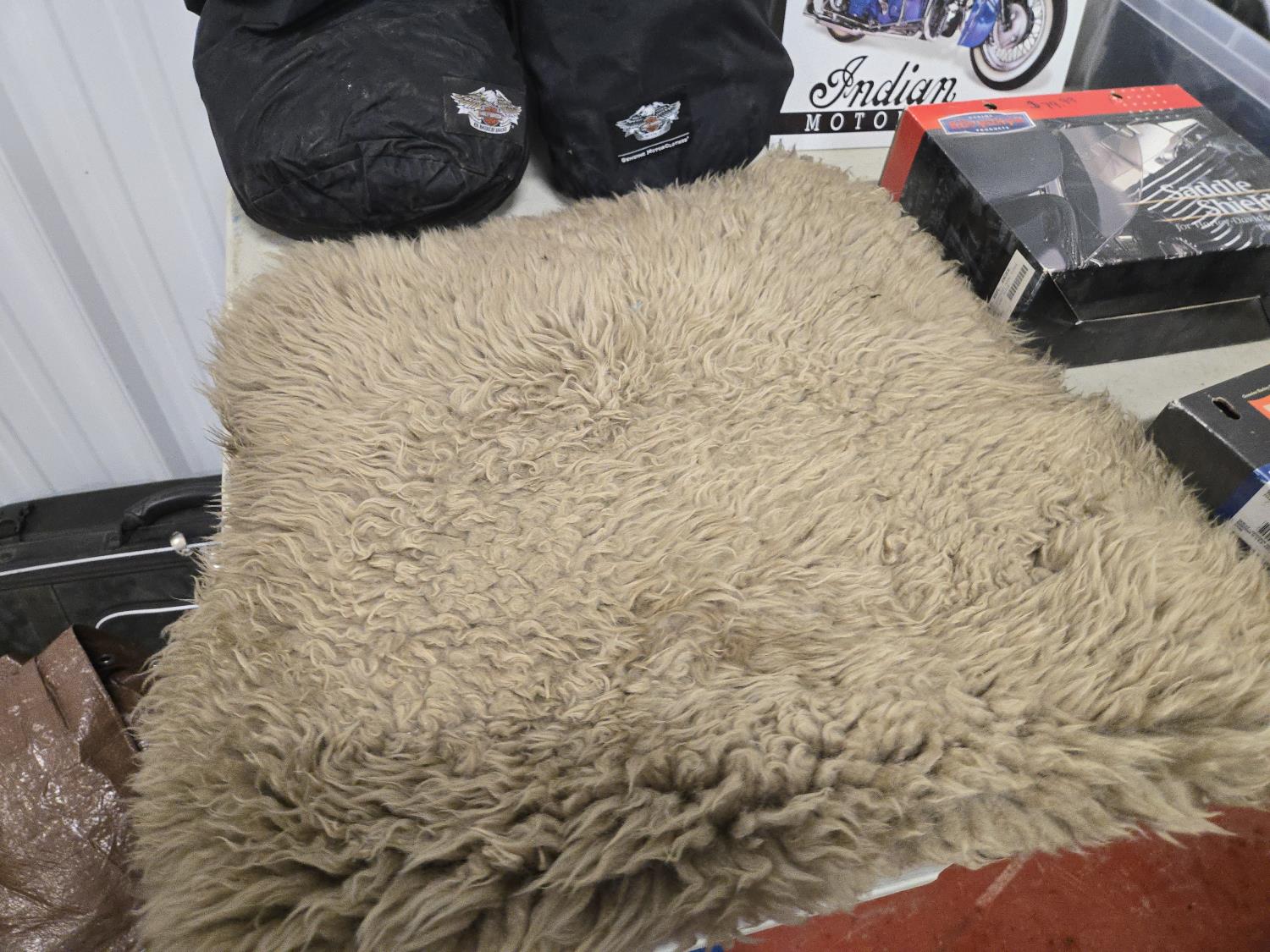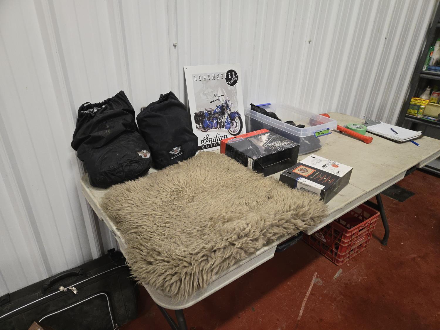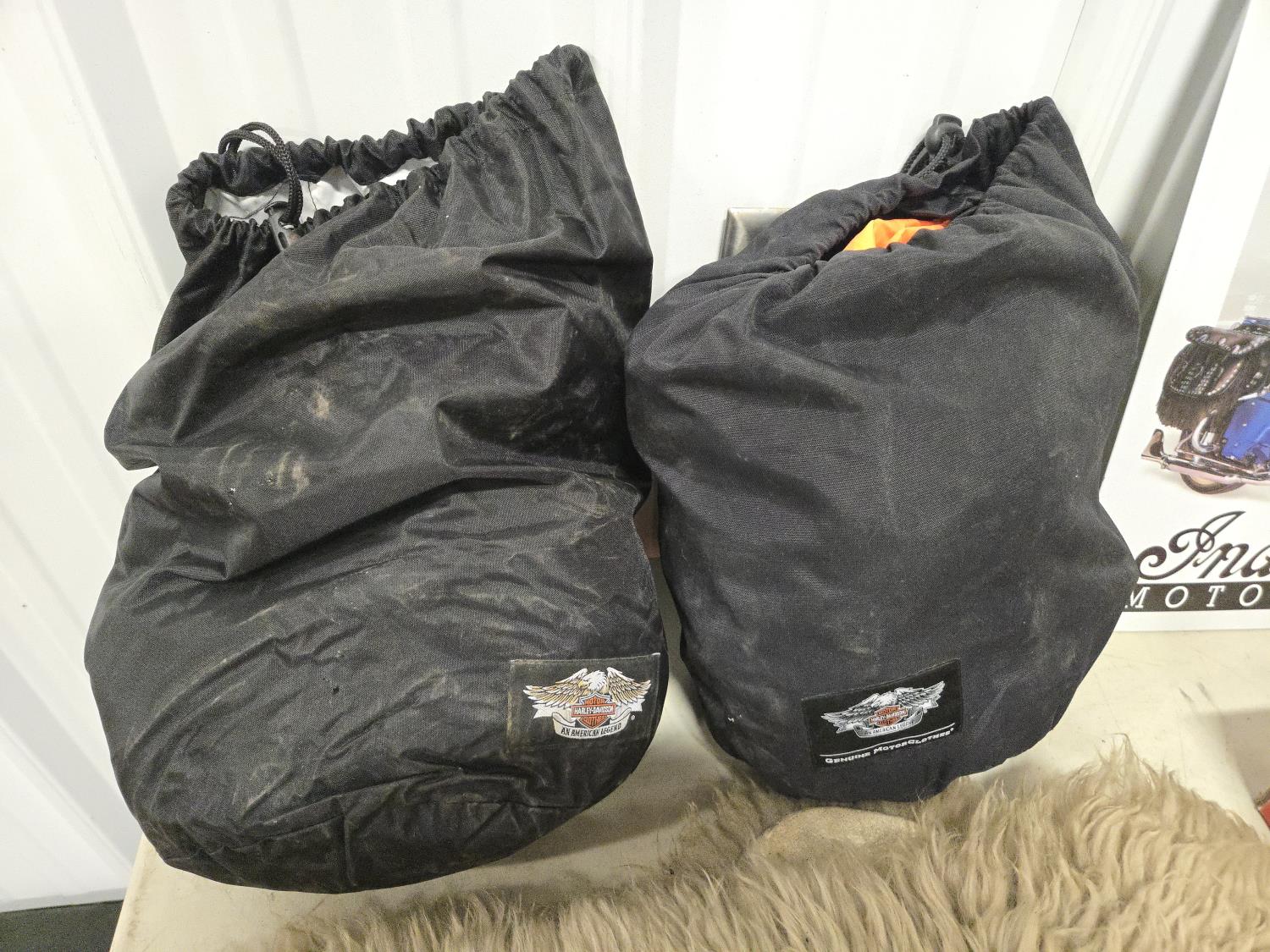 gloves, seat fleece, Harley mirror, saddle shields, (2) riding rain suits