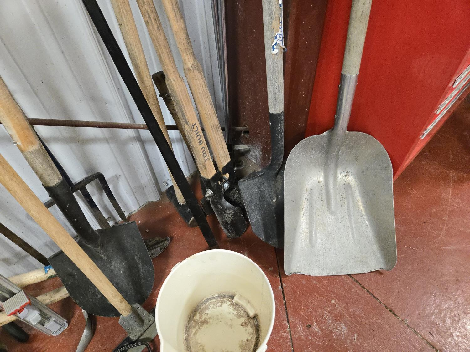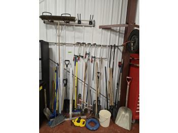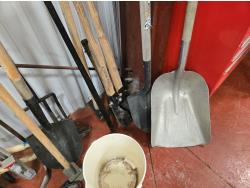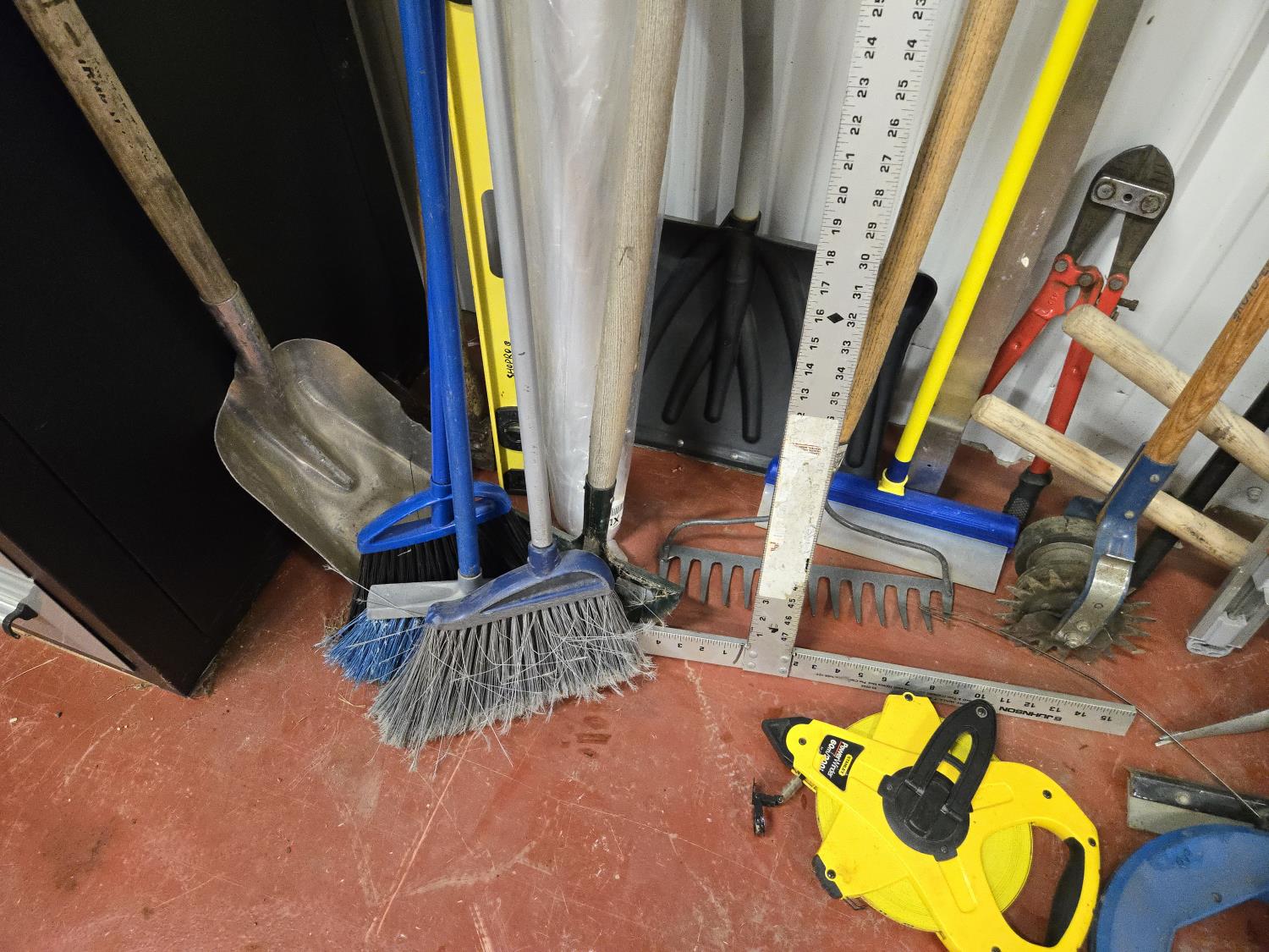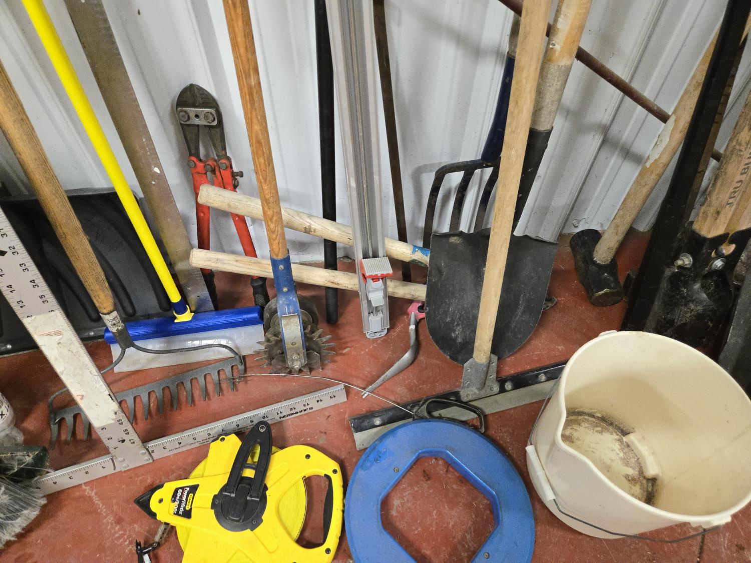brooms, shovels, clamps, axes, sledge hammer, rake, bolt cutter, long tape measure, fish tape, miscellaneous items