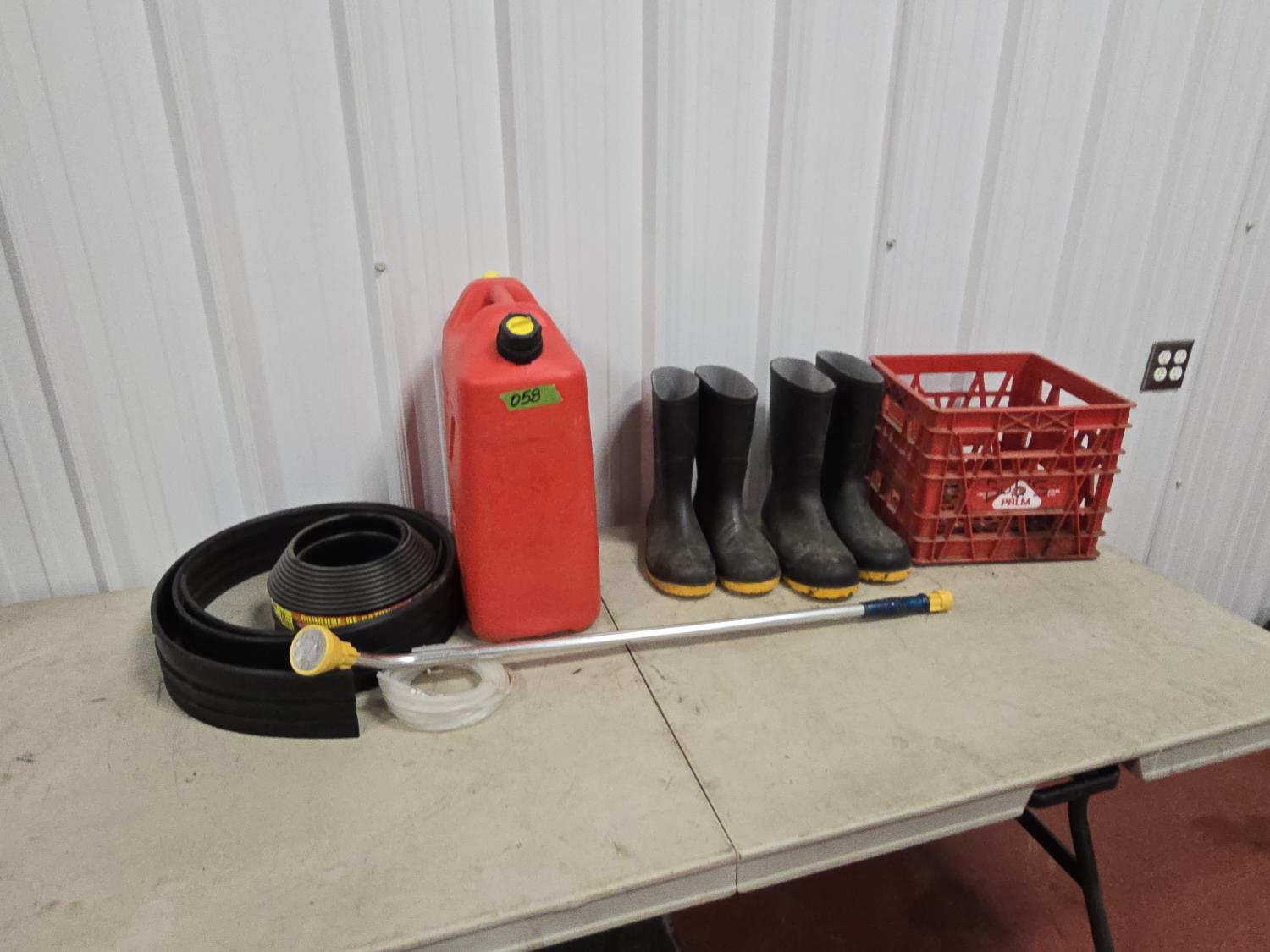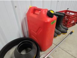 (1) pair rubber boots size 12, (1) pair rubber boots size 9, 20 L Jerry can, qty of garden edging, watering wand