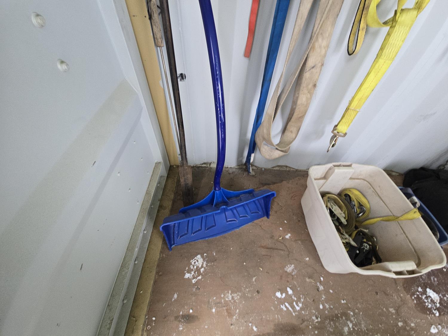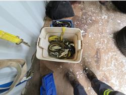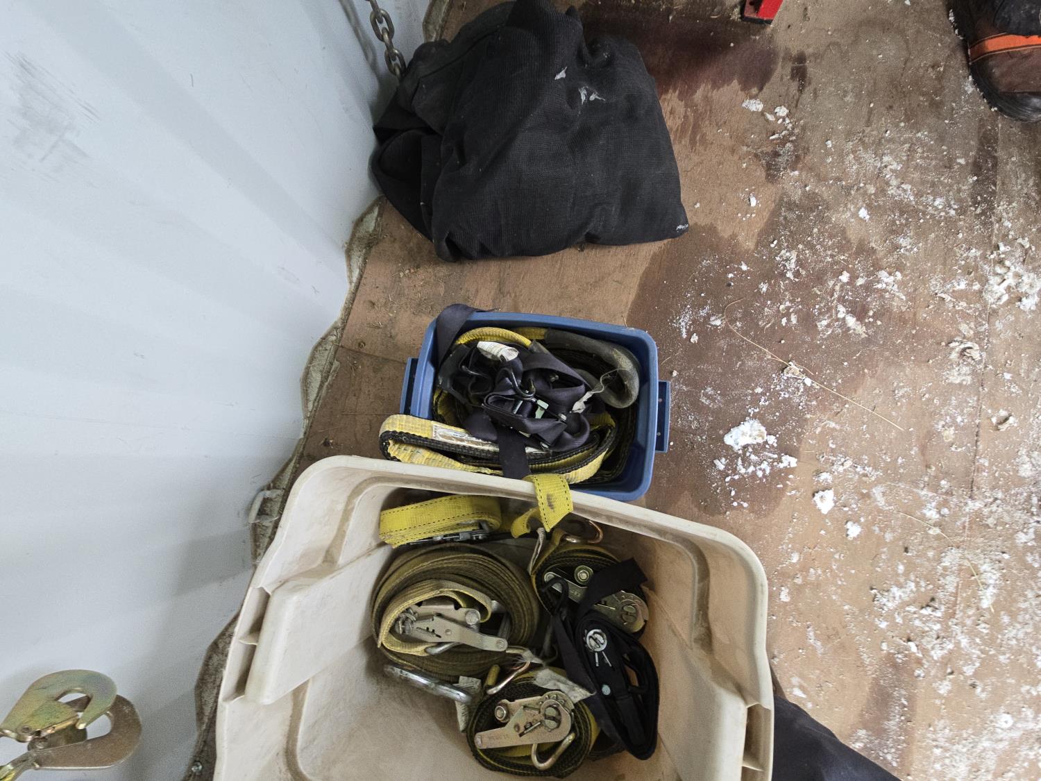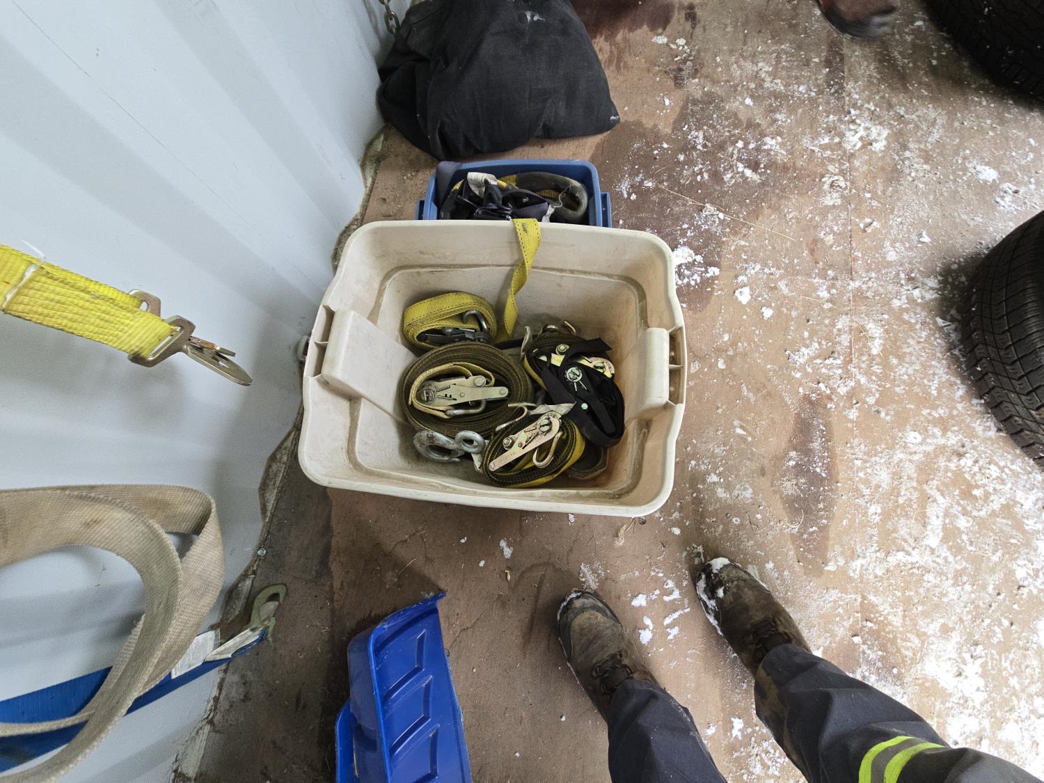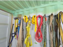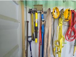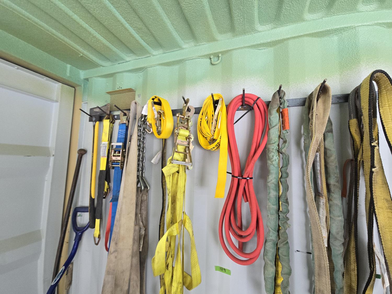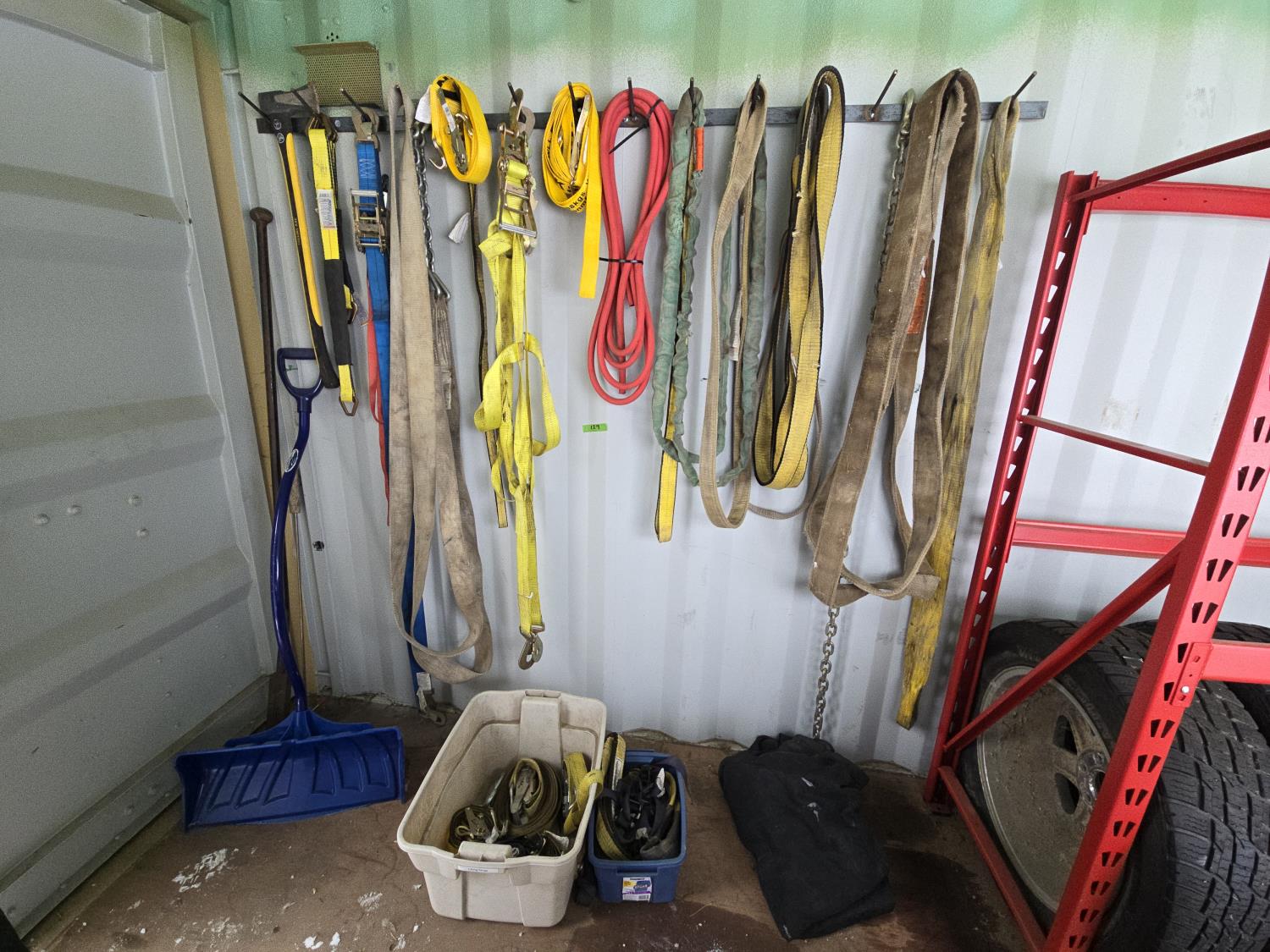 71 Qty of Slings, Ratchet Straps, Chain, Axe, Pinch Bar, Snow Shovel