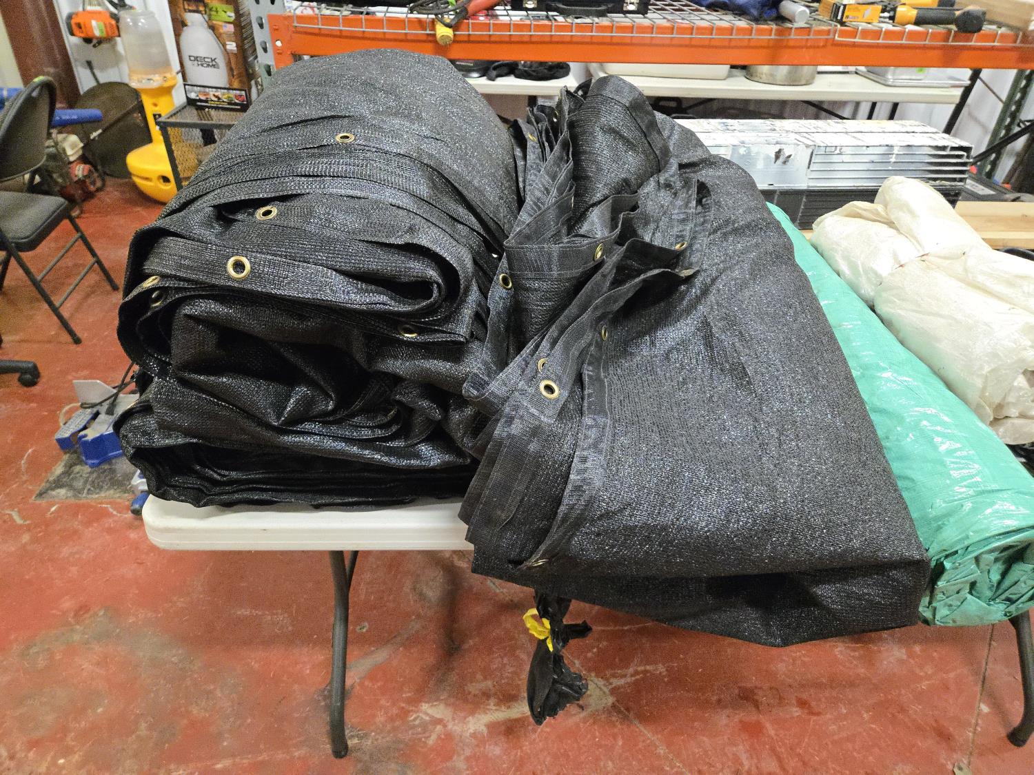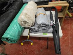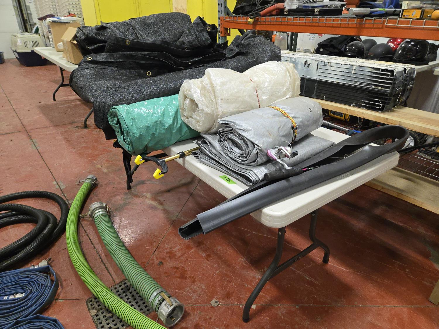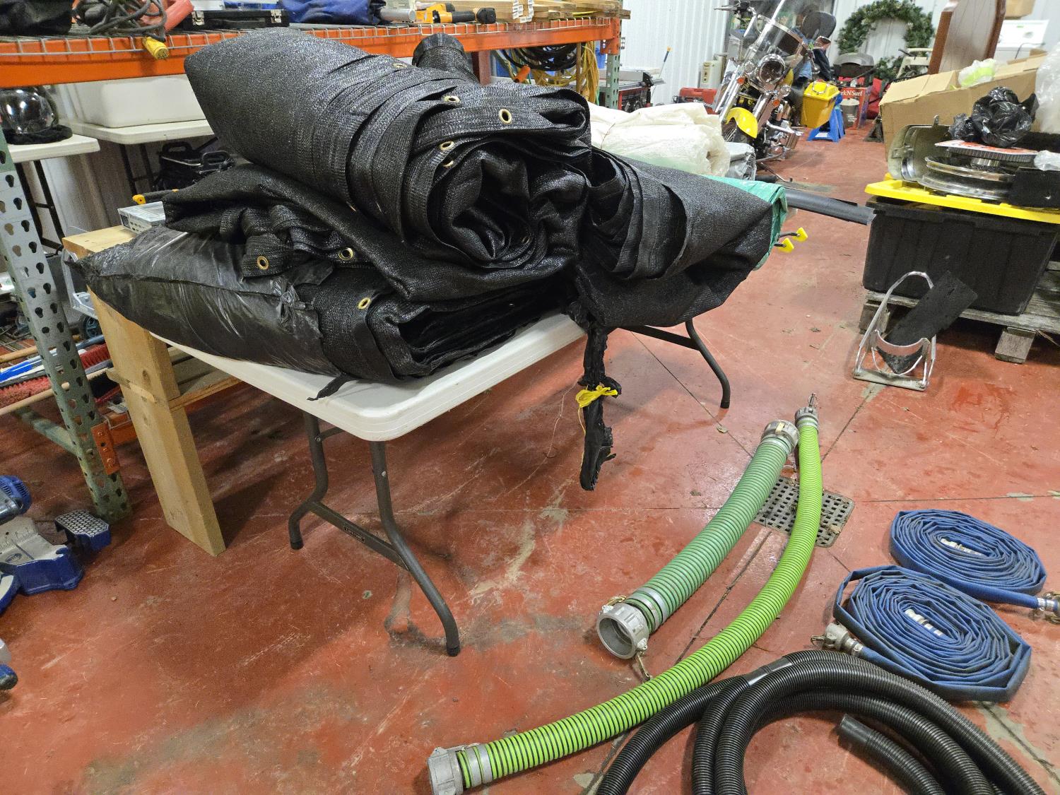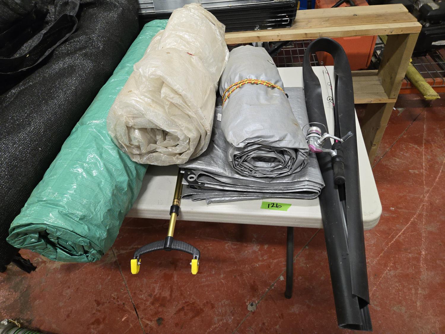 (3) 8 ft X 25 ft wind break tarps, (4) various size poly tarps, ice fishing rod, 30 inch X 72 inch poly folding table, qty of suction and discharge water hose