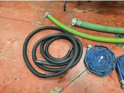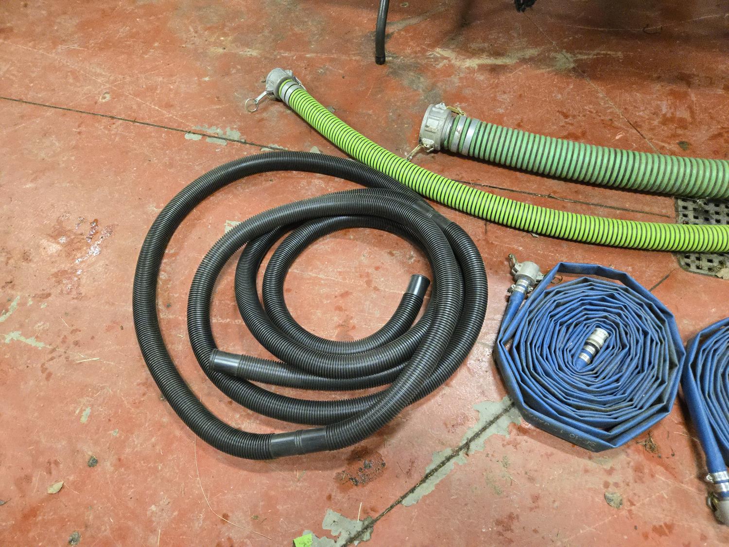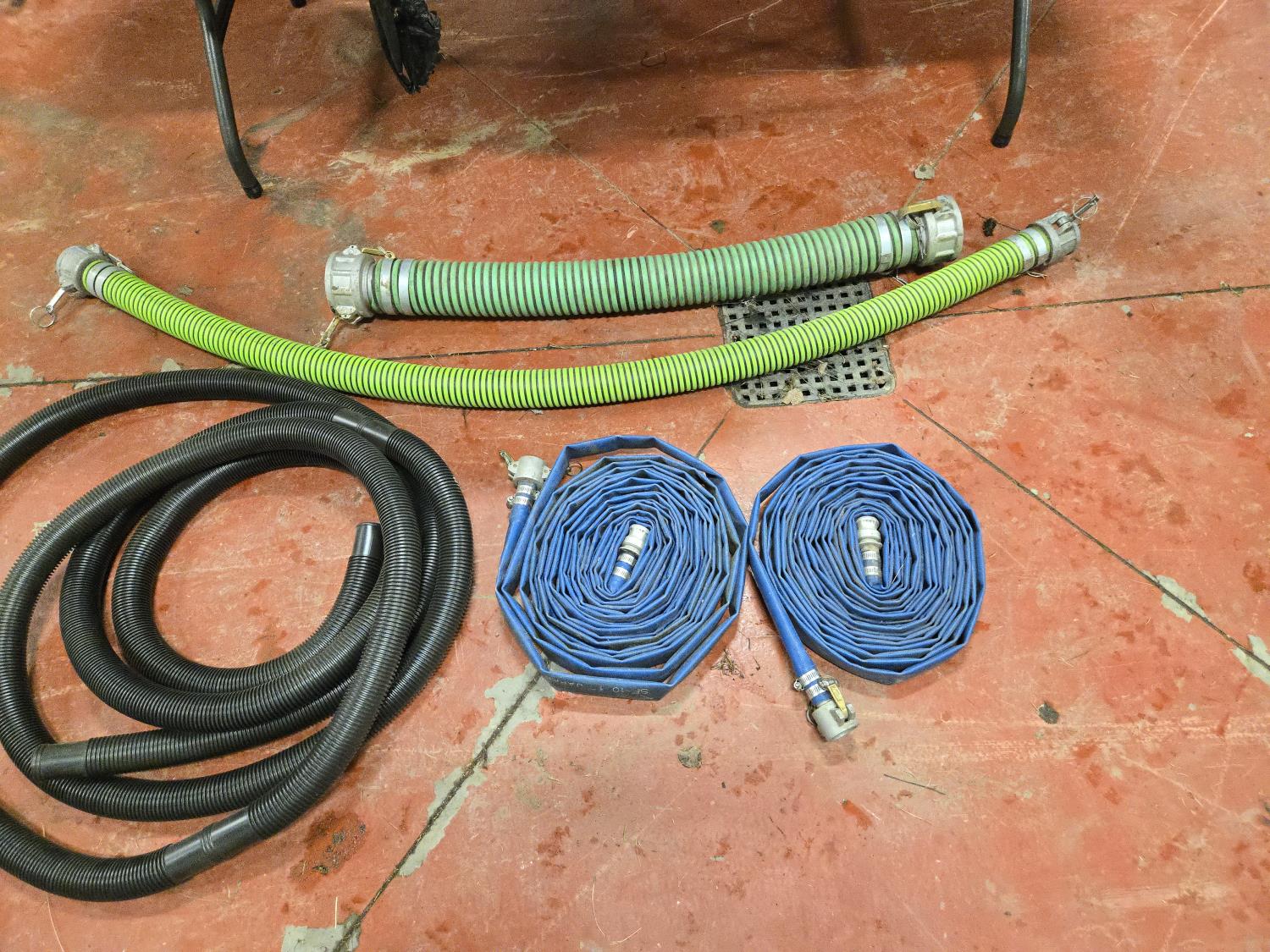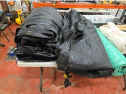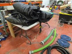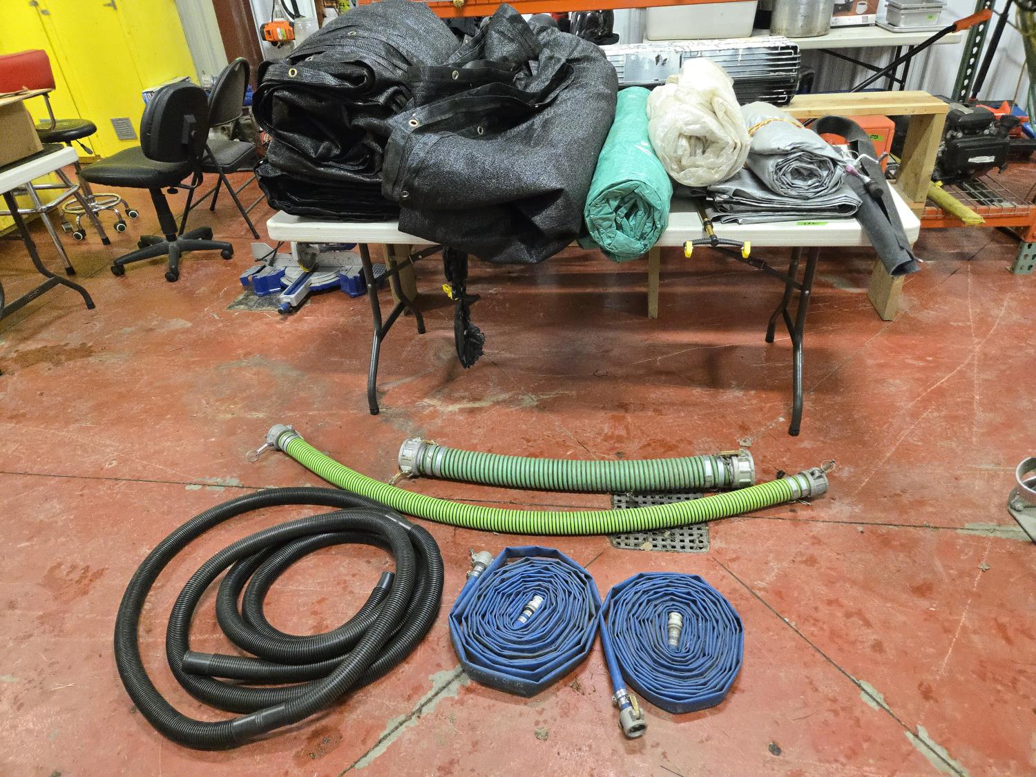 (3) 8 ft X 25 ft wind break tarps, (4) various size poly tarps, ice fishing rod, 30 inch X 72 inch poly folding table, qty of suction and discharge water hose