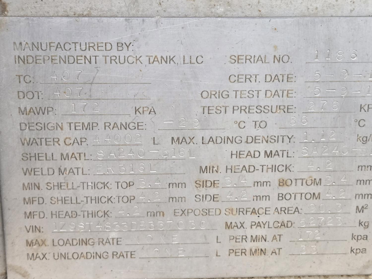 169 2013 Independent Truck Tank 44000 Liter Stainless Steel TRI/A Tanker Trailer