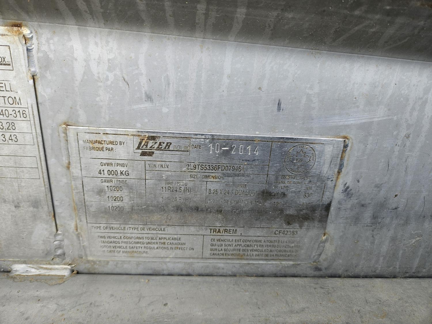 167 2015 Lazer TRI/A Stainless Tanker Trailer