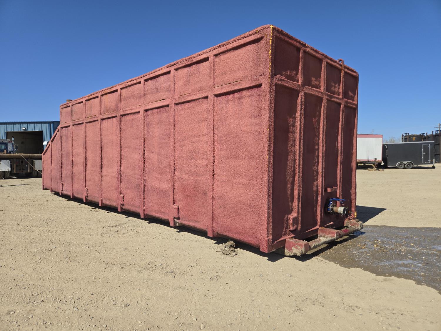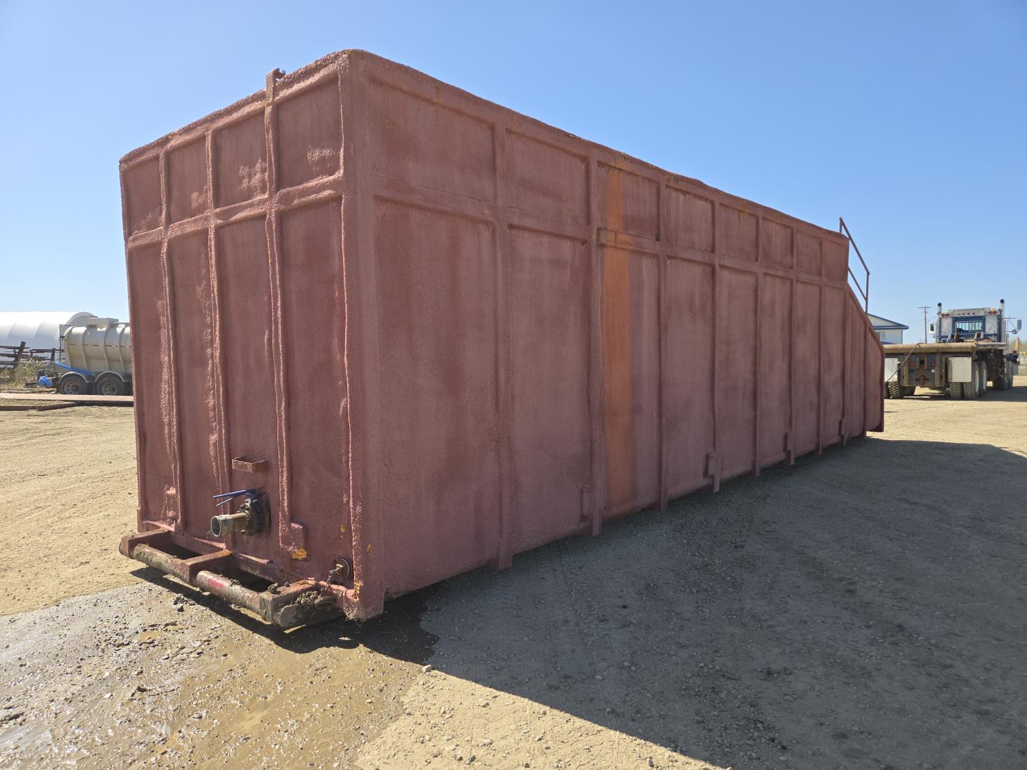 11 ft wide, 38 ft long, 10.5 ft high, propane burners, steam coils, front and back sumps, load line, hatches, (2) 4 inch valves, (1) 3 inch valve, (1) 4 inch valve on sump, (1) 4 inch drain
