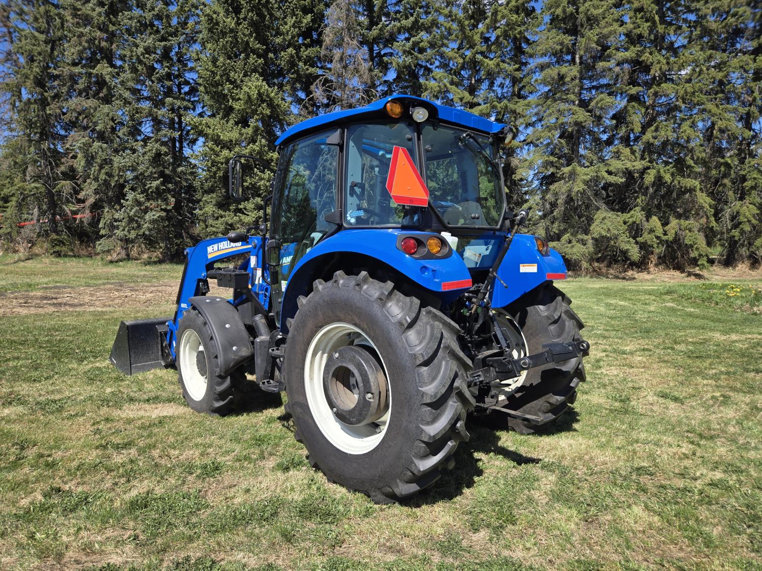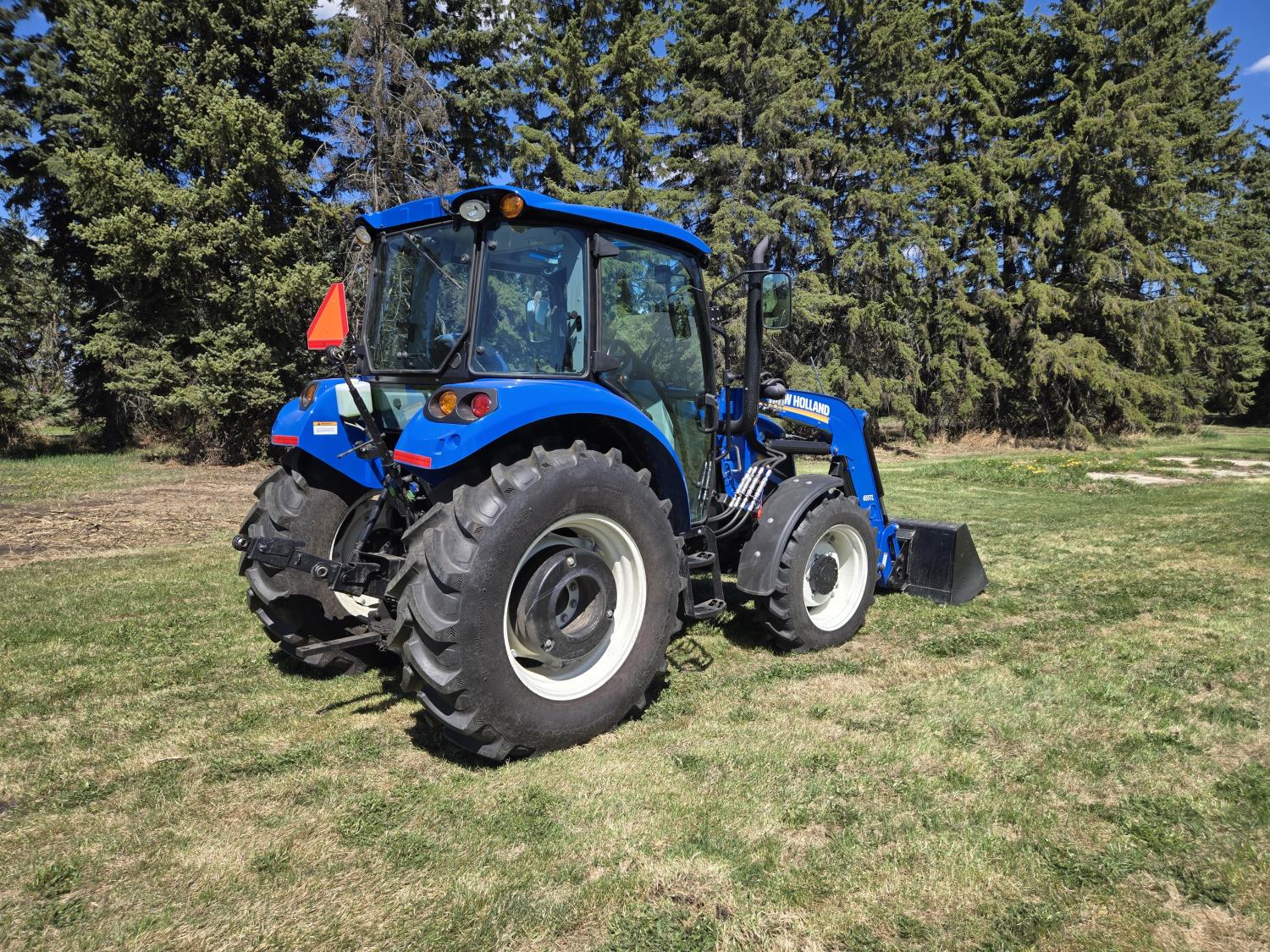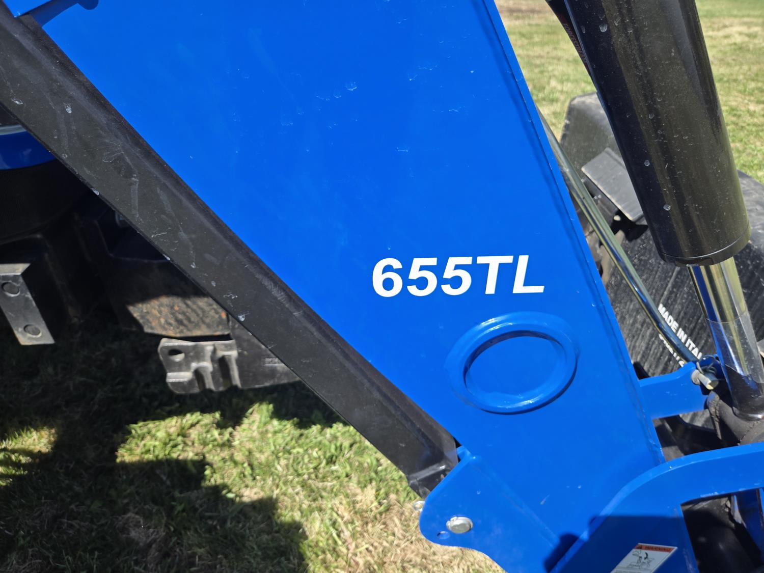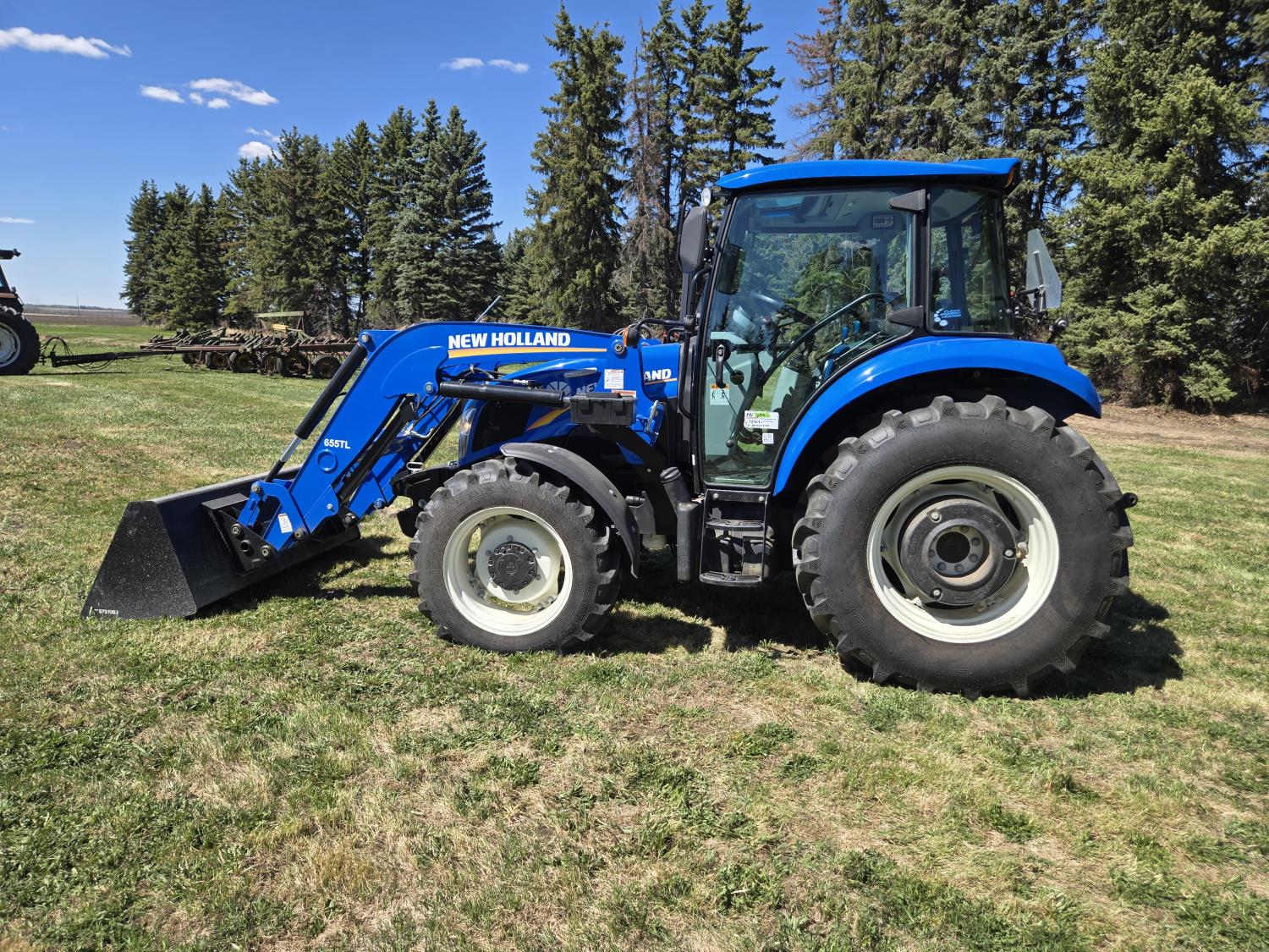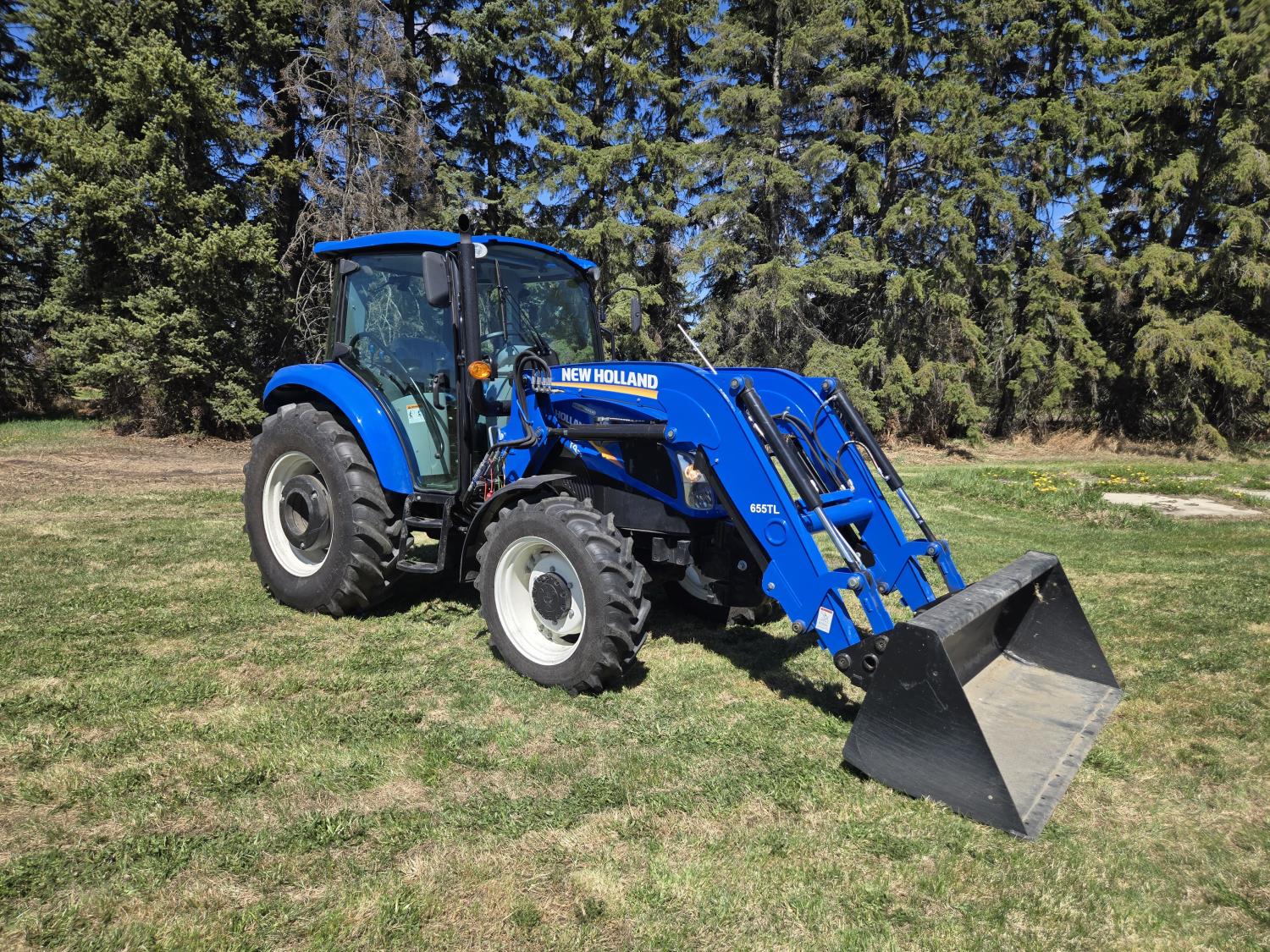 New Holland 655TL loader, Q/A, 72 inch bucket, mid mount hydraulic connection, FPT 3.2 L 4 cylinder 74 HP, diesel engine, 12 speed manual transmission, cab, shuttle shift, rear differential lock, joystick, A/C, radio, buddy seat, front weights, 540 PTO, 3 point hitch, 2 rear hydraulic outlets, rear wheel weights, 280/85R24 front tires, 420/895R30 rear tires, front fenders, front weights