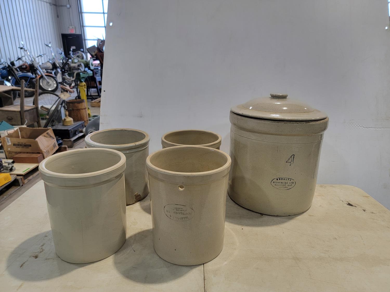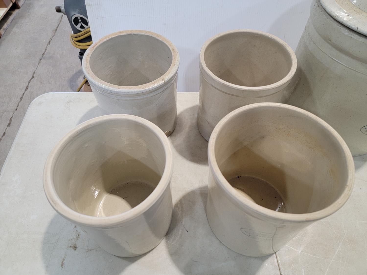 3892 (4) Small Ceramic Crocks and (1) 4 Gallon Crock with Lid