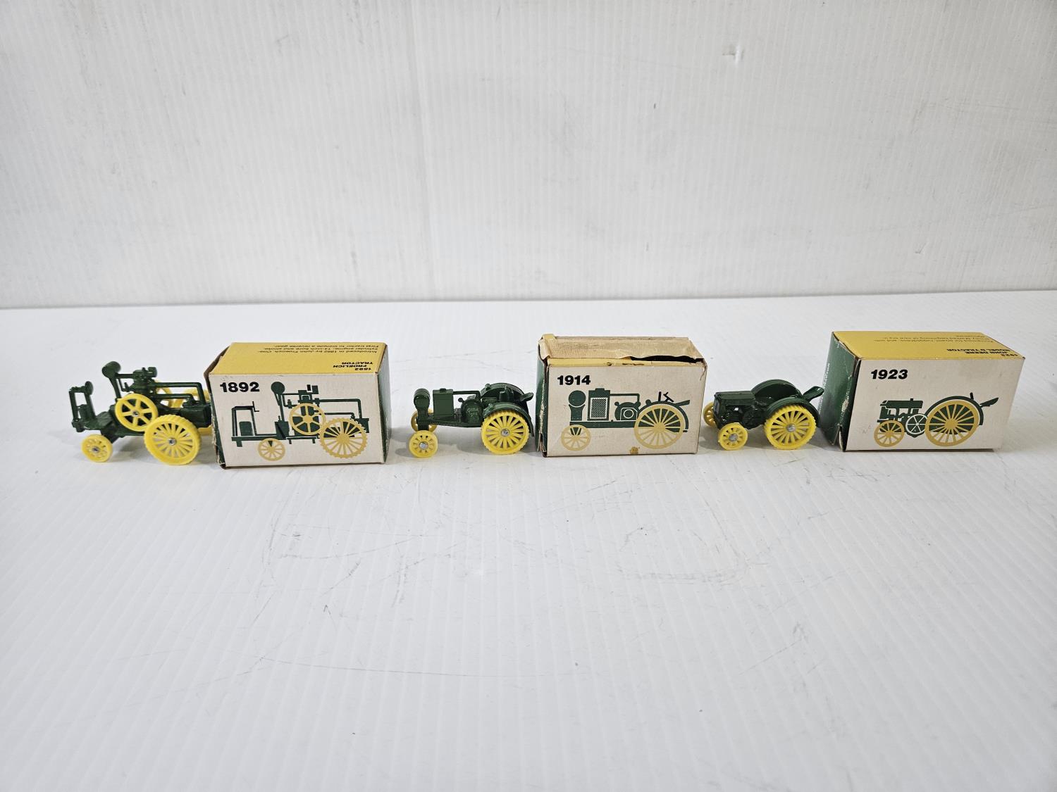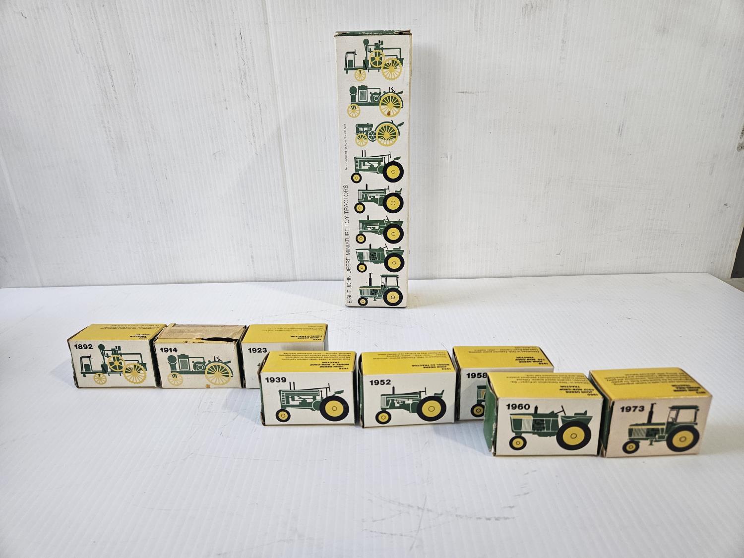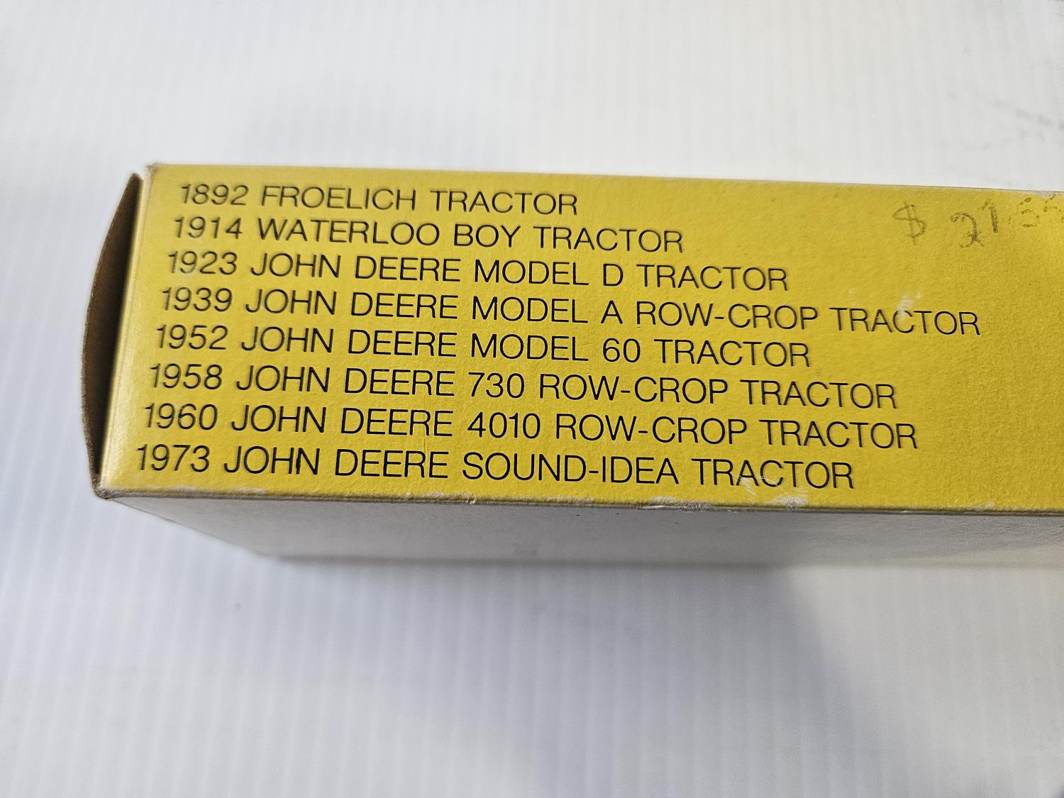 1892 Froelich, 1914 Waterloo Boy, 1923 Model D, 1939 Model a Row Crop, 1952 Model 60, 1958 730 Row Crop, 1960 4010 Row Crop, 1973 Sound Idea Tractor series, original boxes