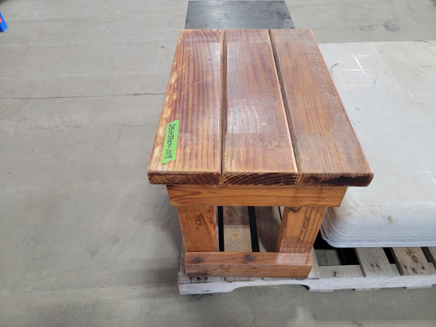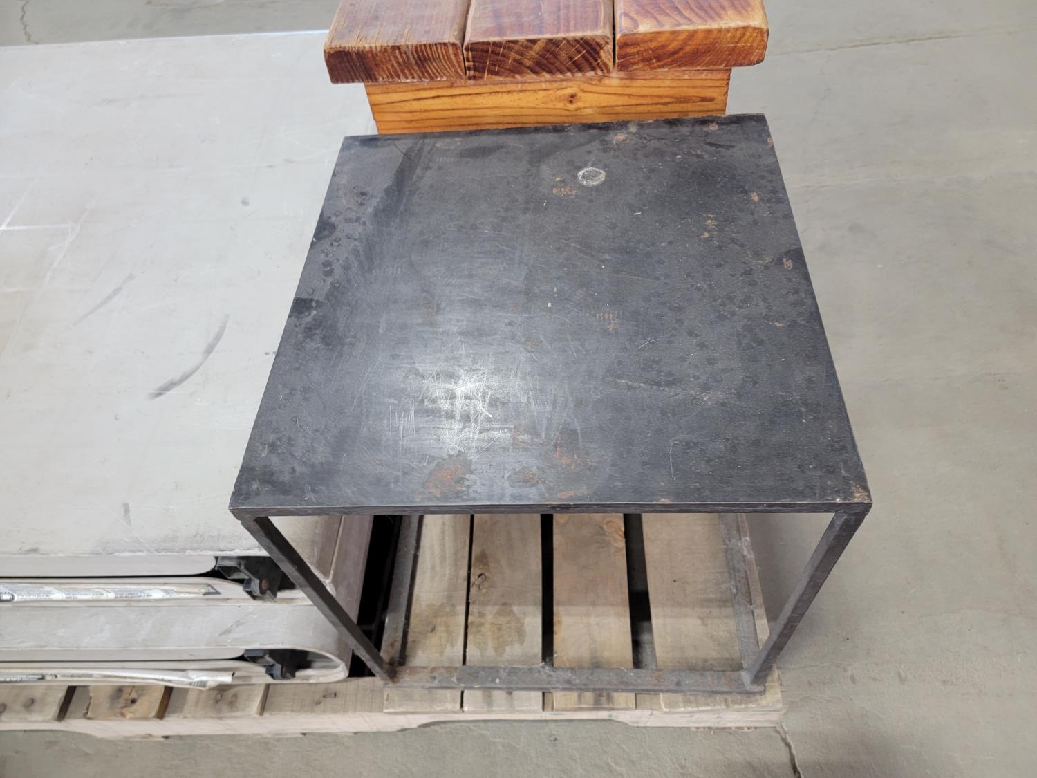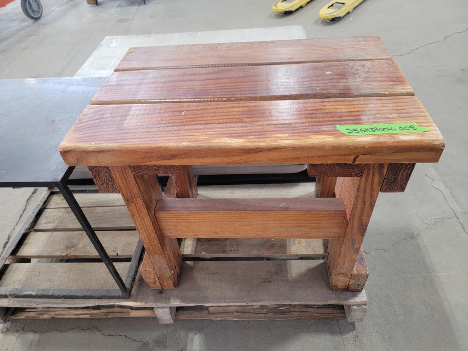 Wooden table 23 inch w x 16 inch d x 19-1/2 inch h, metal table 15-3/4 inch x 15-3/4 inch x 16-1/2 inch h