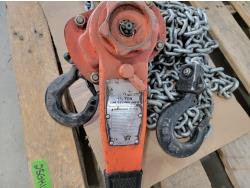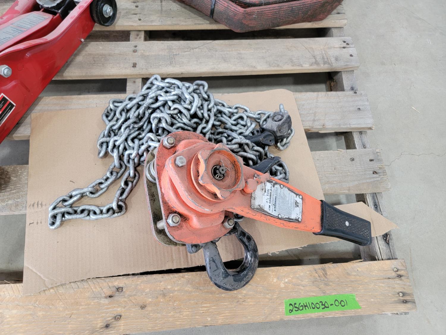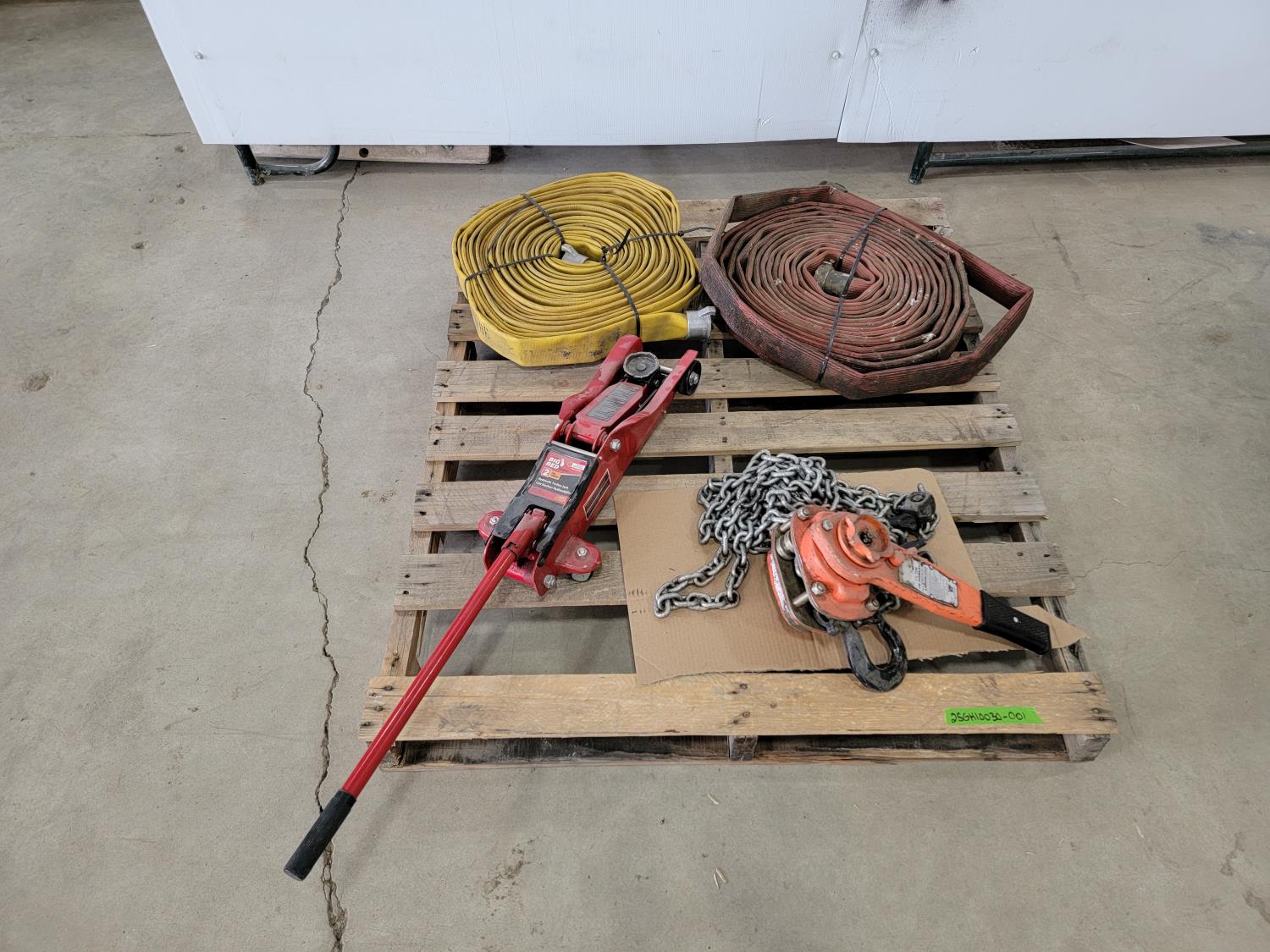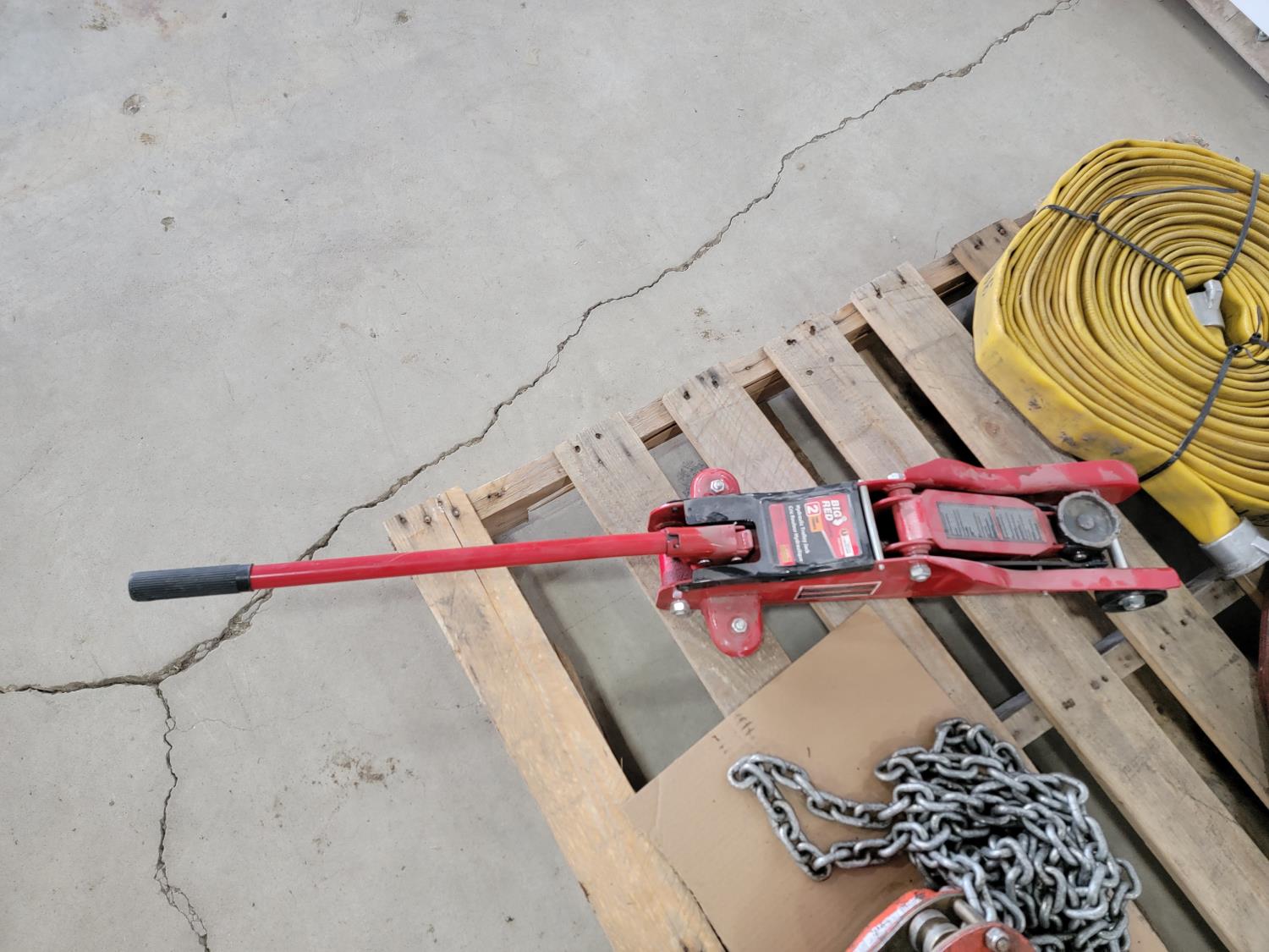 1359 Big Red 2 Ton Floor Jack, 1-1/2 Ton Chain Hoist and (2) 2 Inch Hoses