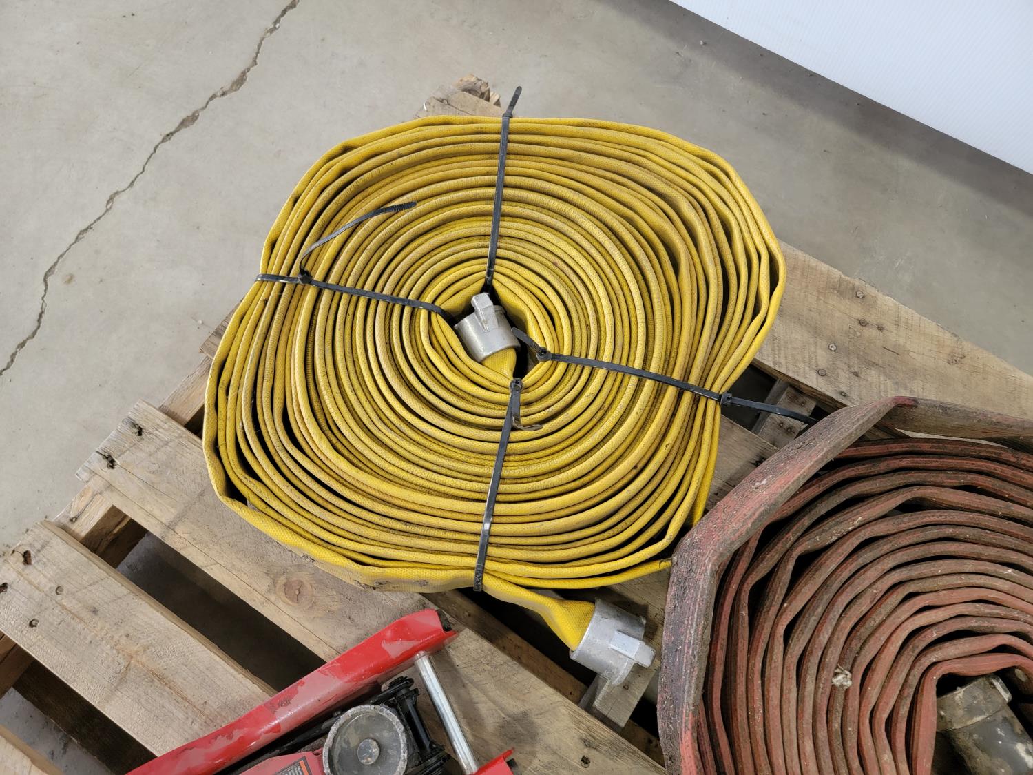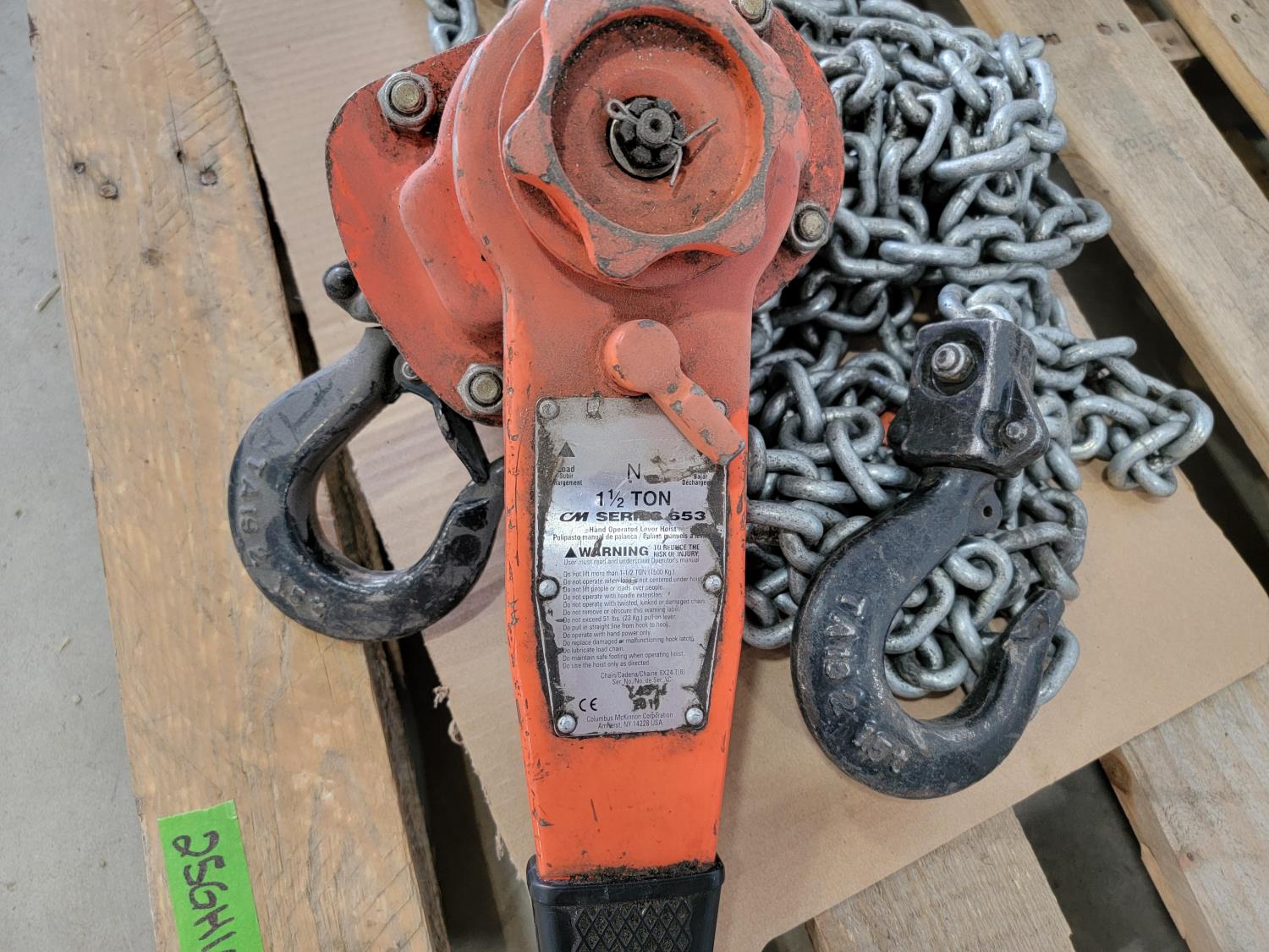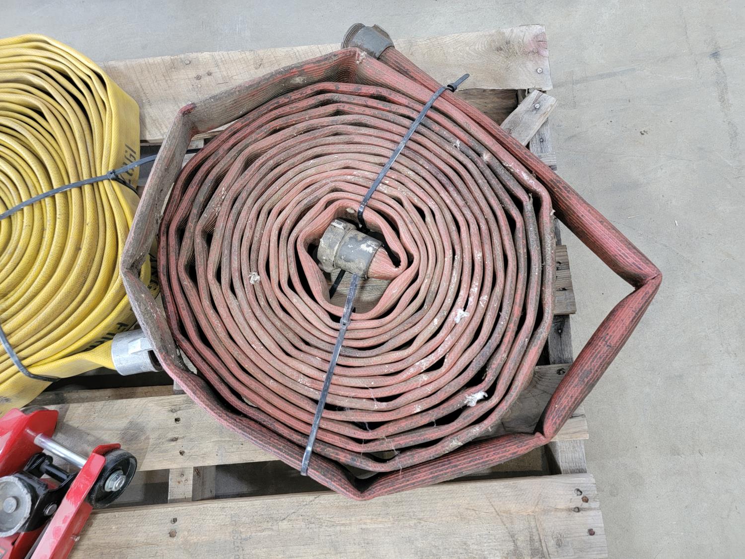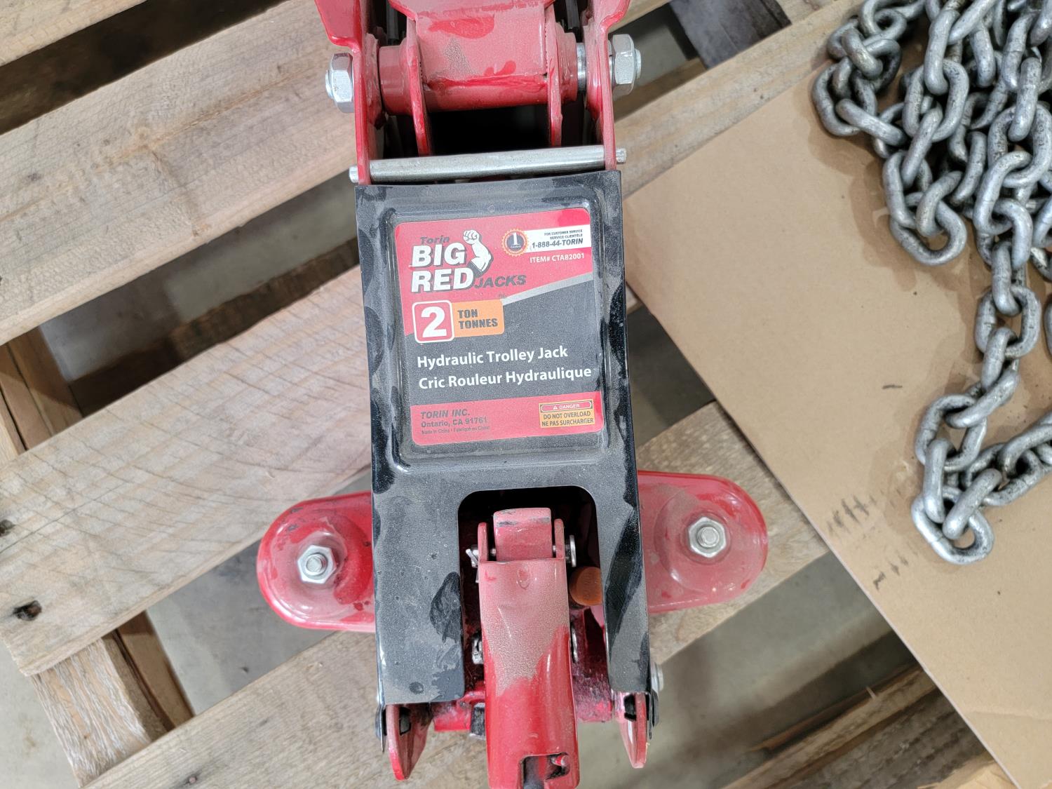 1359 Big Red 2 Ton Floor Jack, 1-1/2 Ton Chain Hoist and (2) 2 Inch Hoses