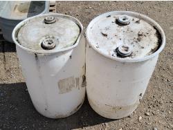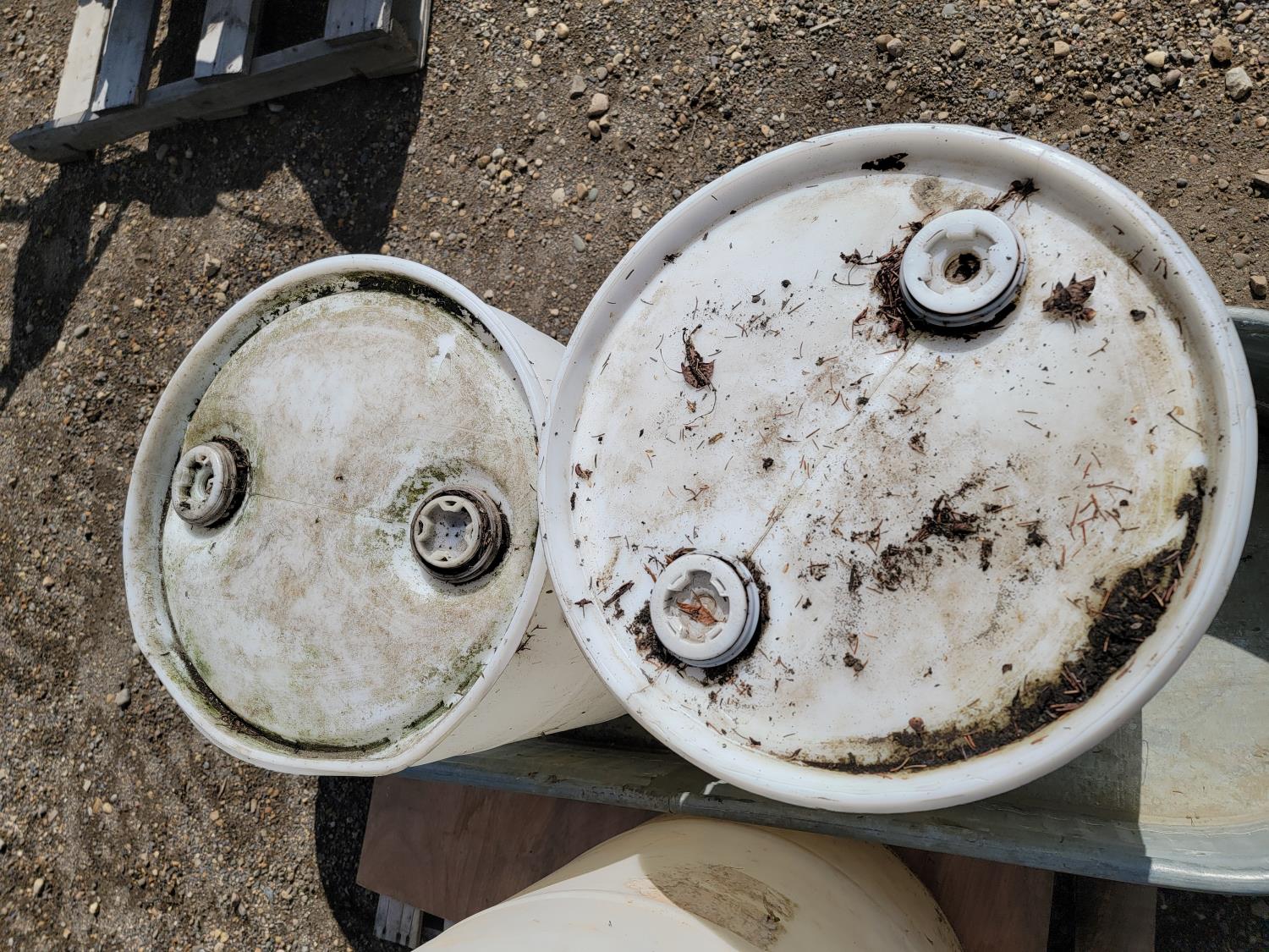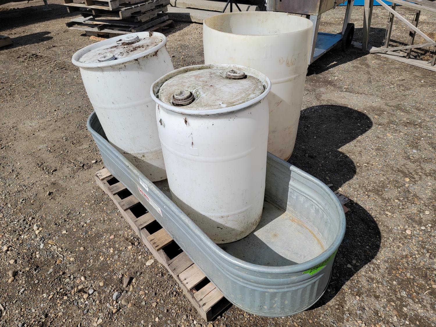 1629 Large Galvanized Tank and (3) Poly Barrels