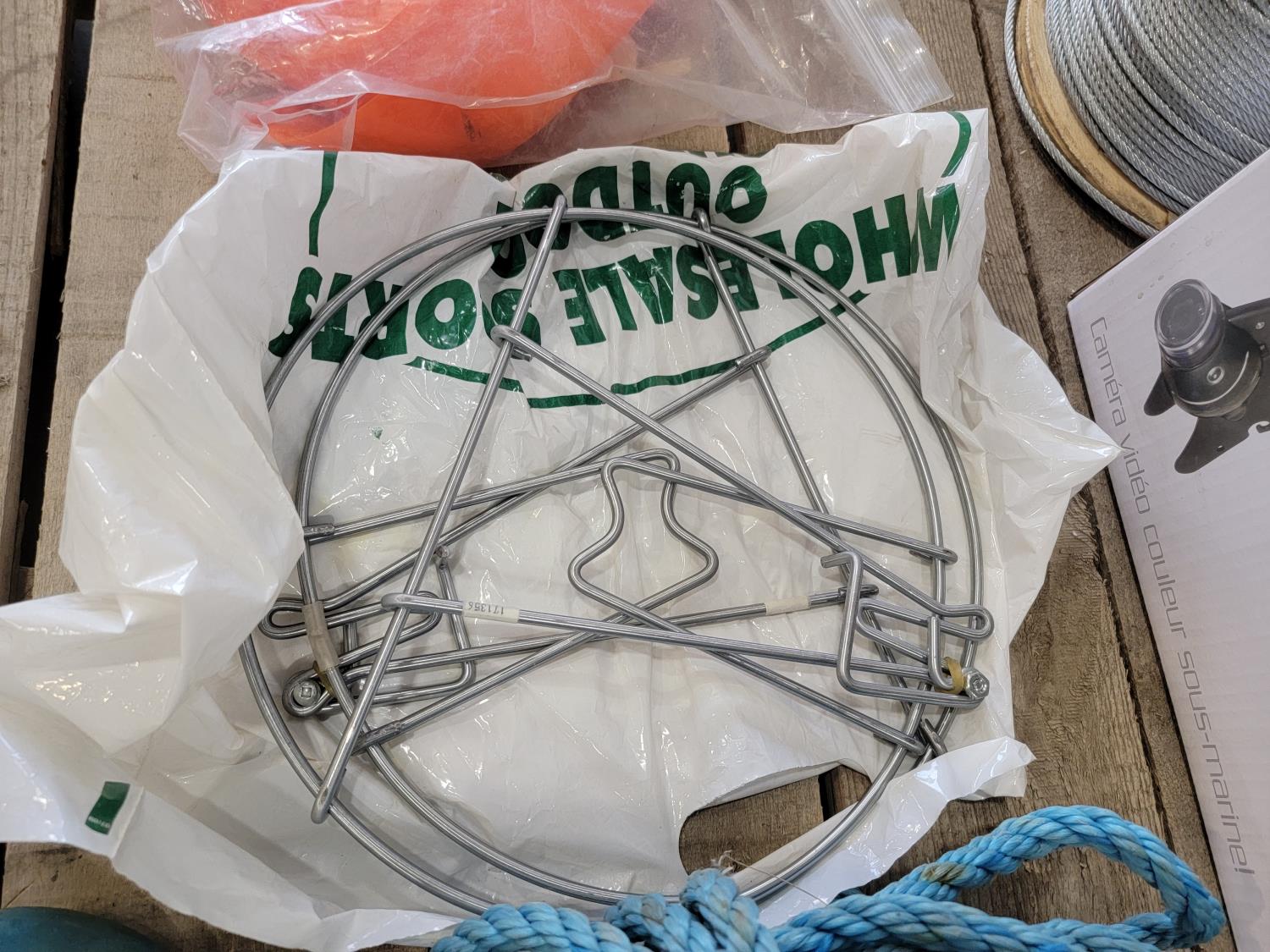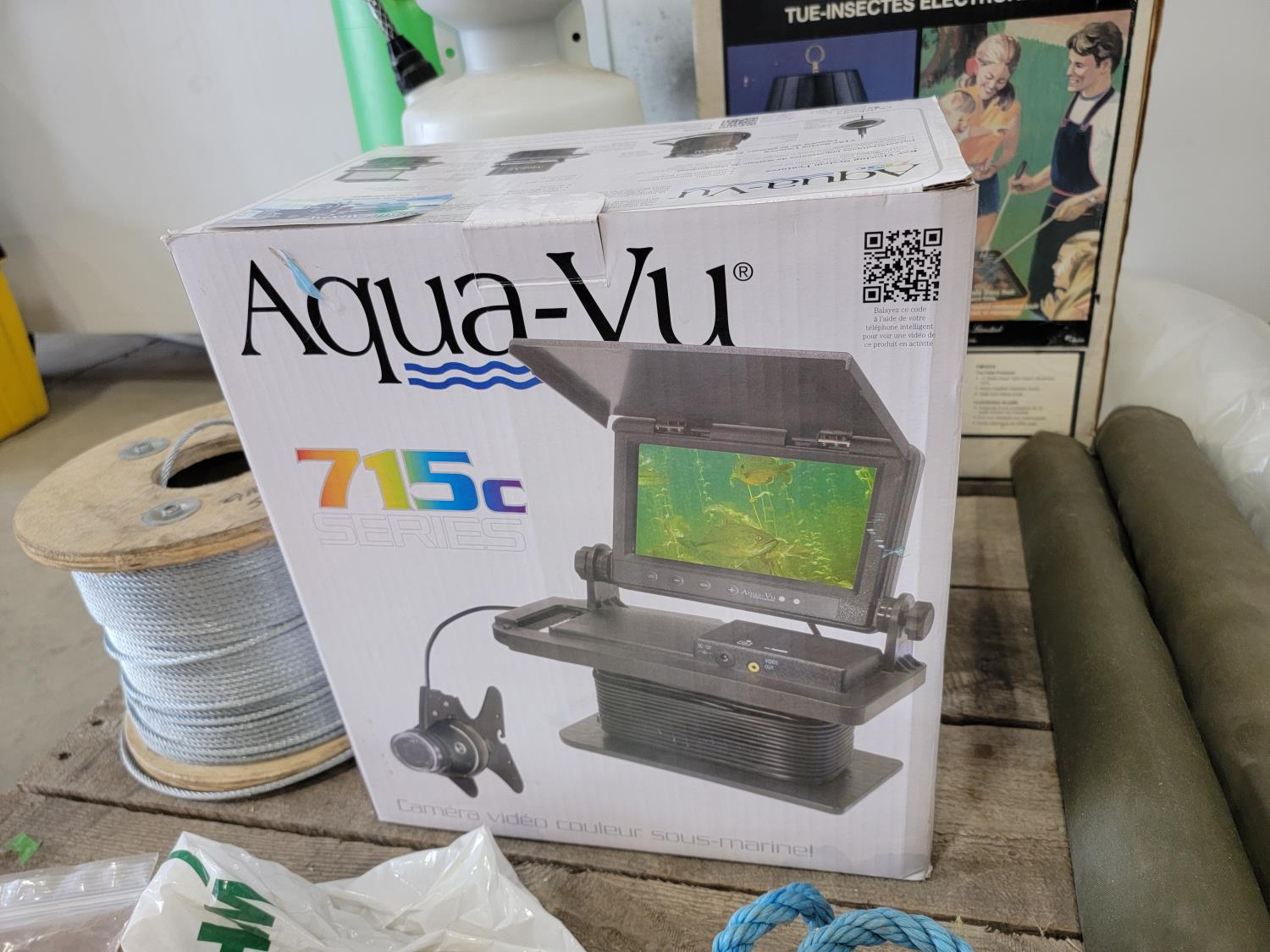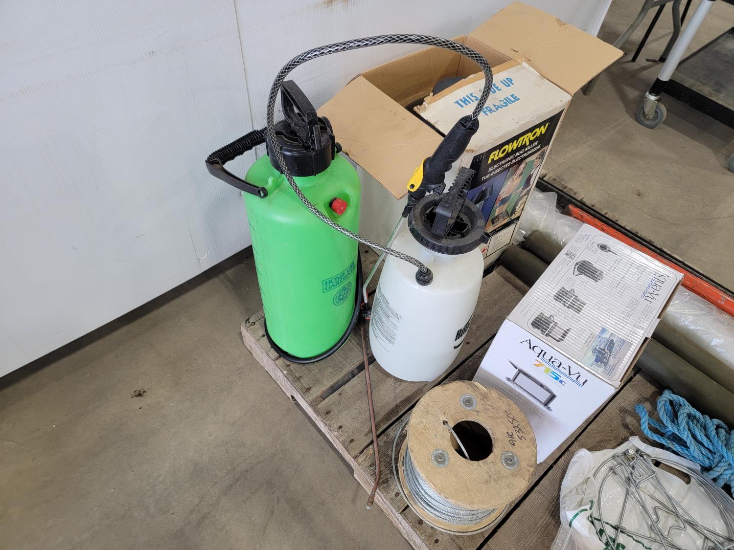 Aqua-Vu fish camera, electronic bug killer, (2) garden sprayers, Jackall, 15 lb anchor, cable wire