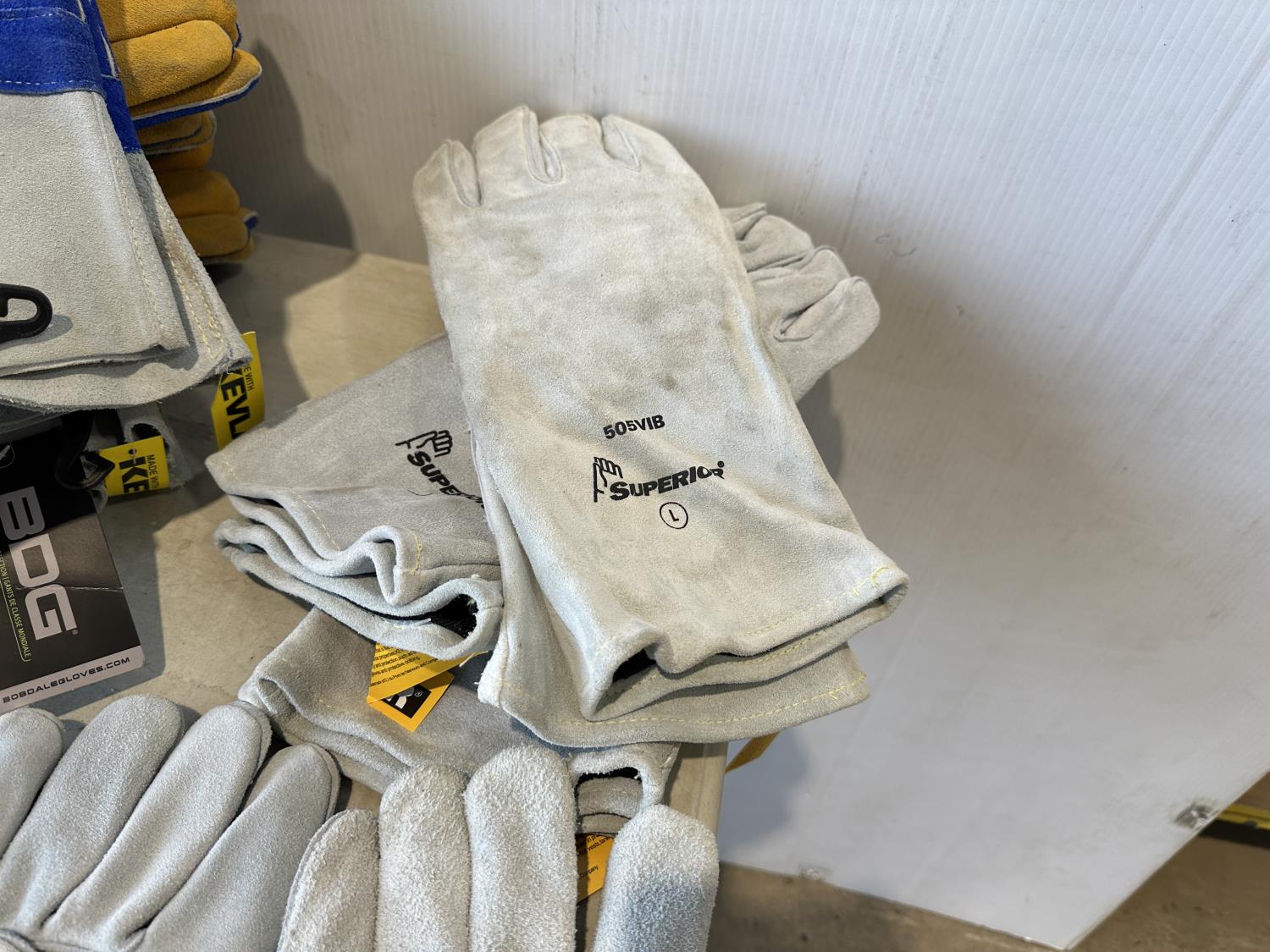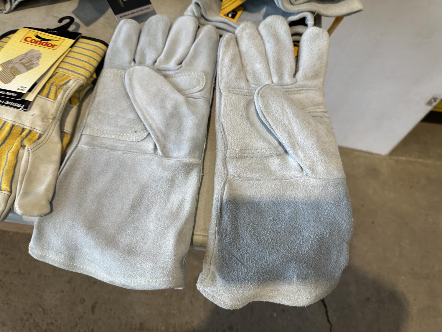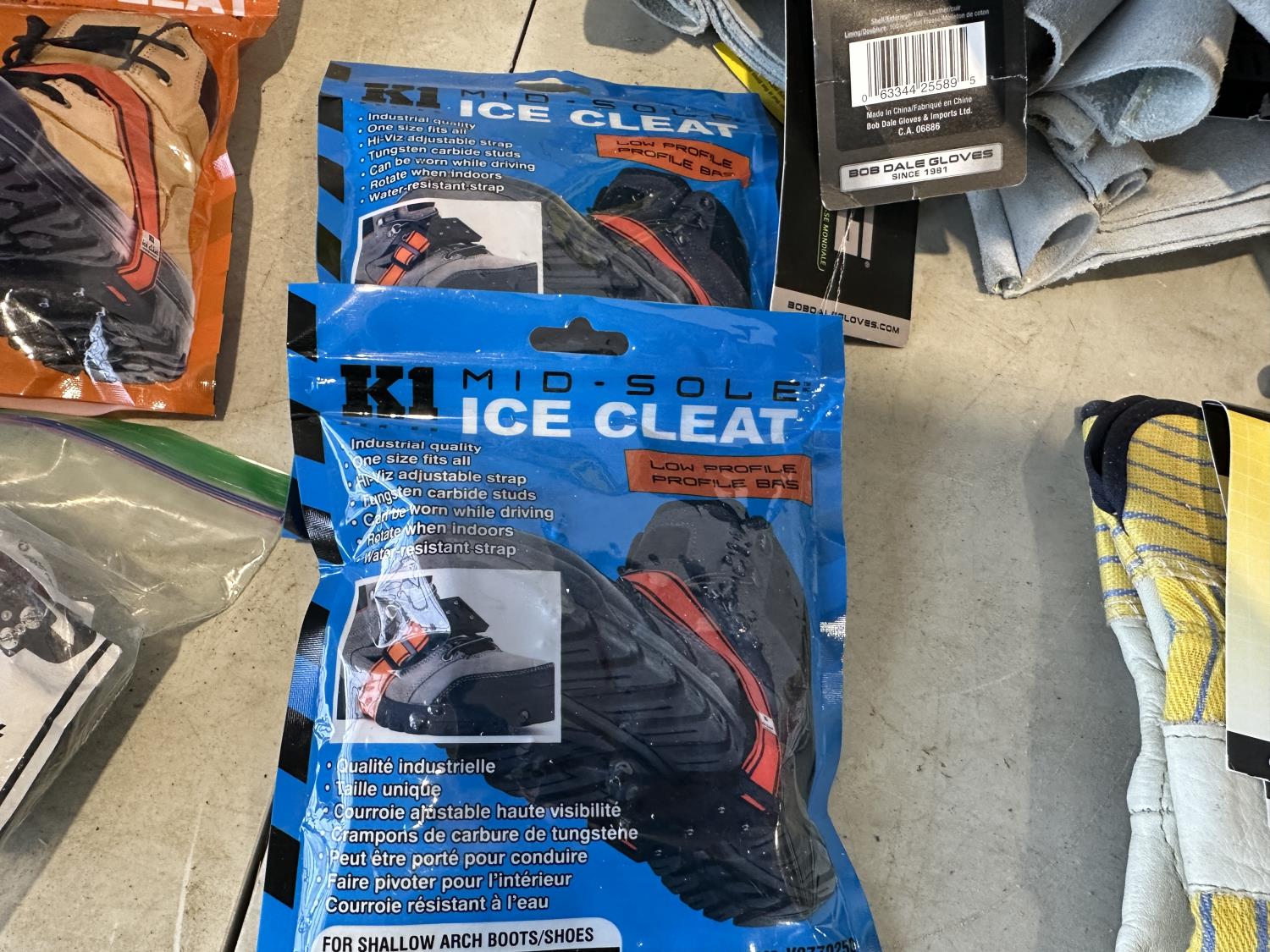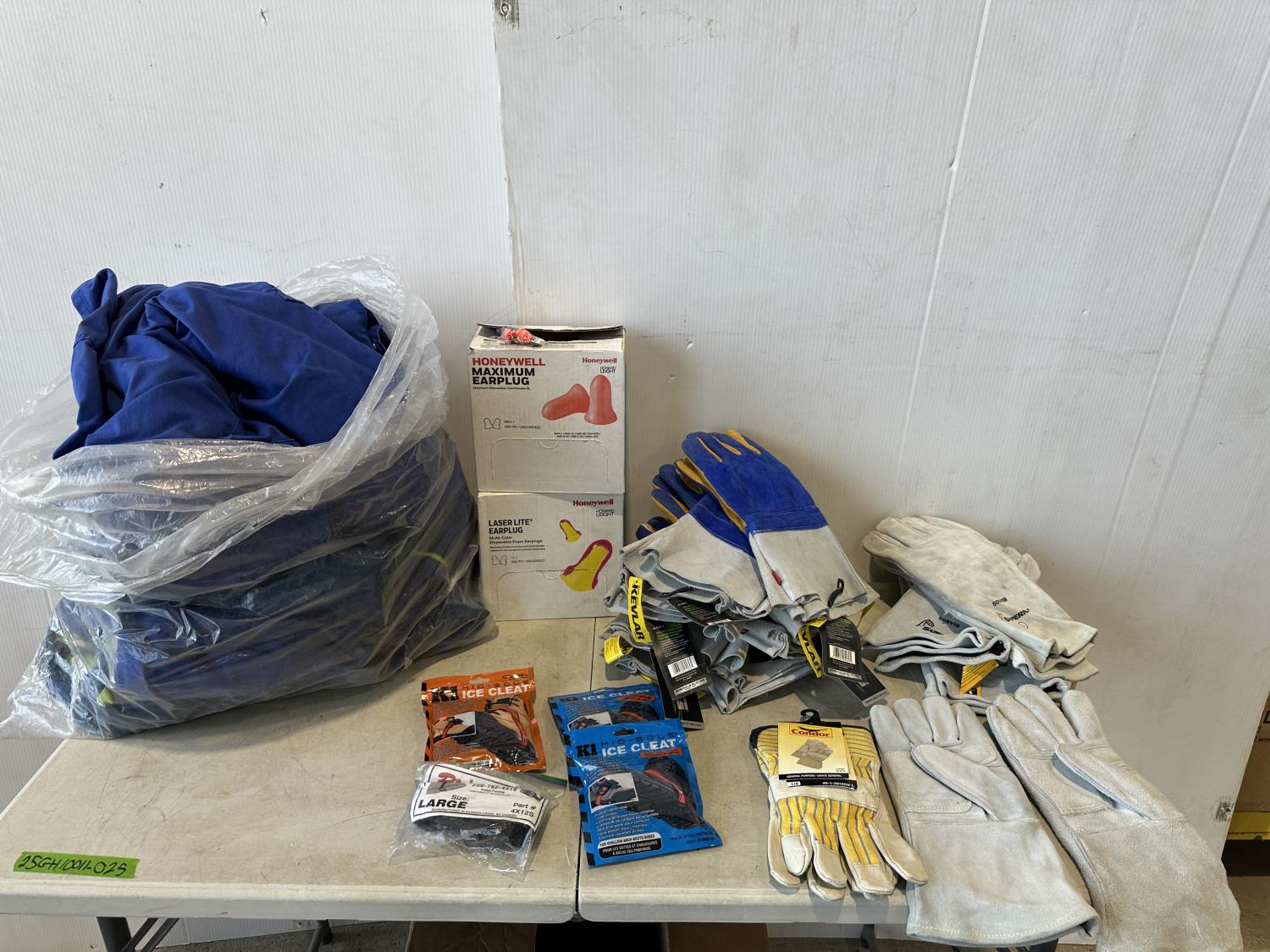 Ice cleats, ear plugs, (8) pairs of BDG leather welding gloves, (3) pairs size large Superior Kevlar gloves, Condor size Large work gloves, (6±) pairs of coveralls, insulated bibs