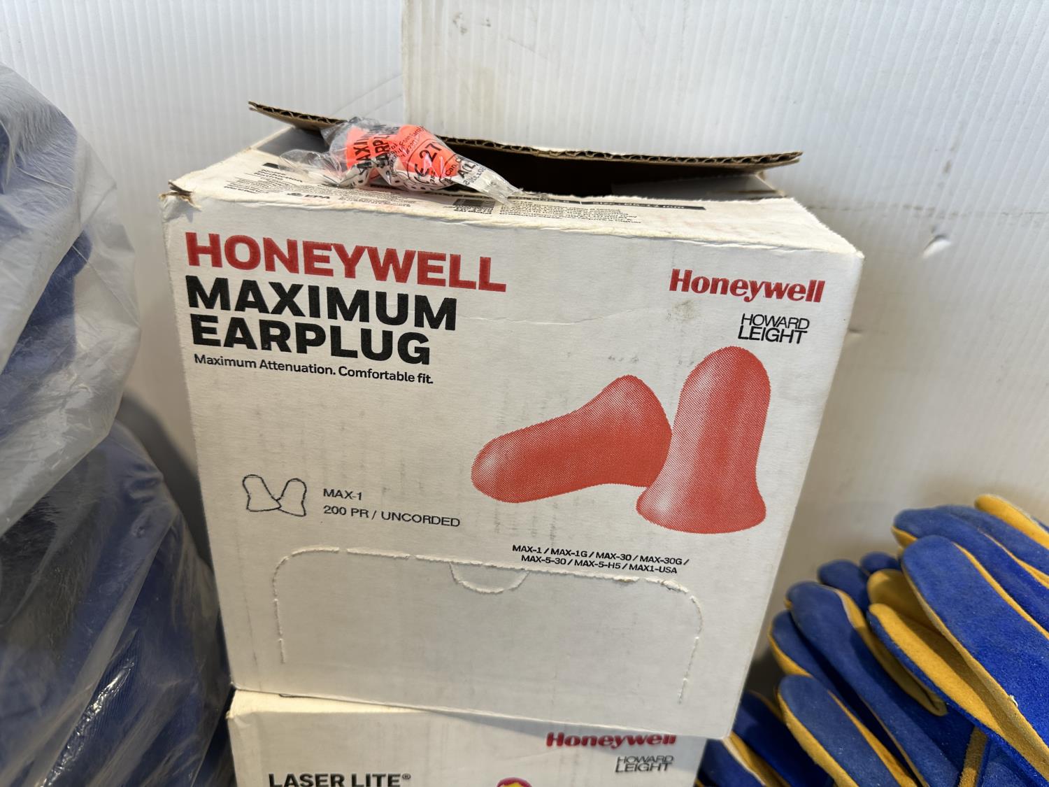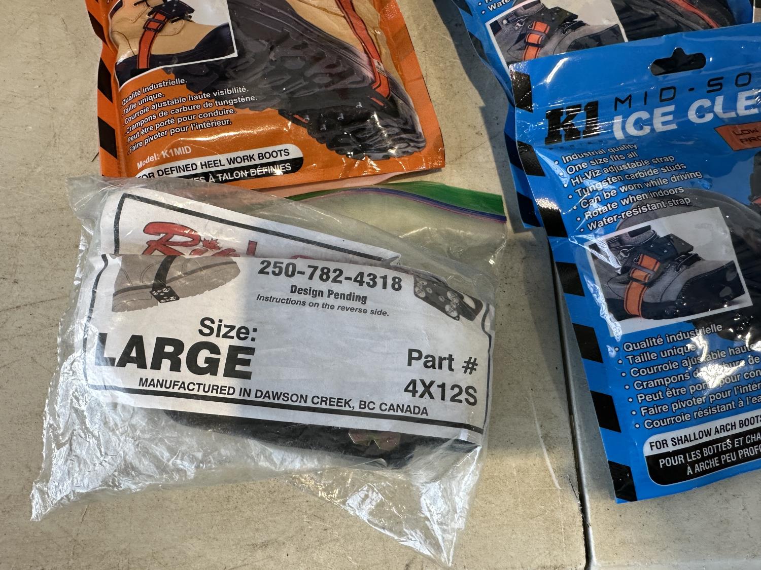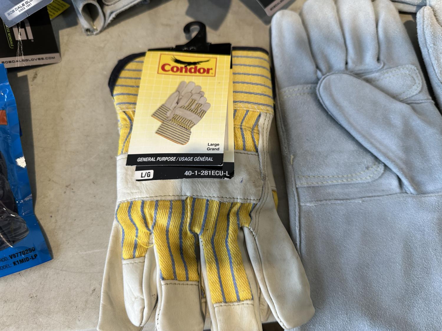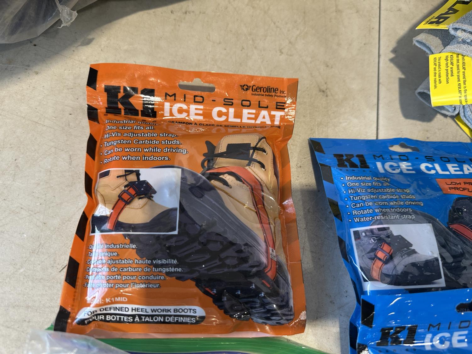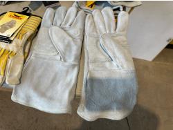 Ice cleats, ear plugs, (8) pairs of BDG leather welding gloves, (3) pairs size large Superior Kevlar gloves, Condor size Large work gloves, (6±) pairs of coveralls, insulated bibs