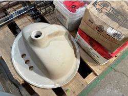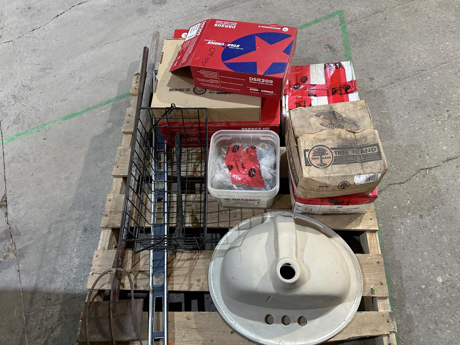 Motorola satellite boxes, porcelain sink, nails, hand tools