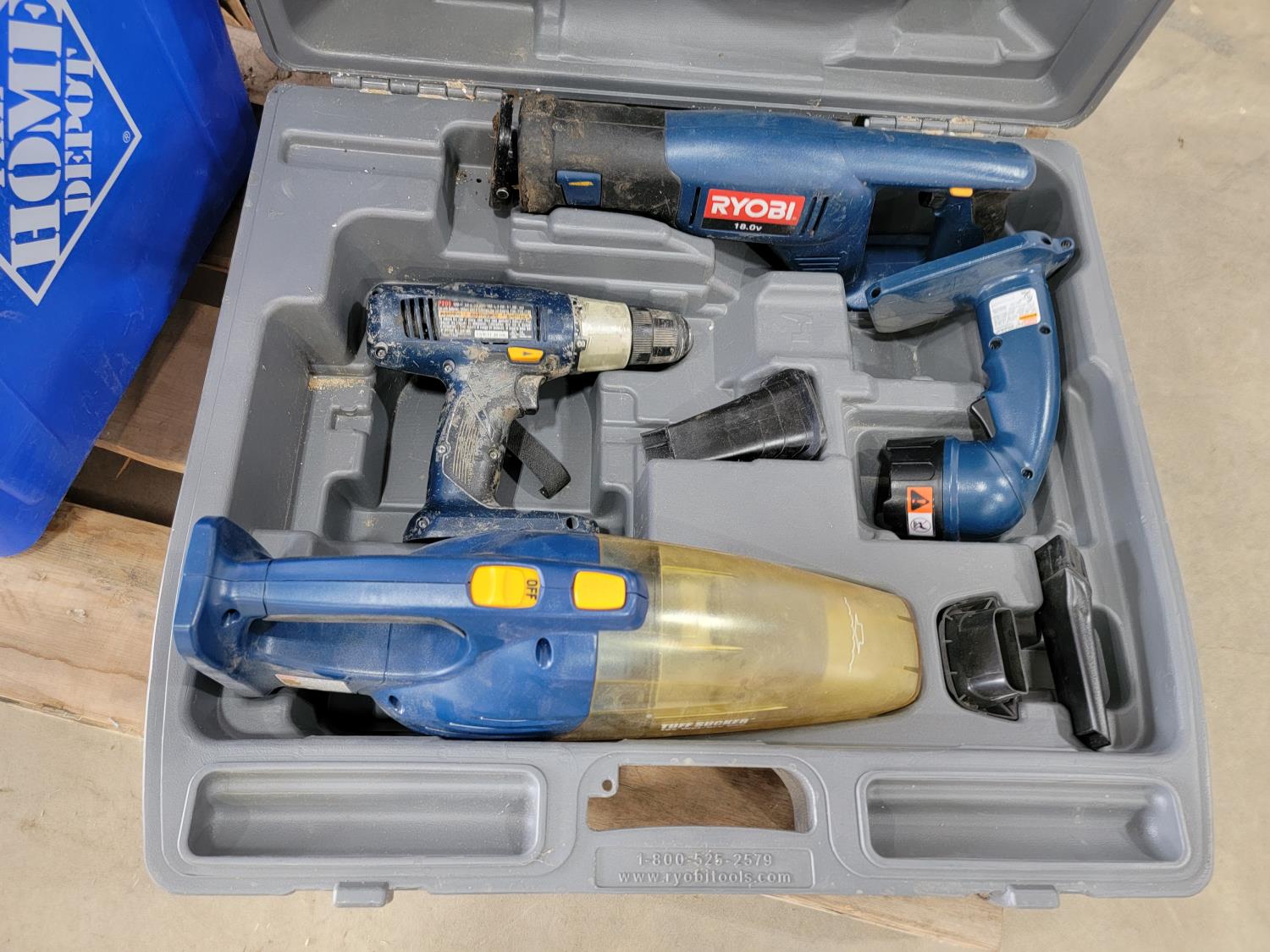 Work lights, Ryobi 18V tools (no batteries or charger), (8) 2 ton jack stands