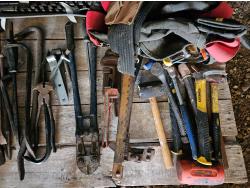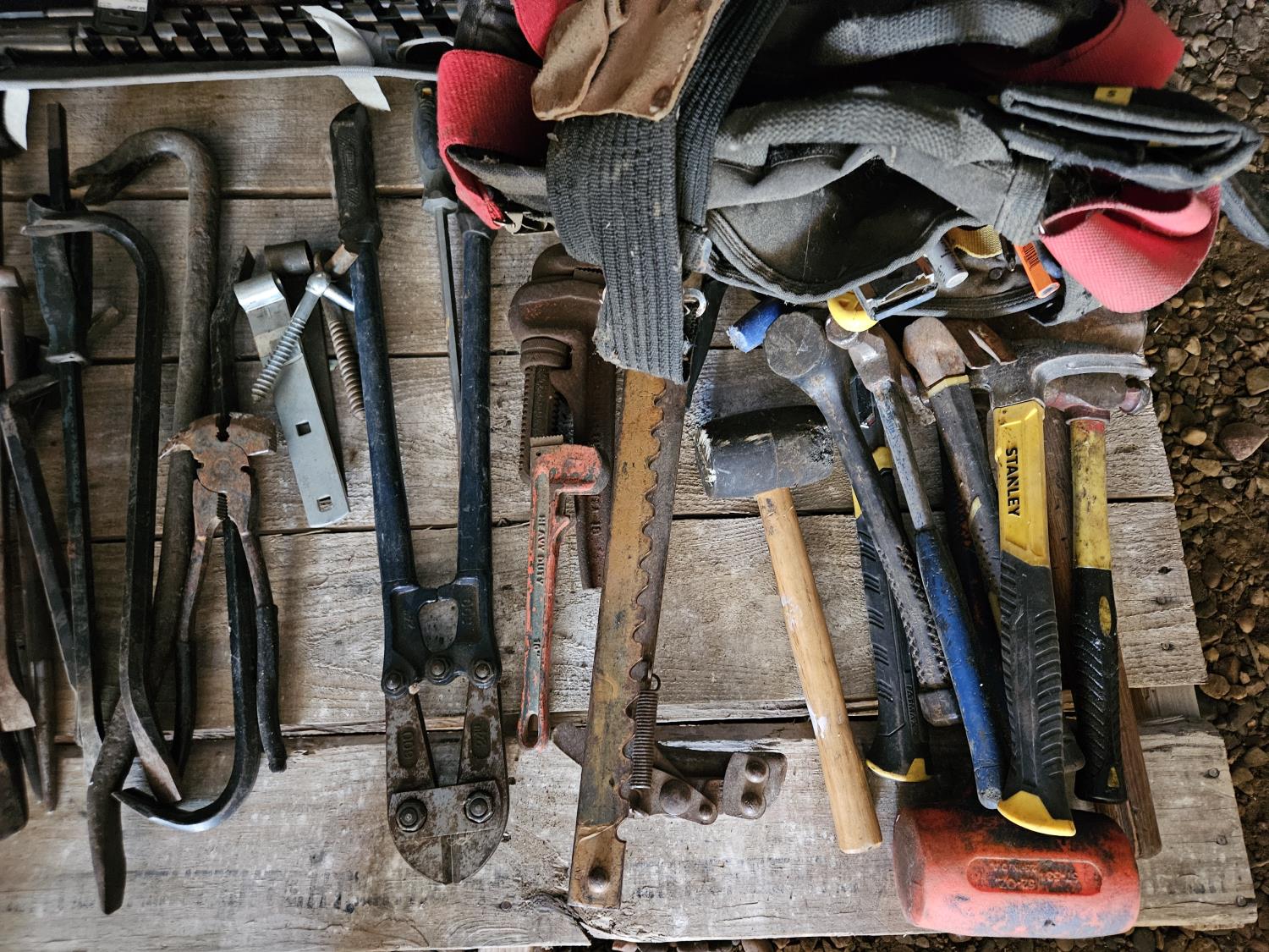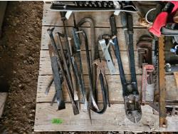 pry bars, hammers, drill bits, hi tension wire, tool bags
