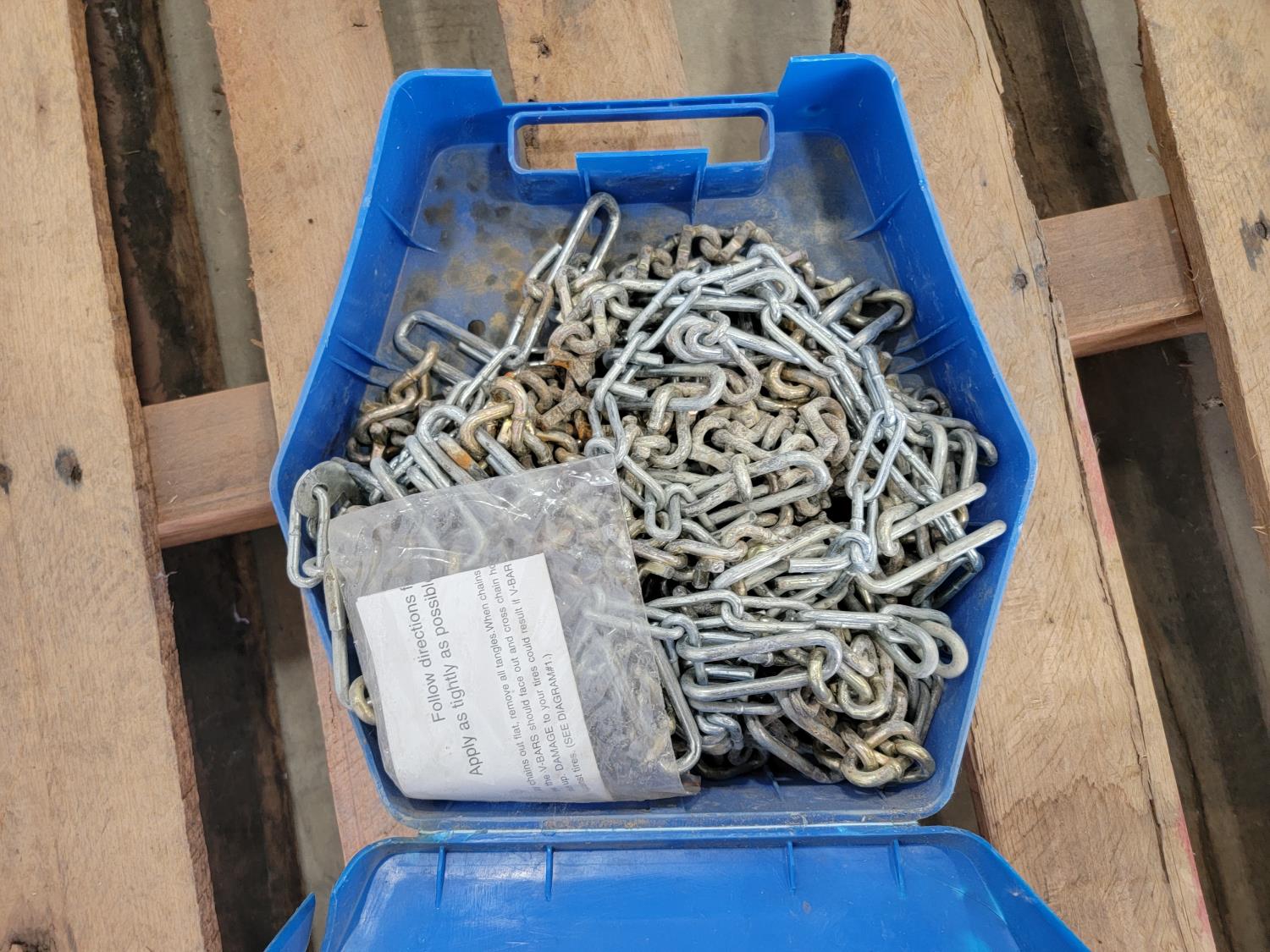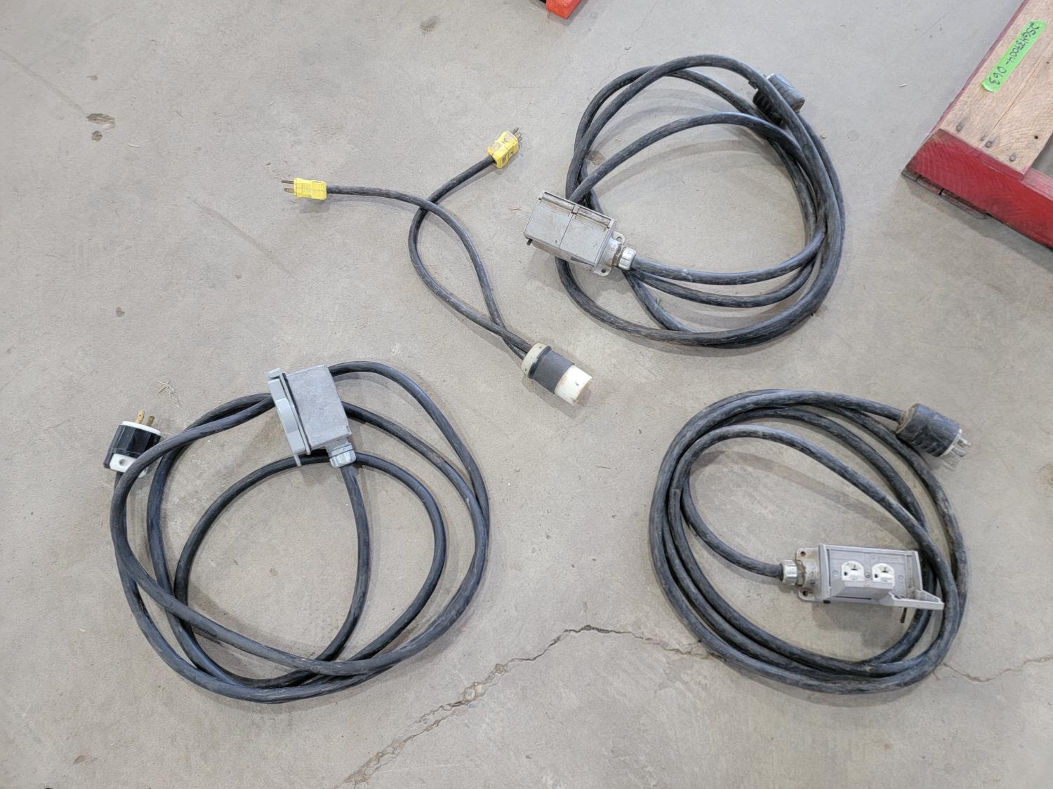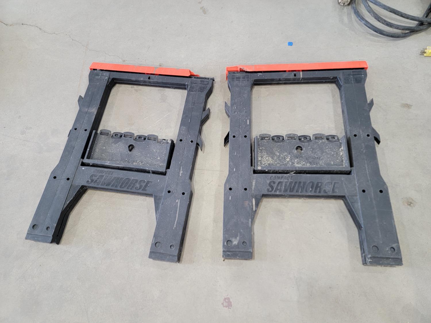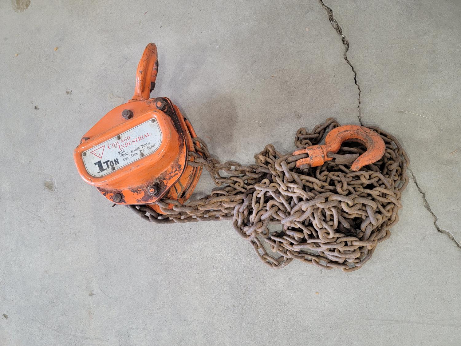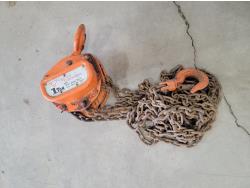 Electrical cords, (2) poly saw horses, shackle, tire chains, 1 ton chain hoist