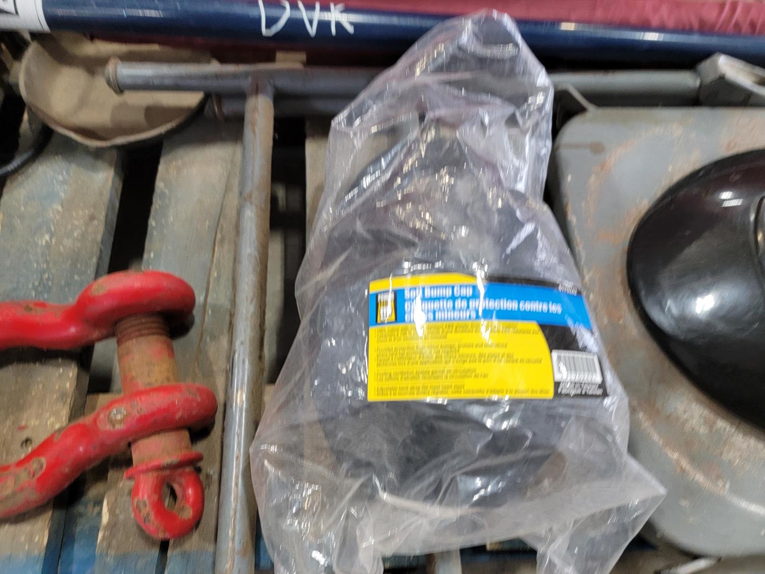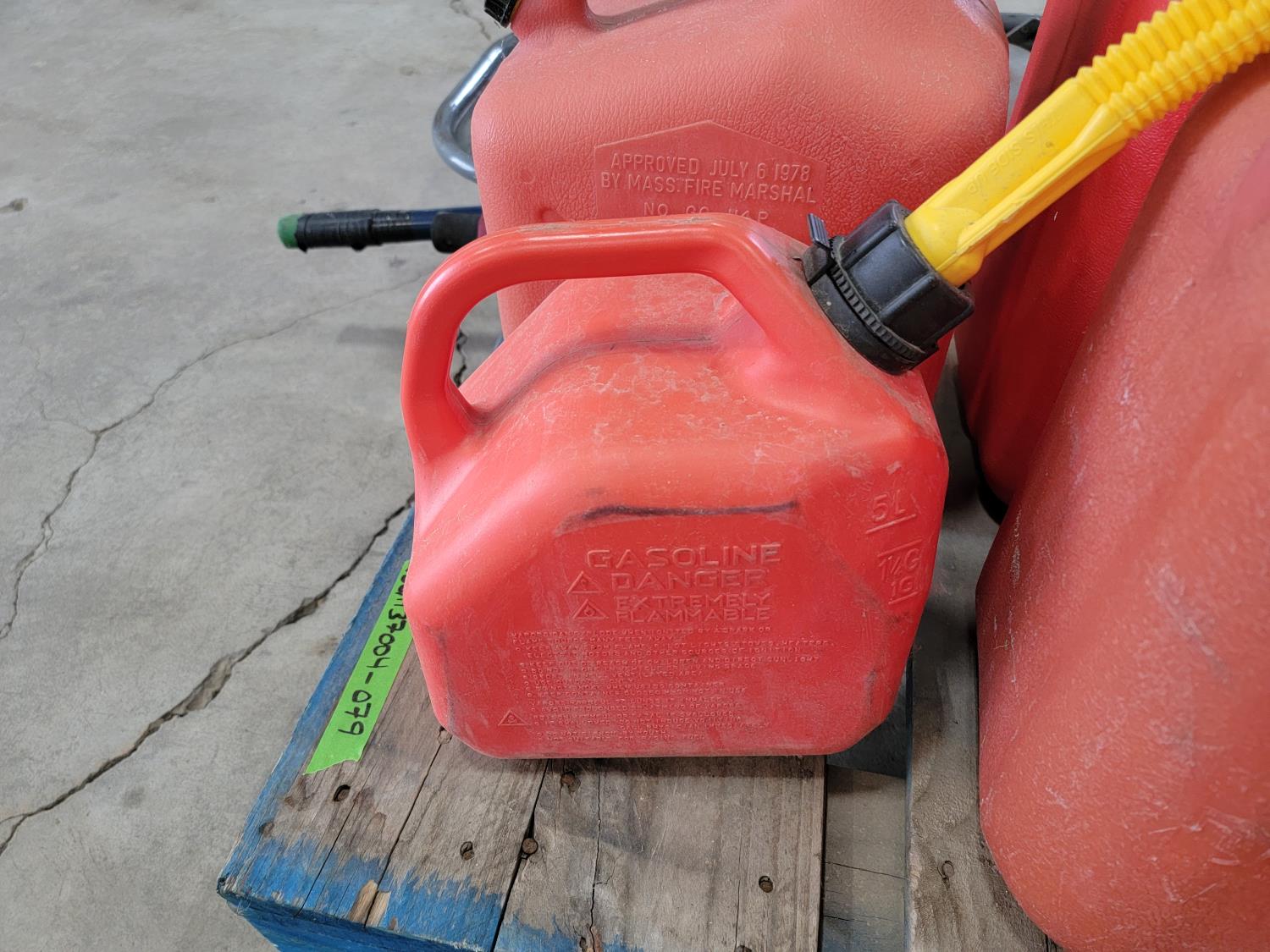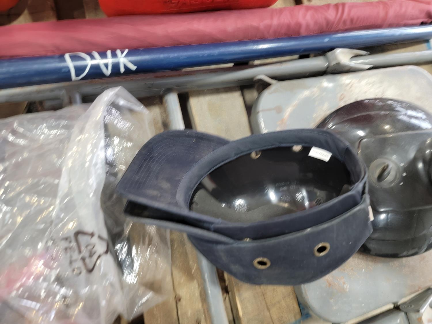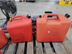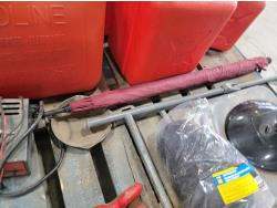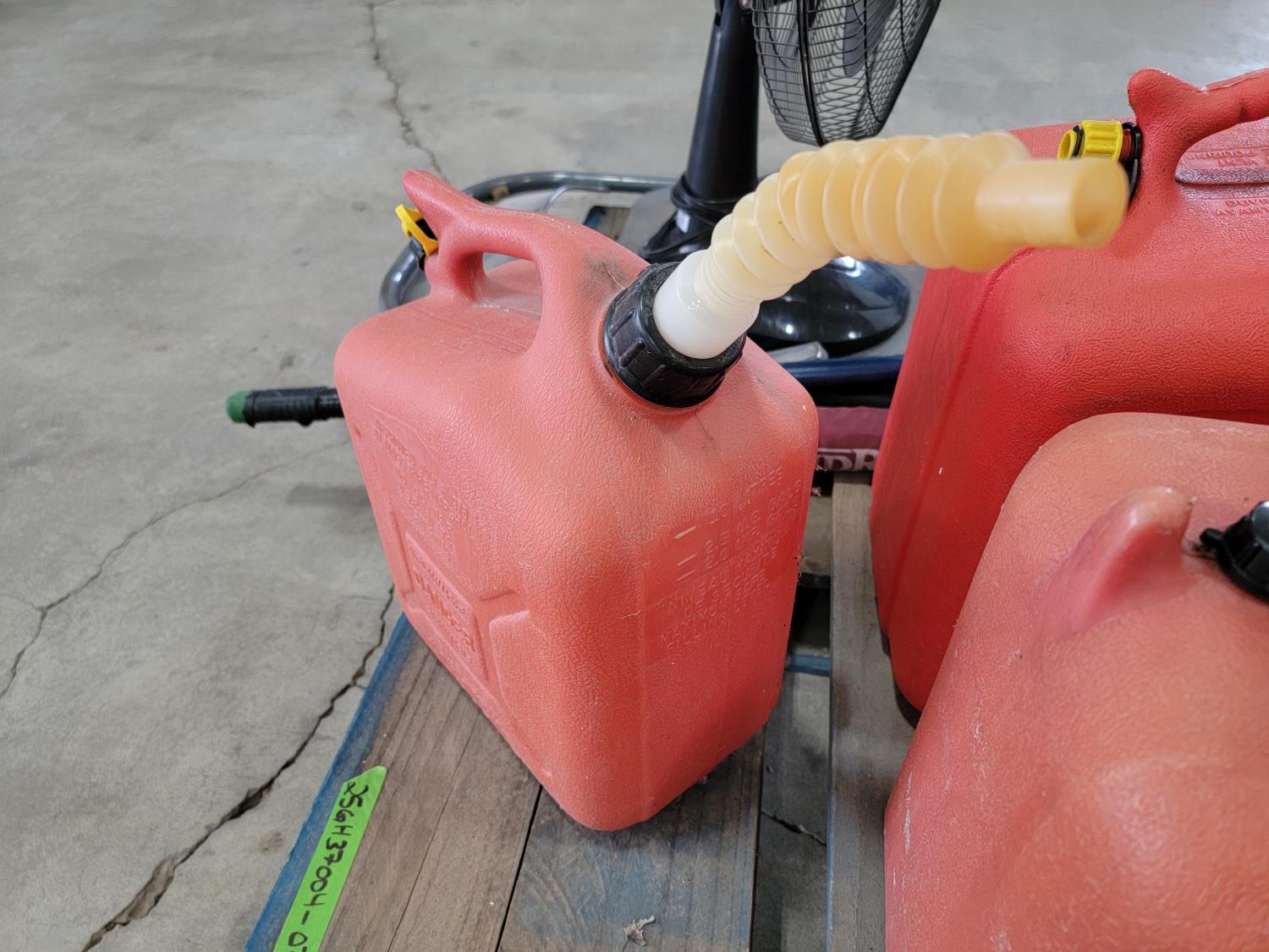 (6) jerry cans, fan, metal folding chair, shackle, (2) Powerfist soft bump caps, battery charger, industrial rake, broadcast spreader
