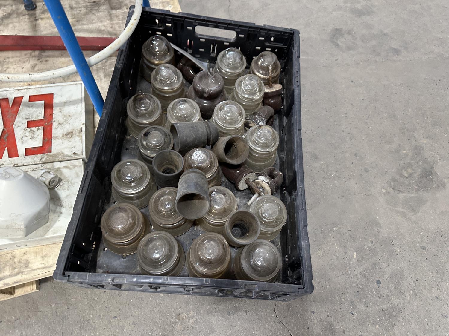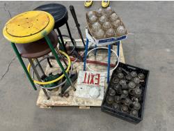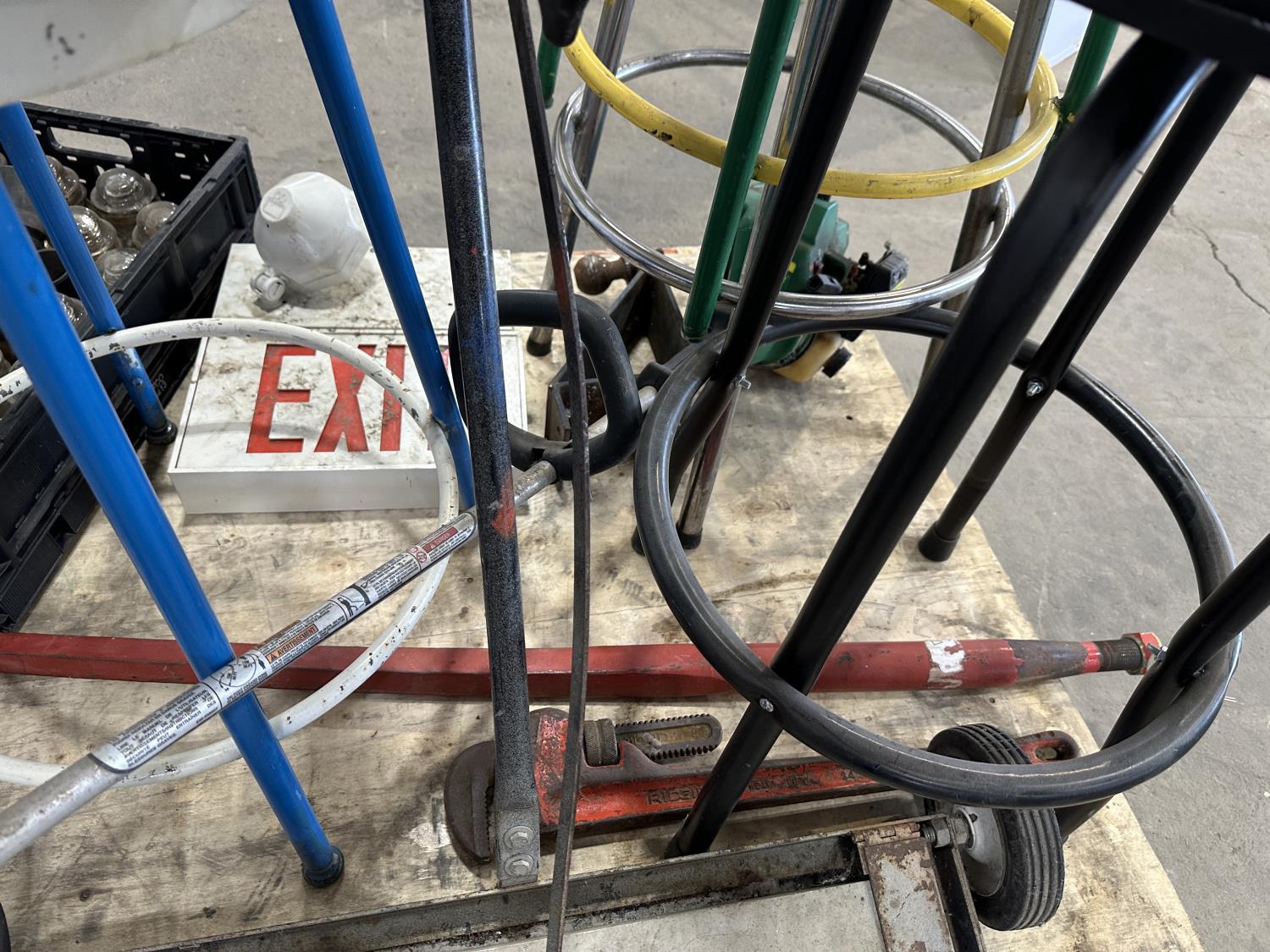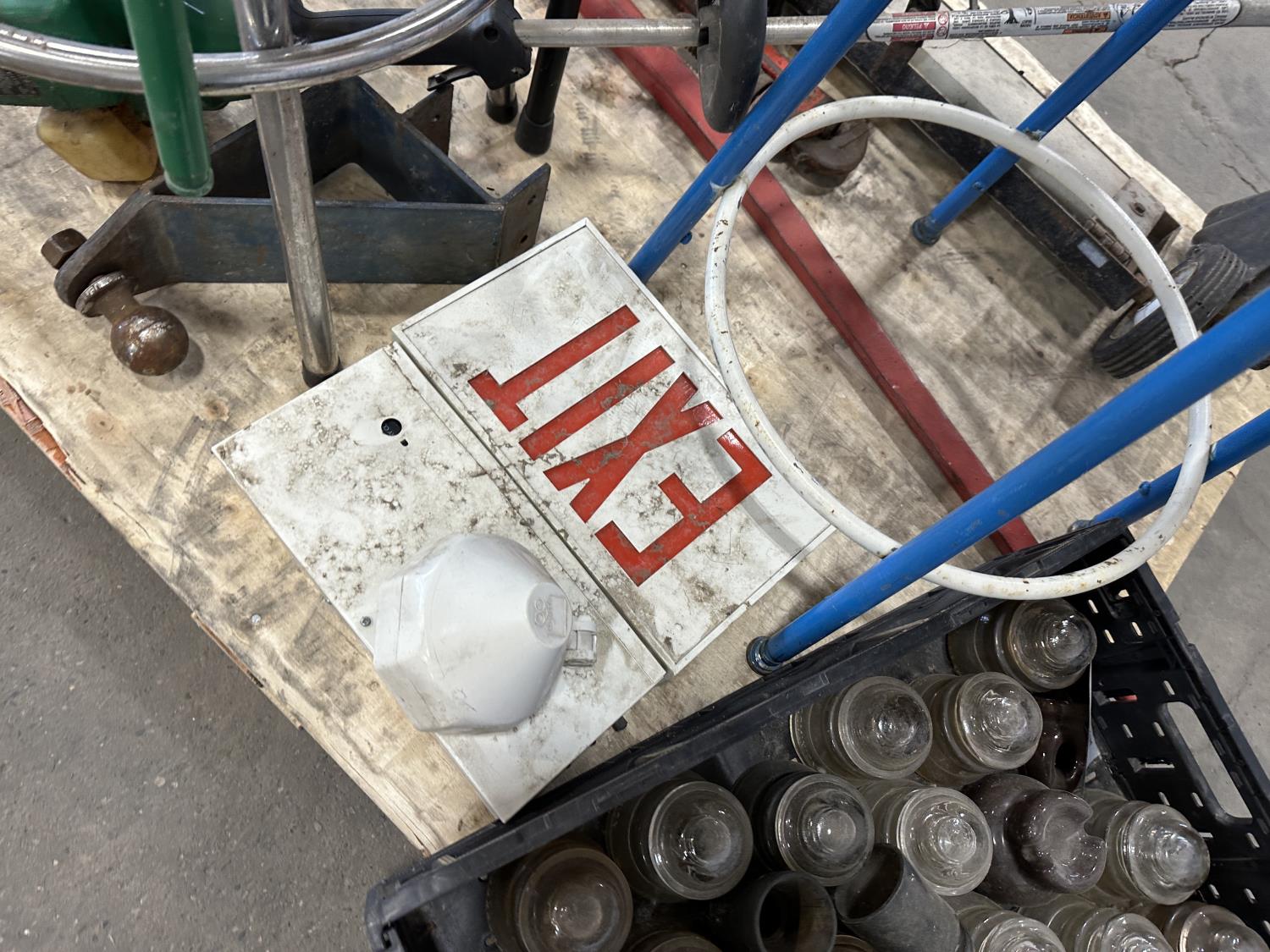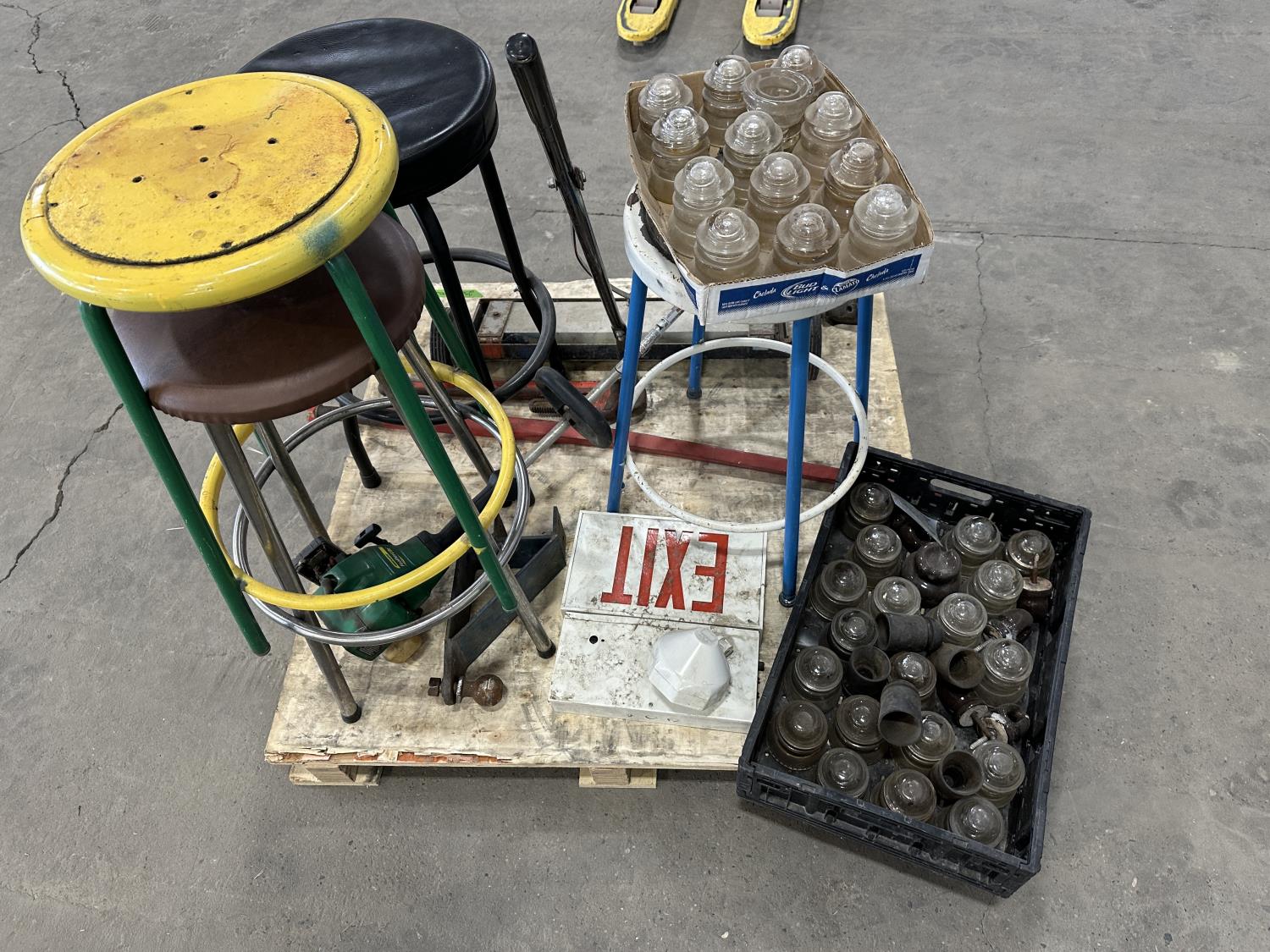 4 ft bale spear, glass insulators, shop stools, pipe wrench, exit sign, weed trimmer (untested)