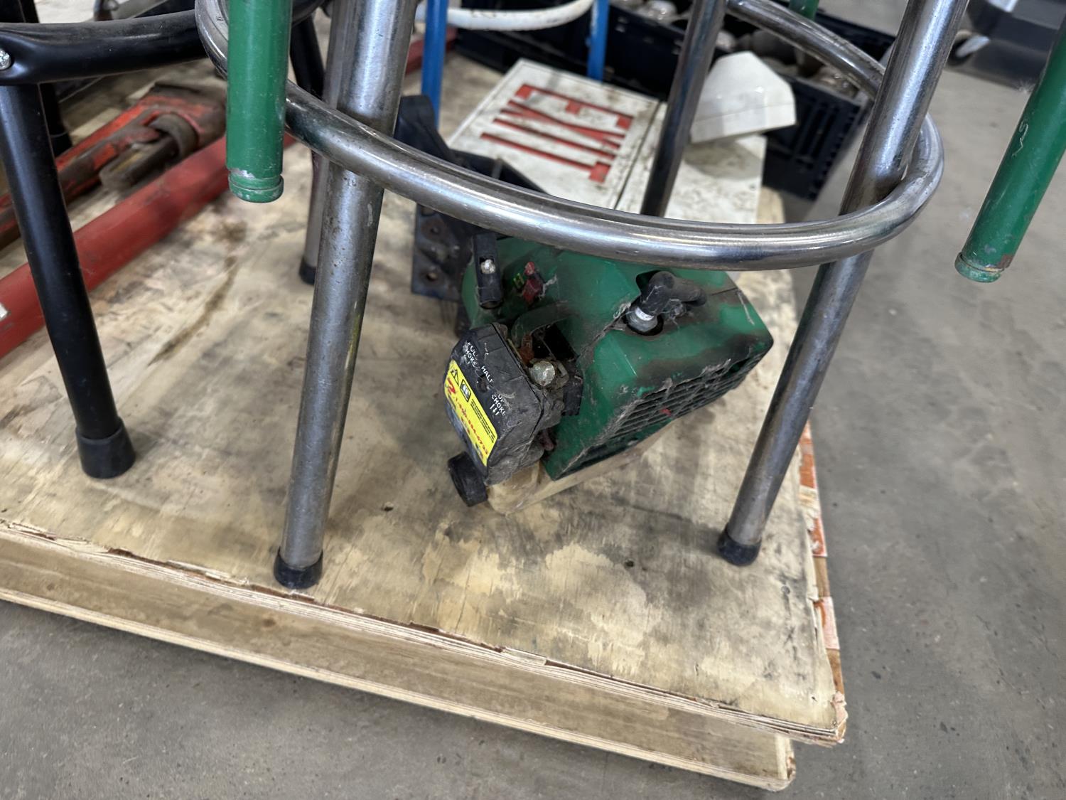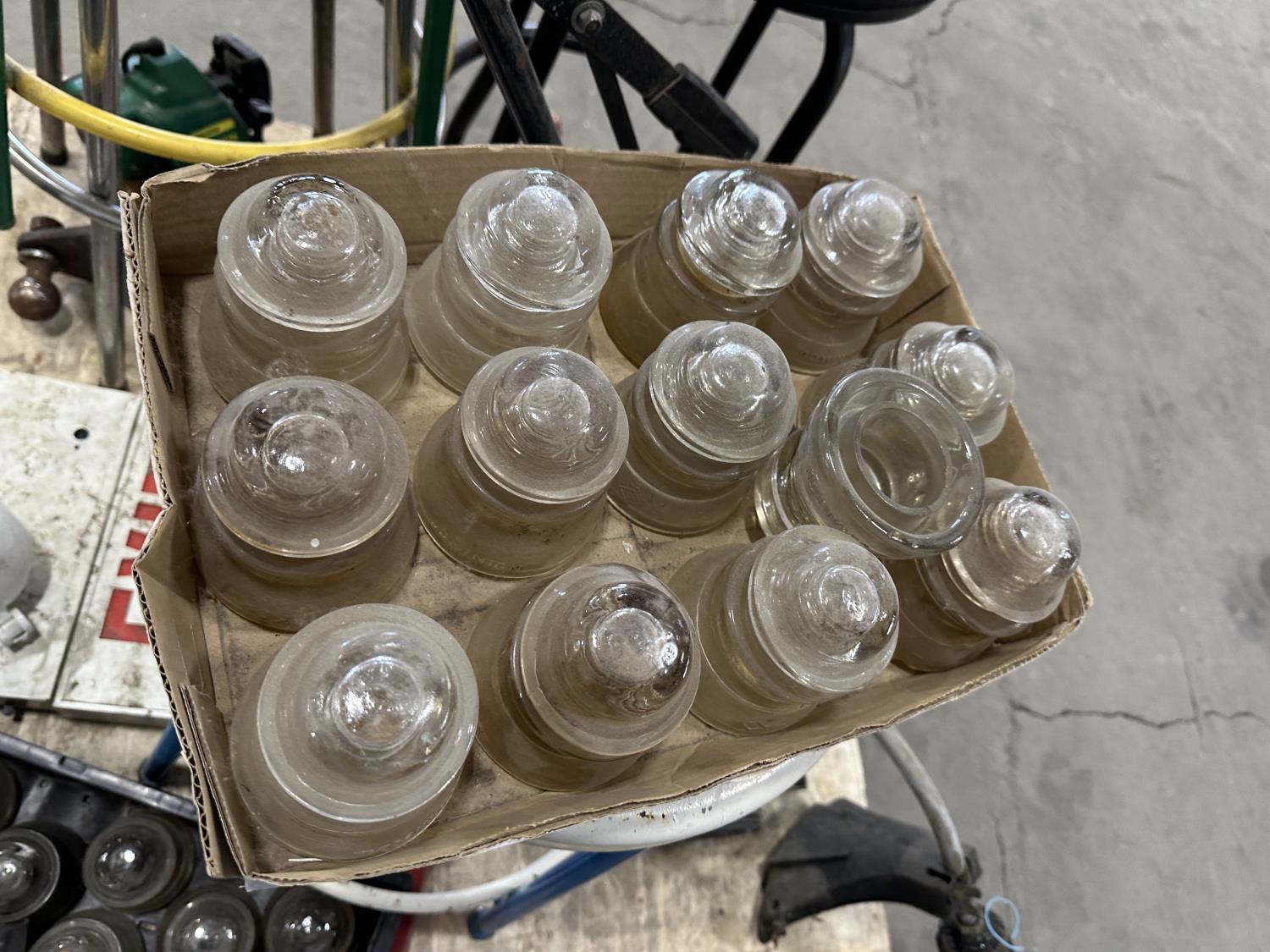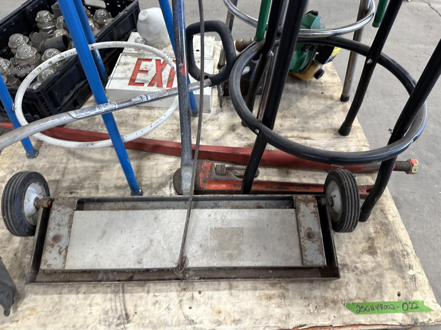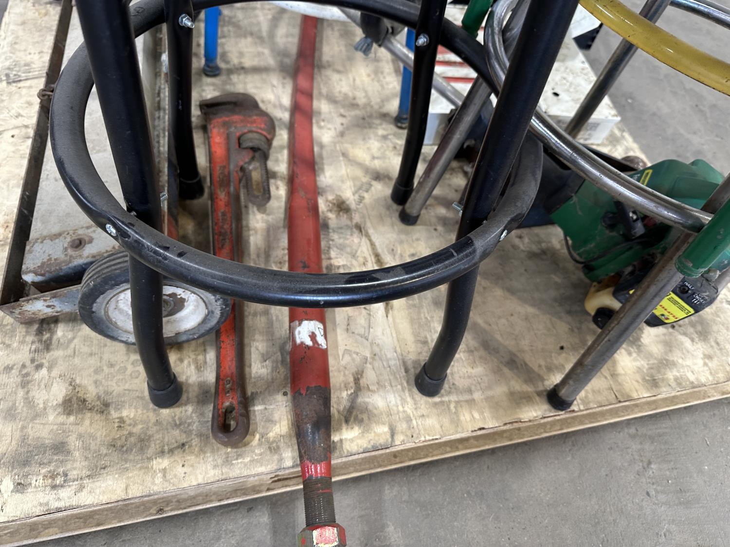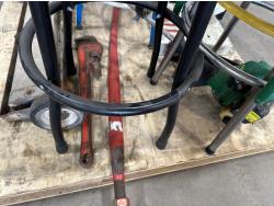 4 ft bale spear, glass insulators, shop stools, pipe wrench, exit sign, weed trimmer (untested)