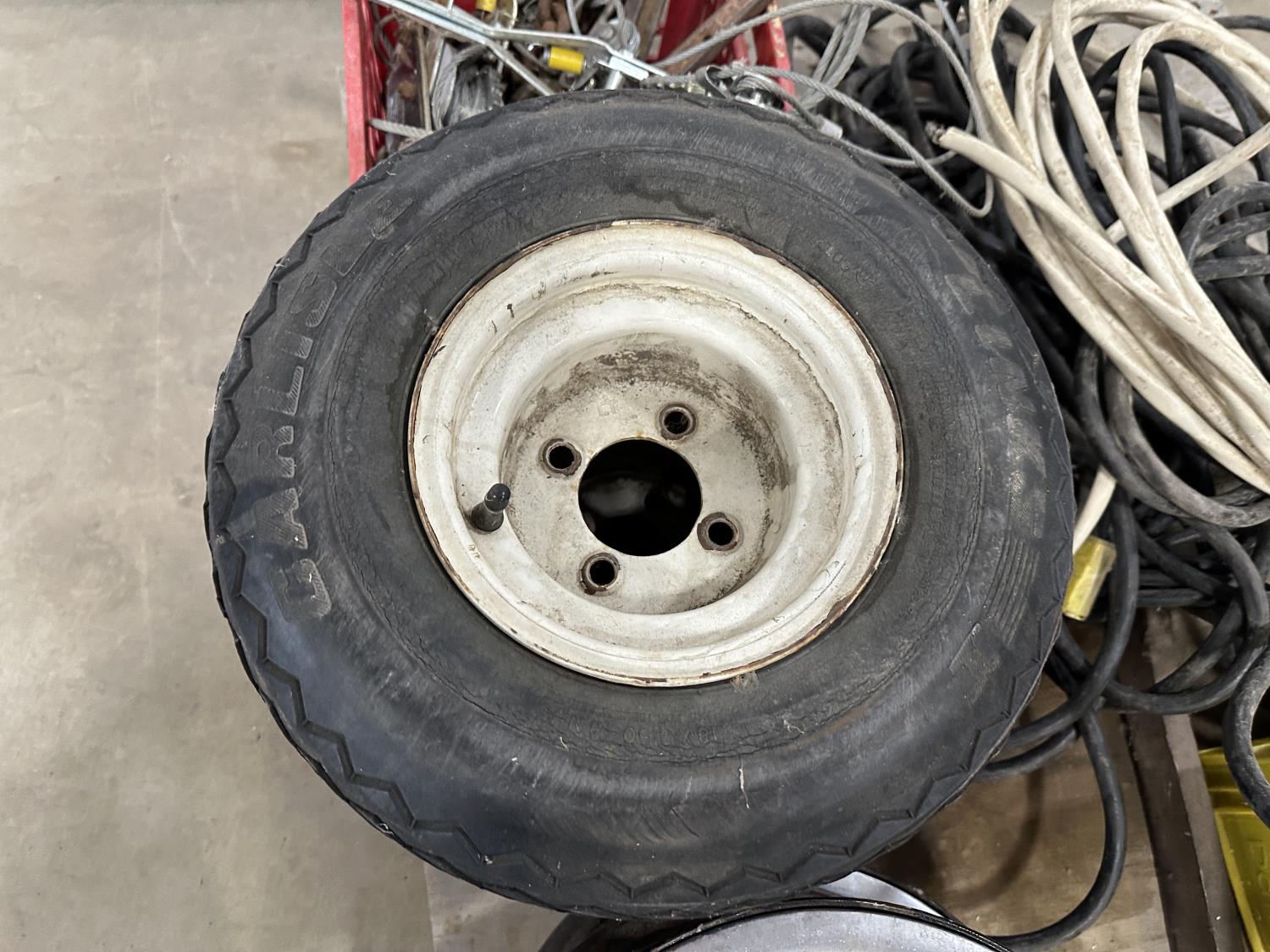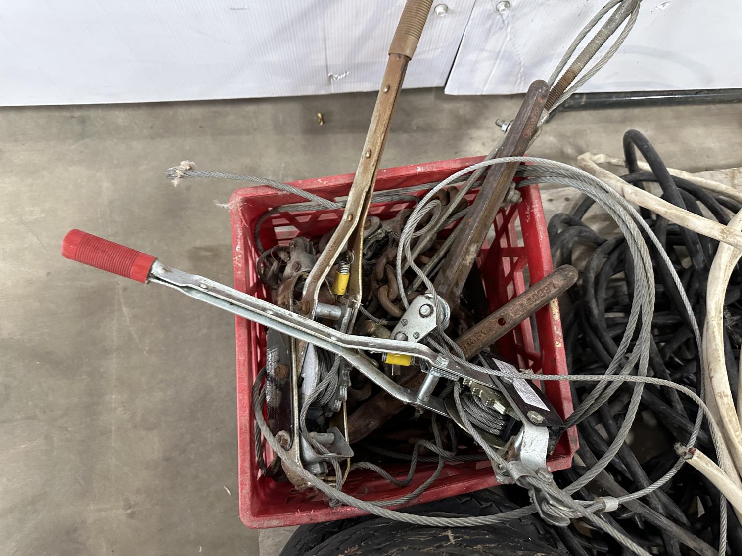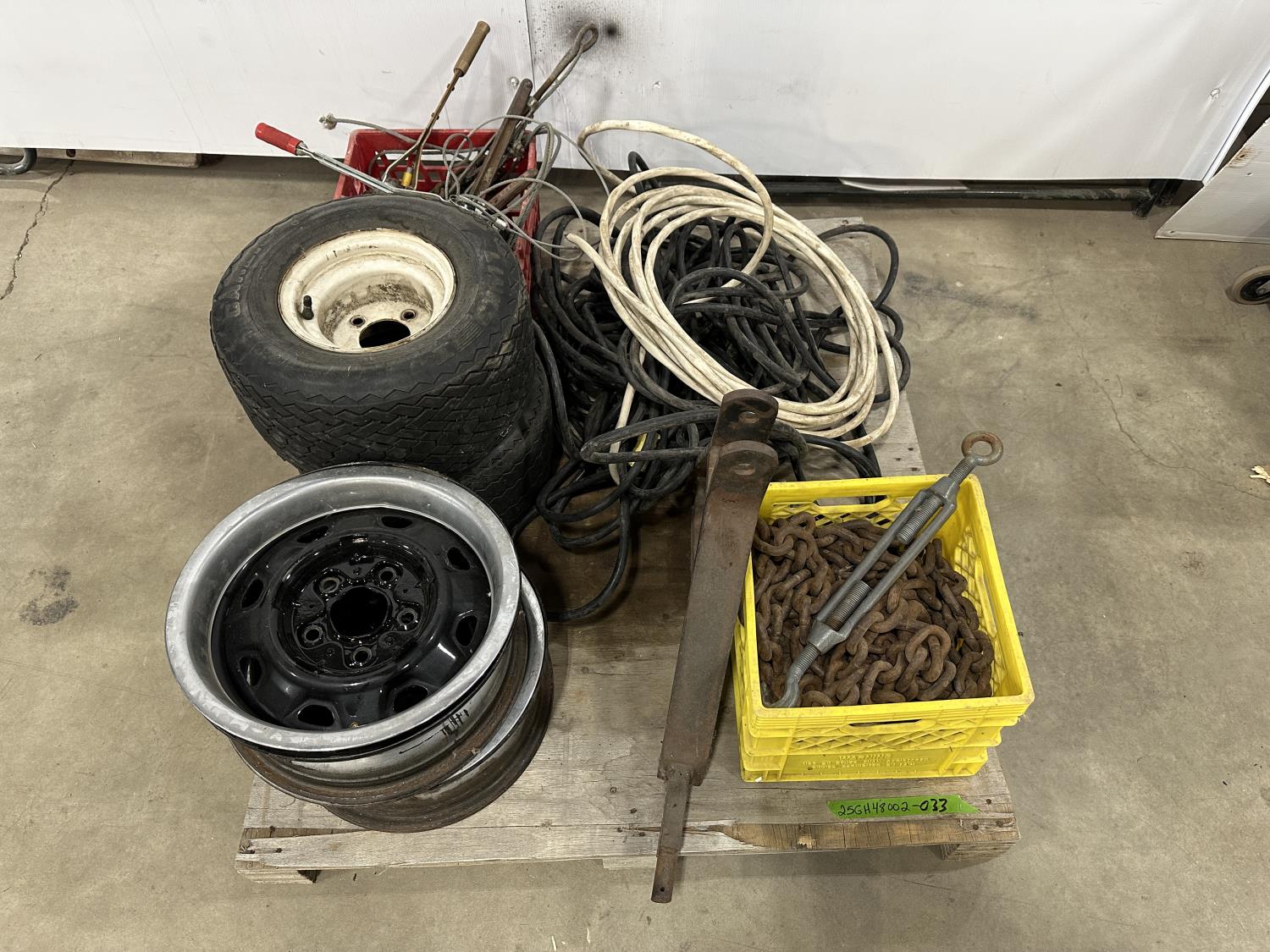 Come-alongs, (2) golf cart tires with rims, (2) 5 bolt rims, extension cords, chain