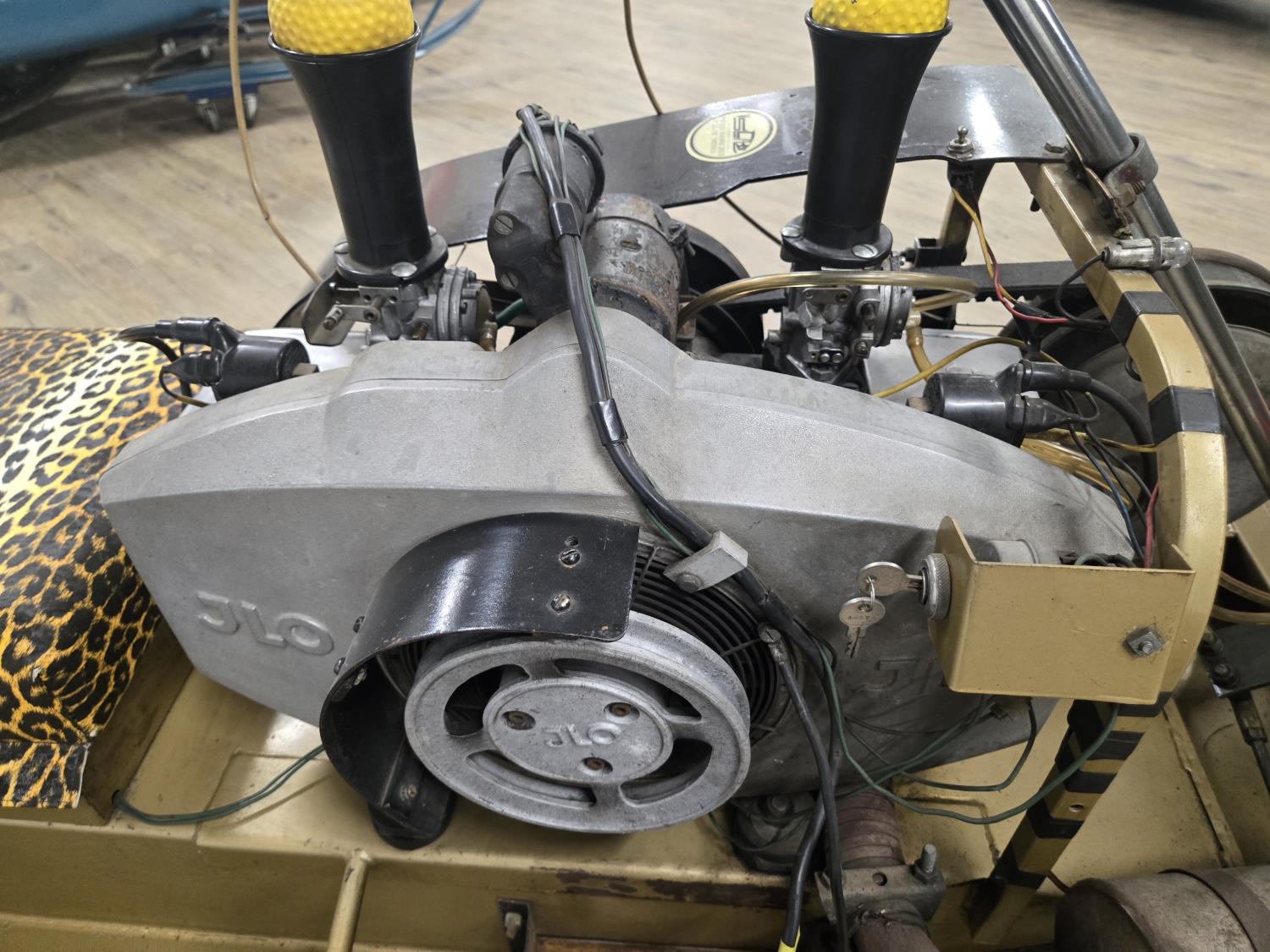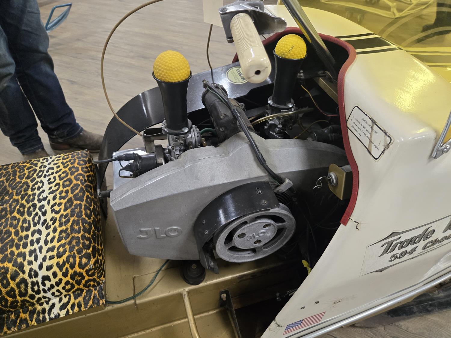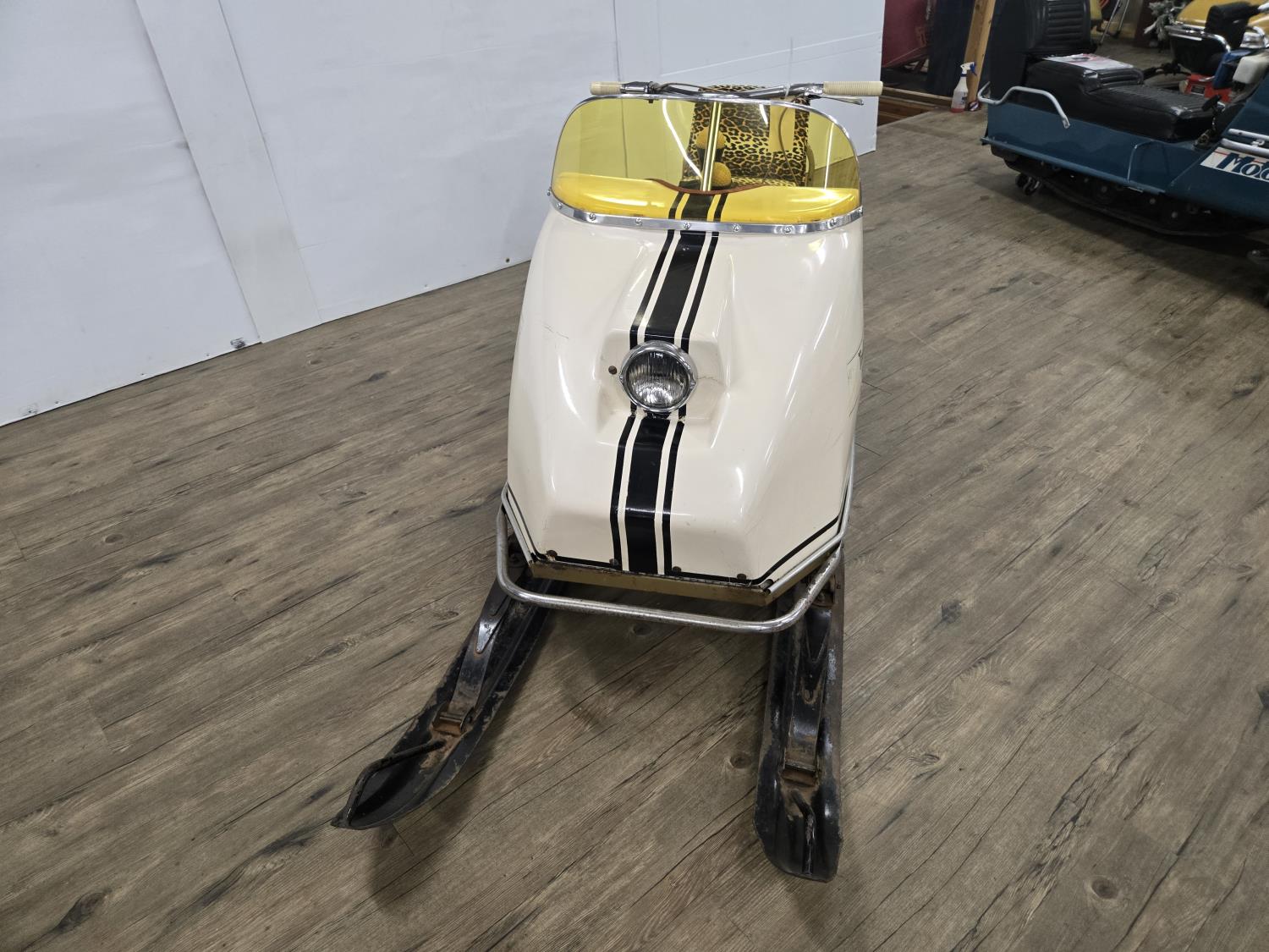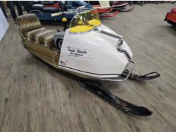 594 cc JLO Opposed 34 HP 2 cylinder 2 stroke fan cooled engine, electric start, windshield, 15 inch wide track, rear tow hitch, under seat storage, bogie suspension, 100 produced in 1968 only 5 are known to exist, original seat comes with unit. This snowmobile has been in a 20 degree climate controlled showroom. Machine was in good running condition when placed in showroom. ***USA and Eastern Canada buyers shipping can be available. Call Lorne for further discussion. This sale is in Canadian dollars