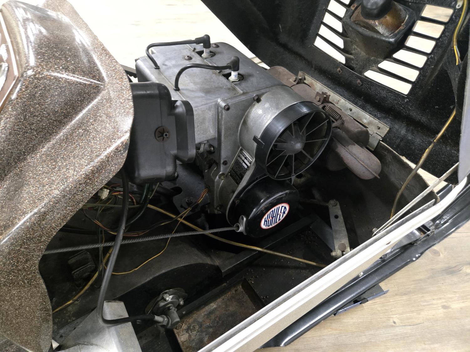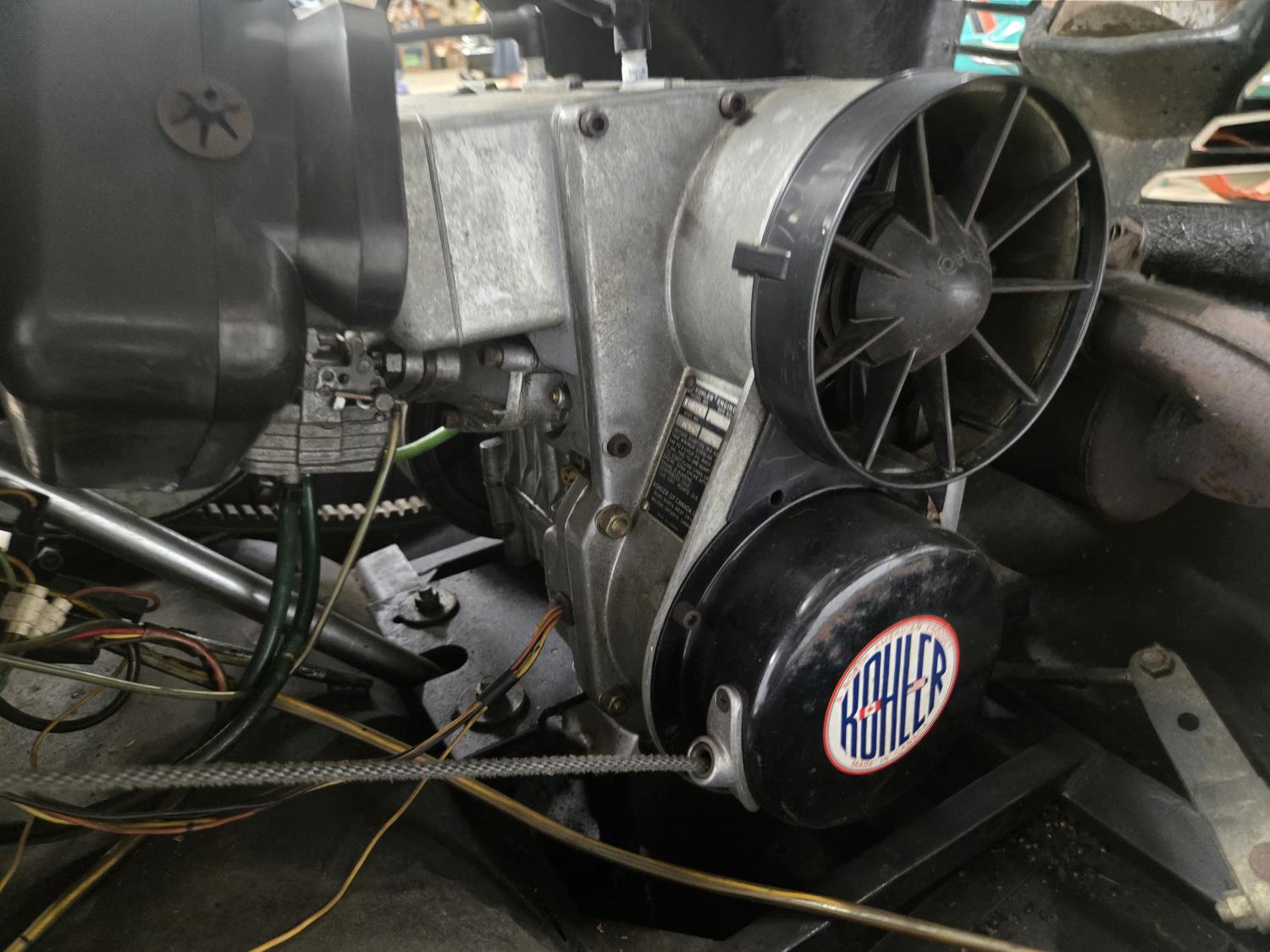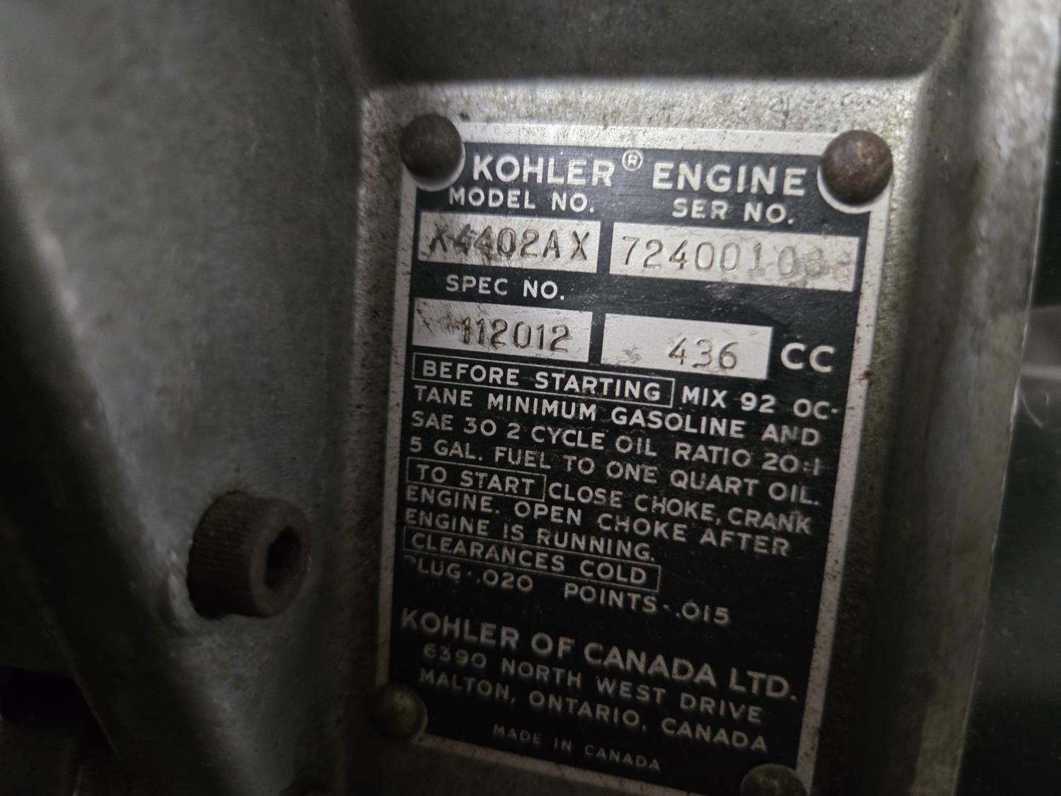 436 cc Kohler 2 cylinder 2 stroke Fan cooled engine, 2 up seat with backrest, rear tow hitch, bogie suspension, windshield missing, No Track. This snowmobile has been in a 20 degree climate controlled showroom. Machine was in good running condition when placed in showroom. ***USA and Eastern Canada buyers shipping can be available. Call Lorne for further discussion. This sale is in Canadian dollars