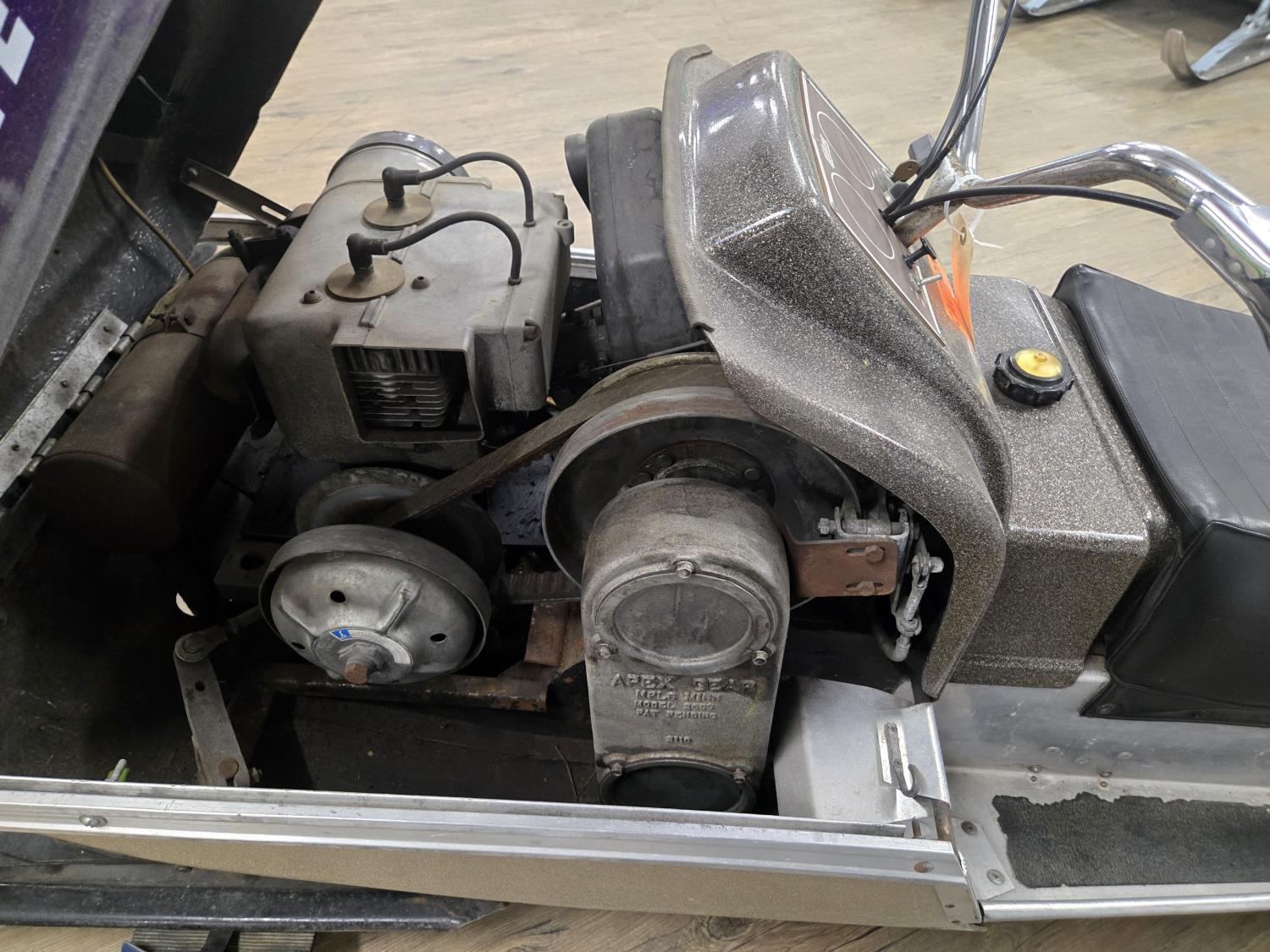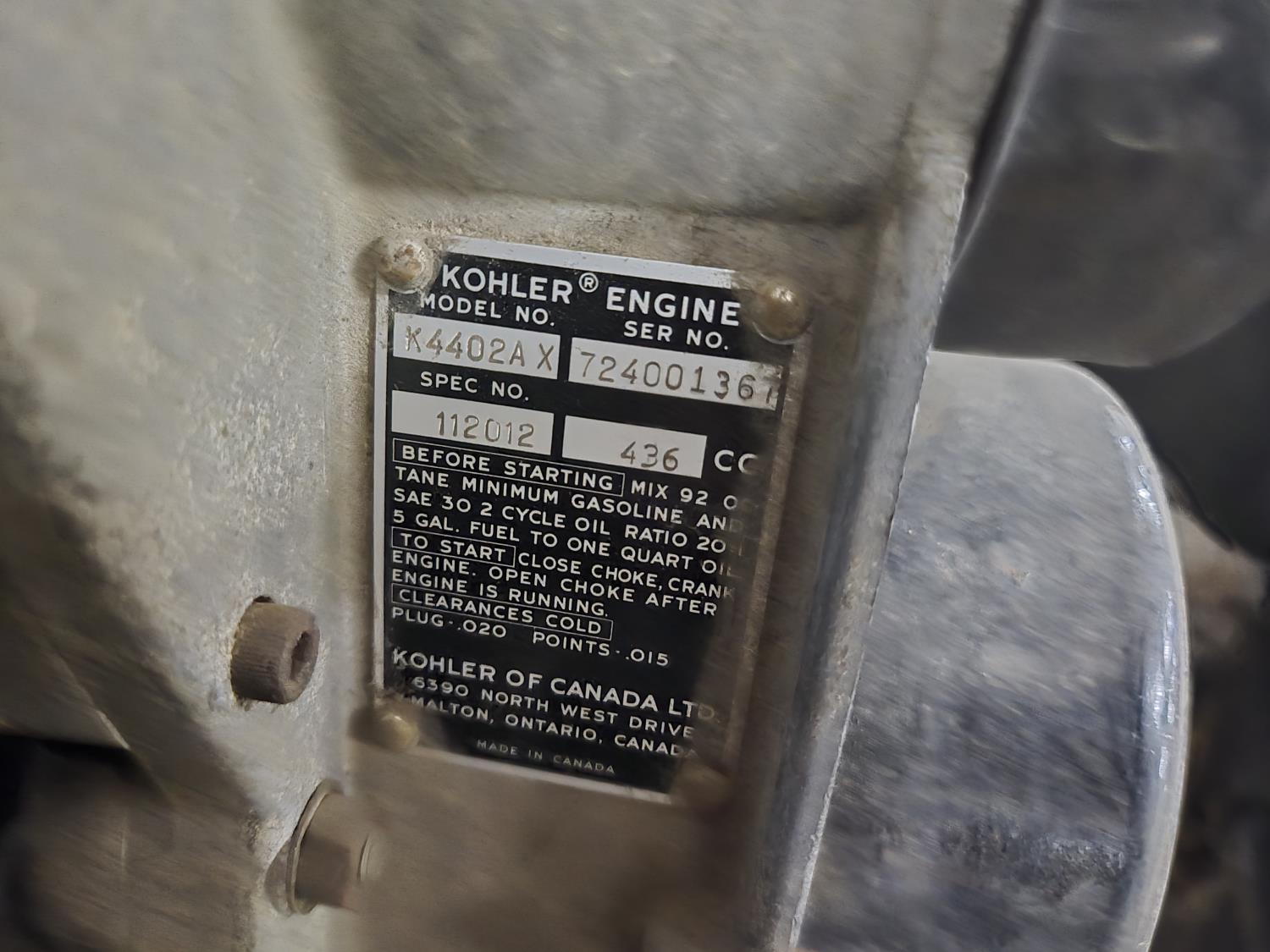 436 cc Kohler 2 cylinder 2 stroke fan cooled engine, windshield, rear tow hitch, bogie suspension. This snowmobile has been in a 20 degree climate controlled showroom. Machine was in good running condition when placed in showroom. ***USA and Eastern Canada buyers shipping can be available. Call Lorne for further discussion. This sale is in Canadian dollars