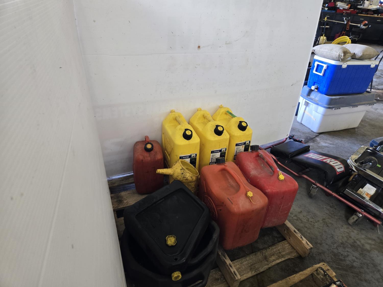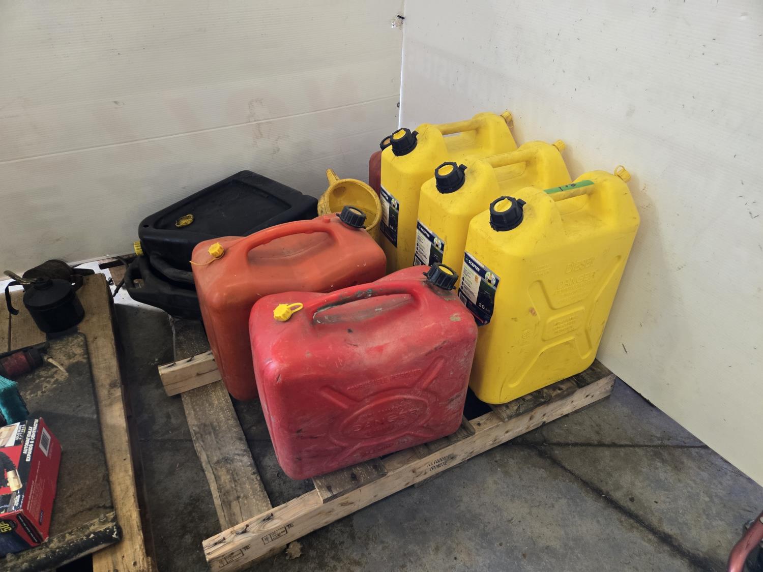 24 (2) Oil Drain Pans, (5) Jerry Cans & Poly Pour Jug