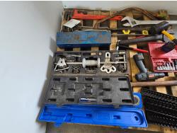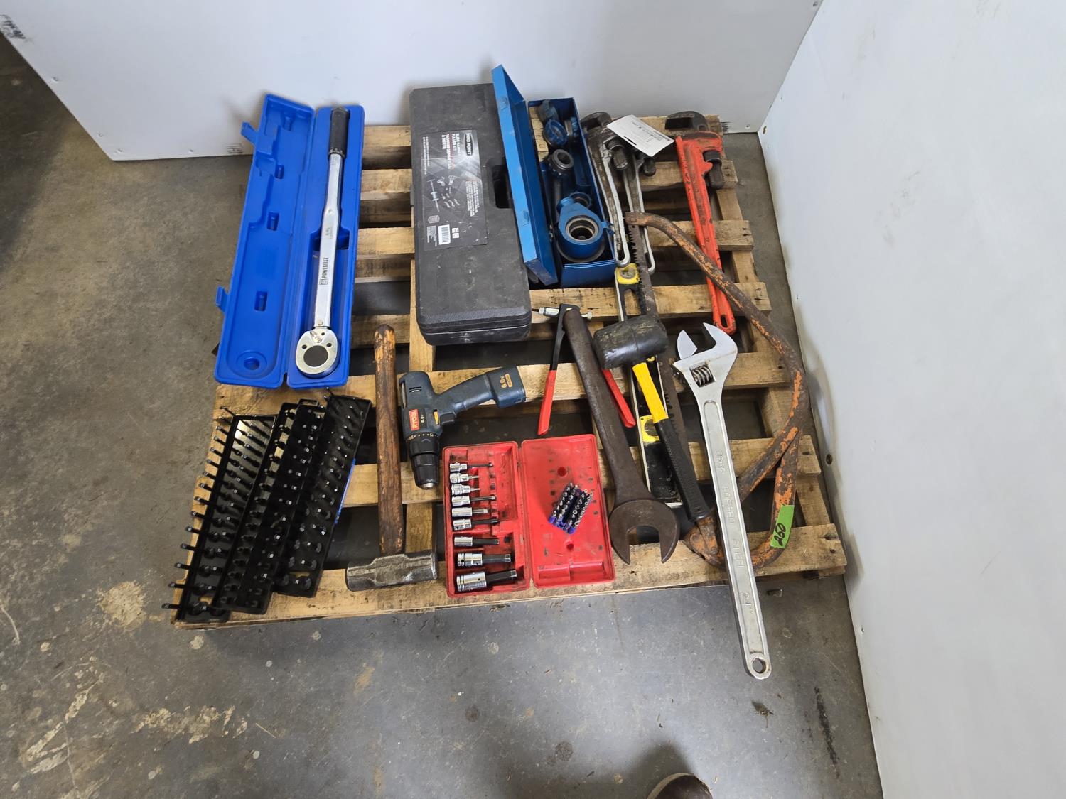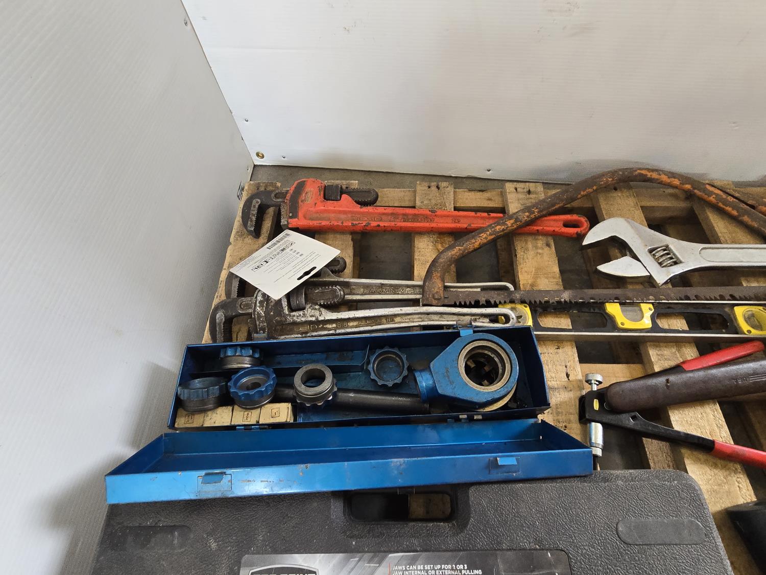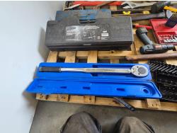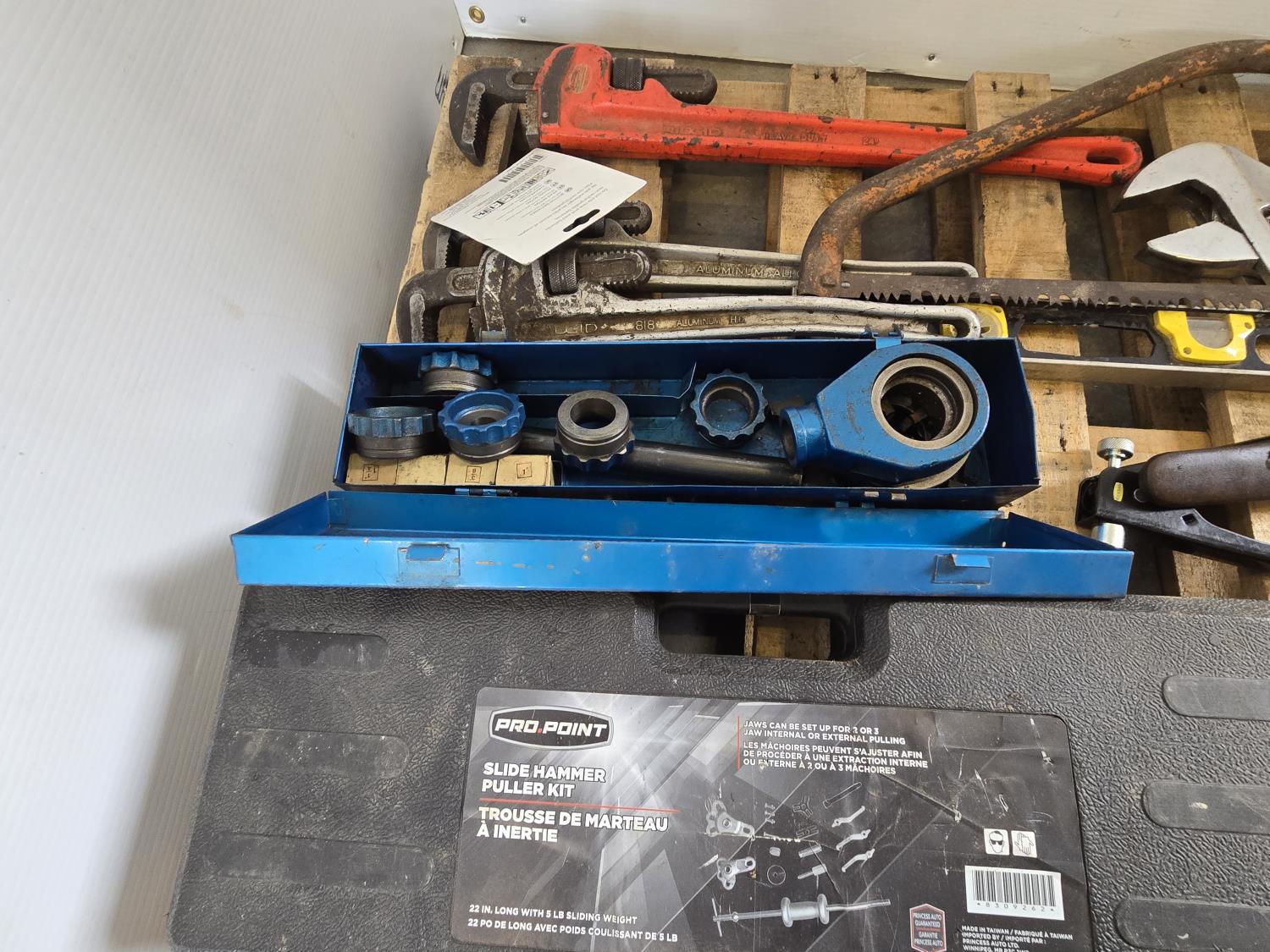 3/4 inch 300 lb torque wrench, pro point slide hammer kit, pipe threader, 24 inch adjustable wrench, miscellaneous tools