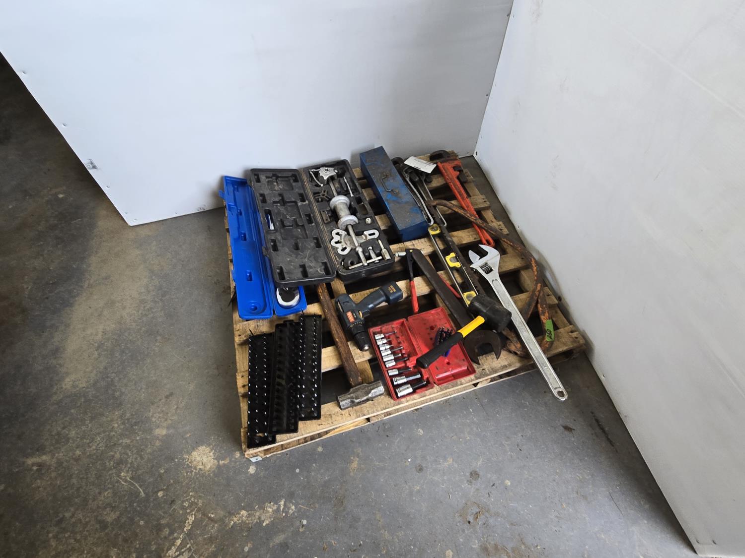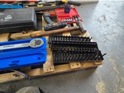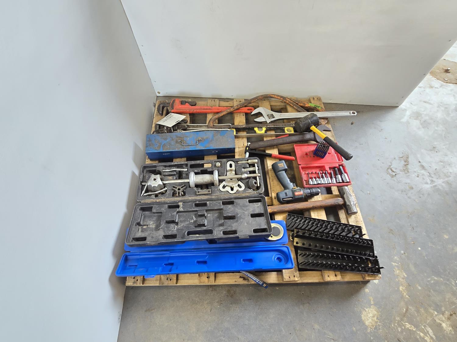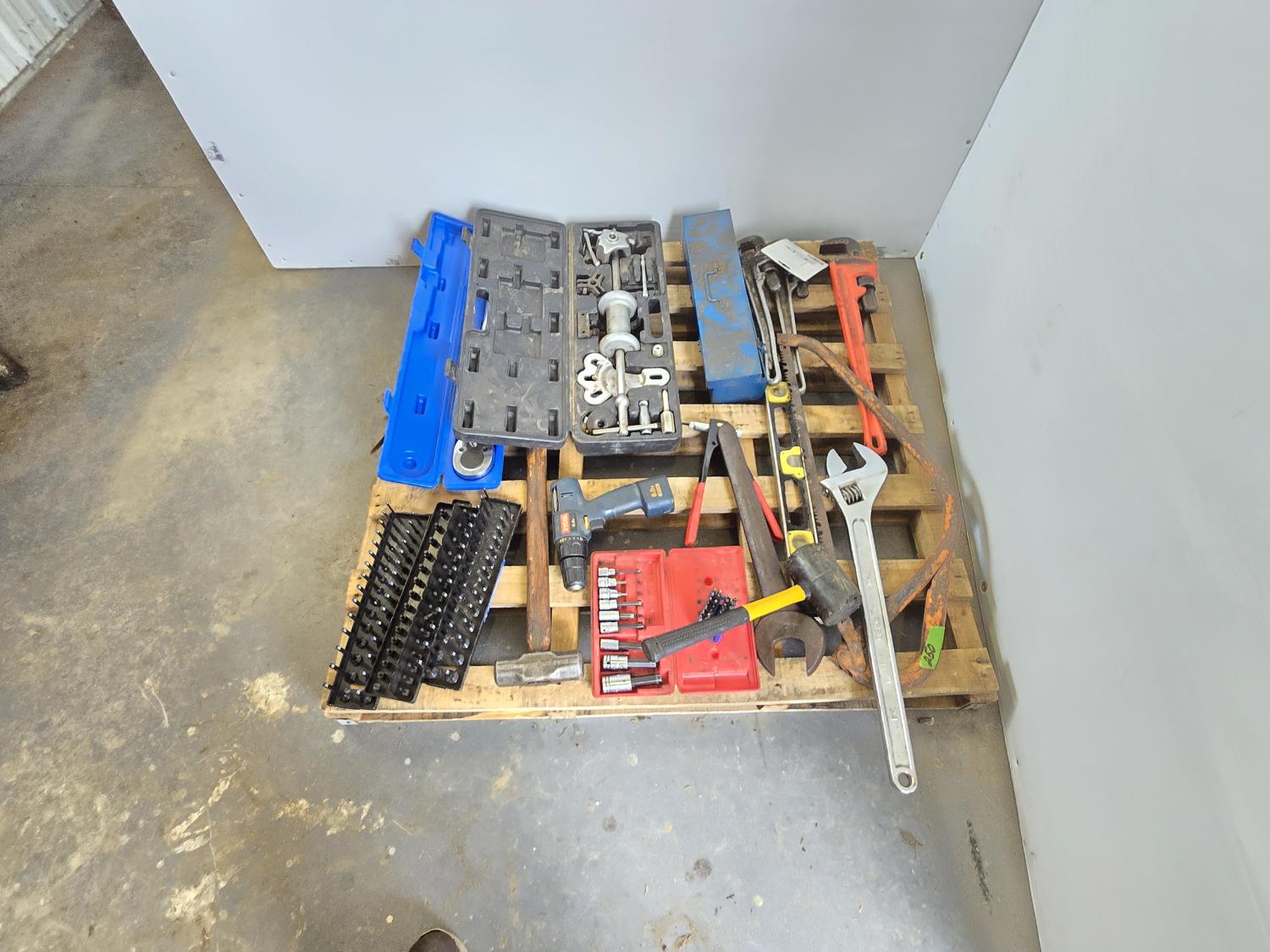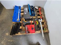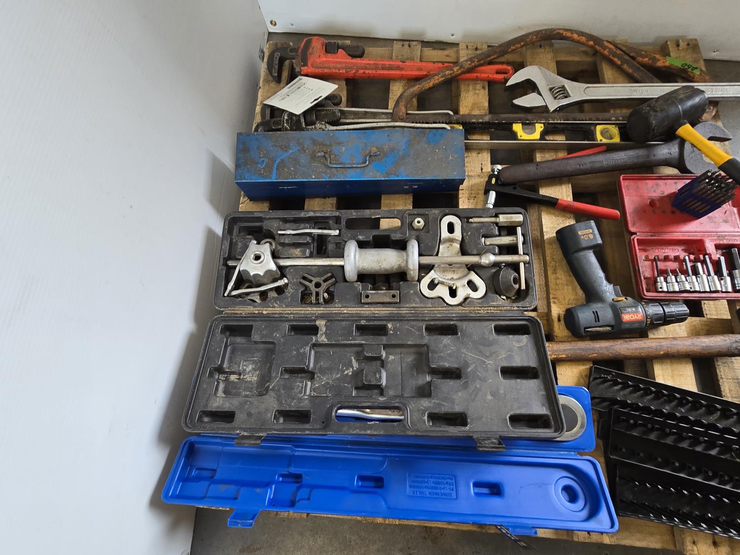 3/4 inch 300 lb torque wrench, pro point slide hammer kit, pipe threader, 24 inch adjustable wrench, miscellaneous tools