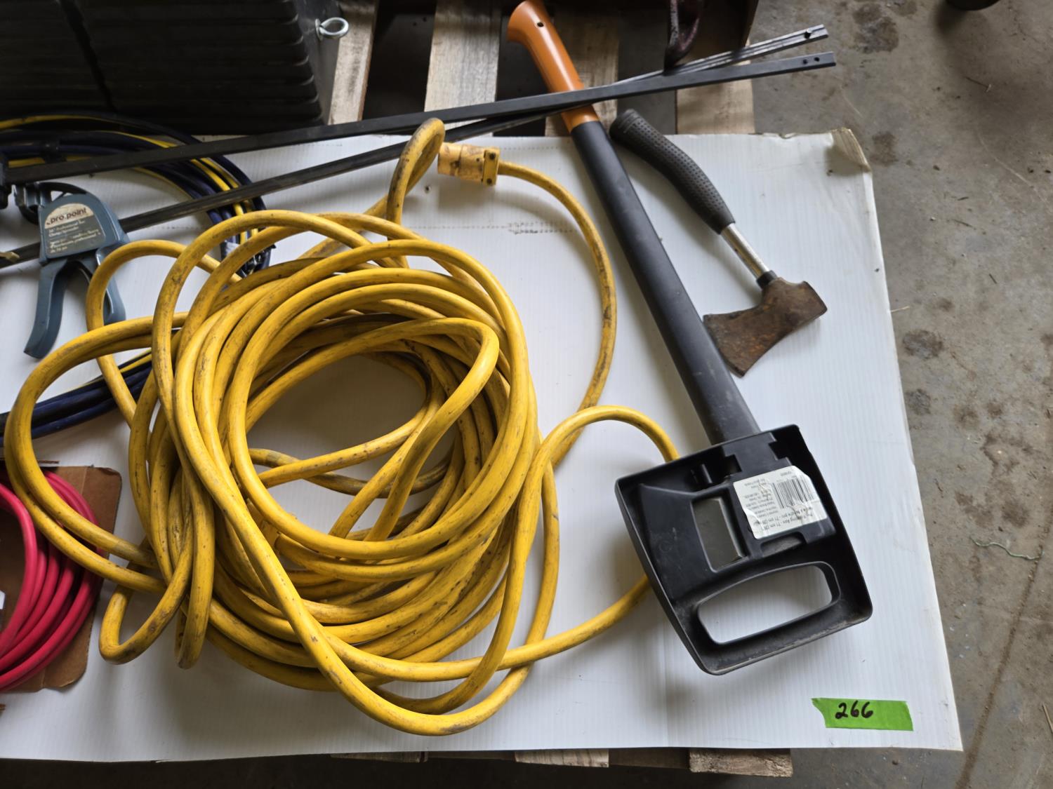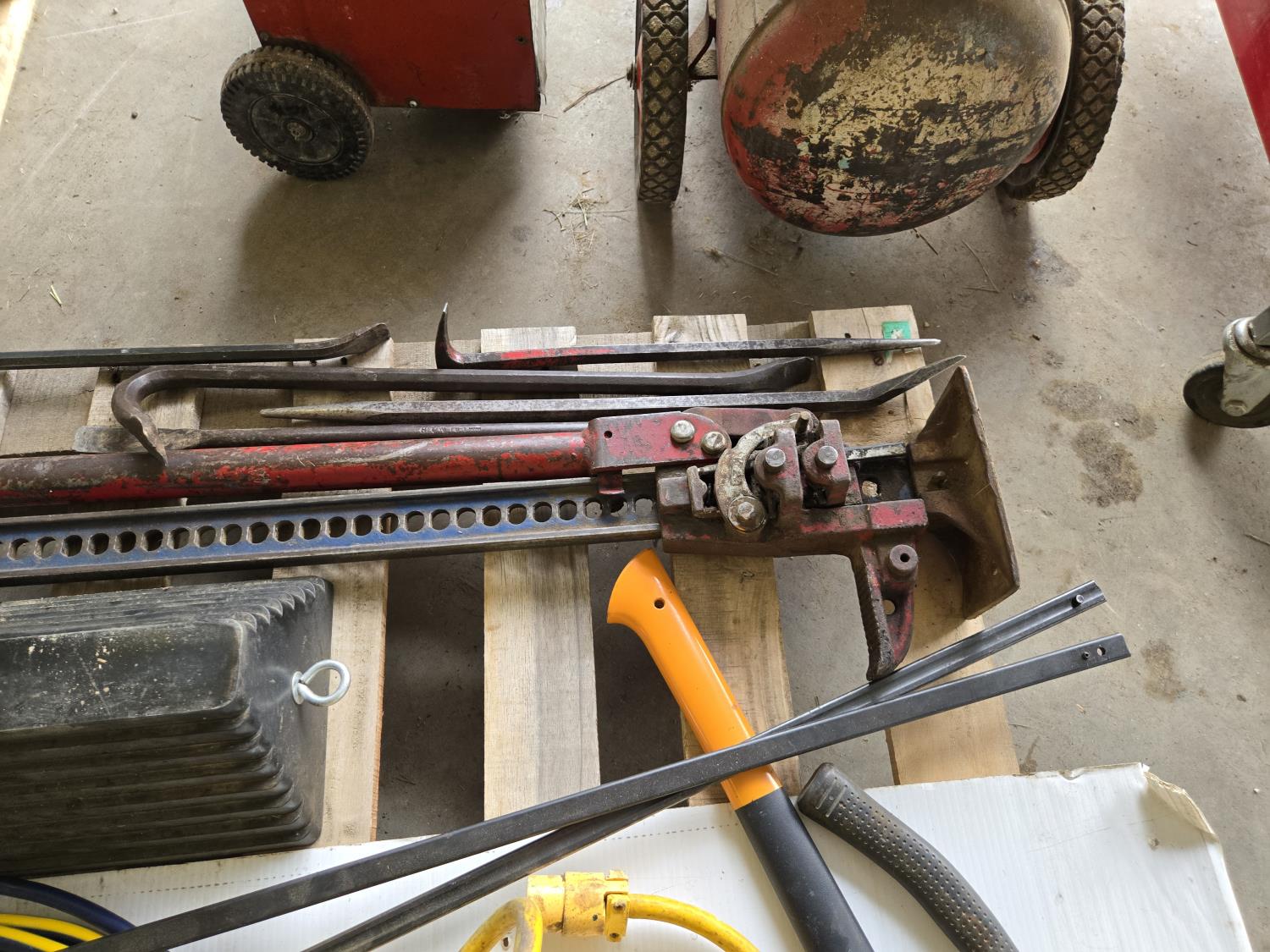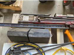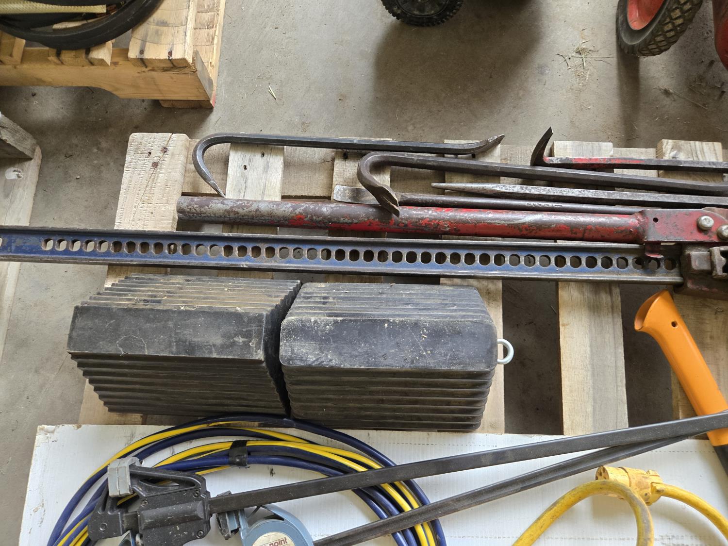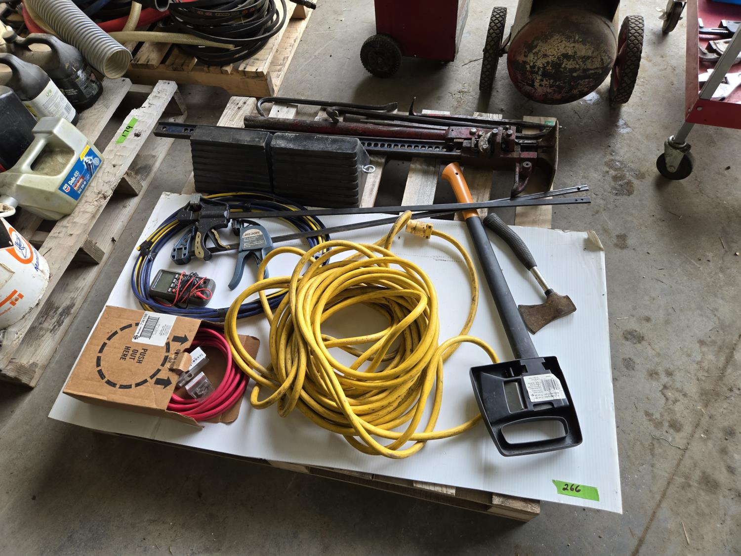 (5) crowbars, 28 inch splitting axe, small axe, heavy duty electrical cable, (2) wheel chalks, red battery cable, (2) 36 inch clamps, digital meter, jackall