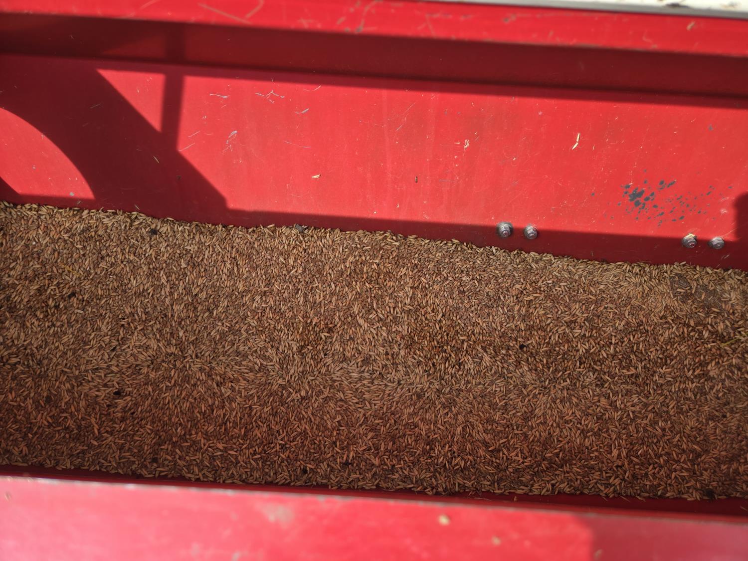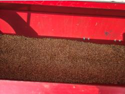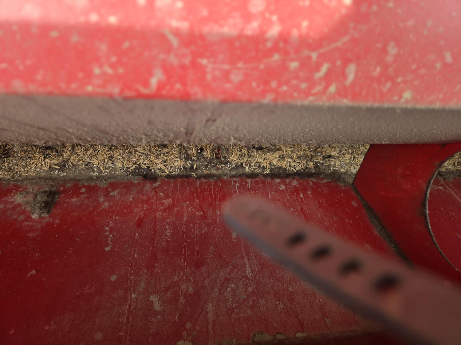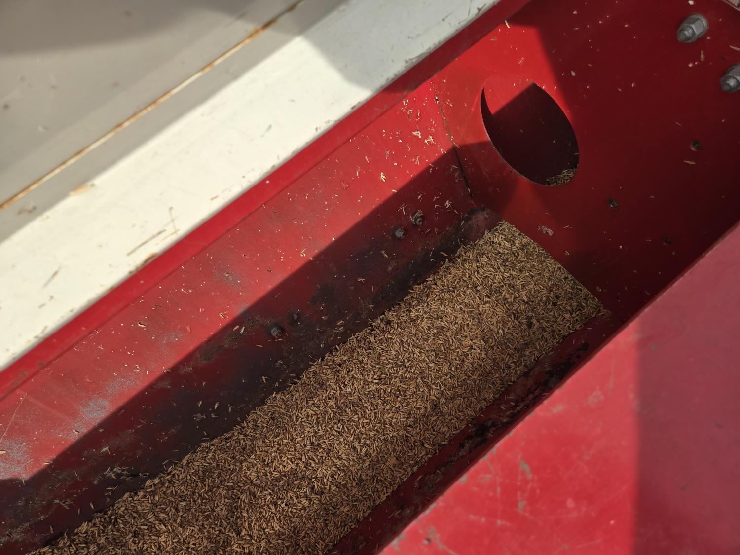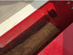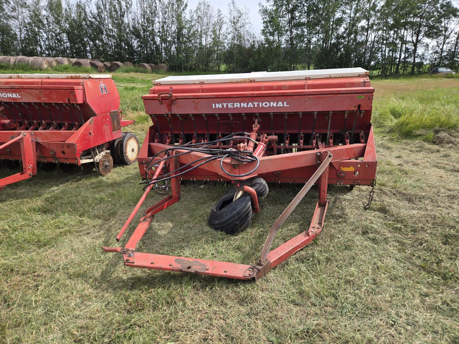 On (1) drill the front tire is flat and the hitch has been damaged. Grain was also left in drill.