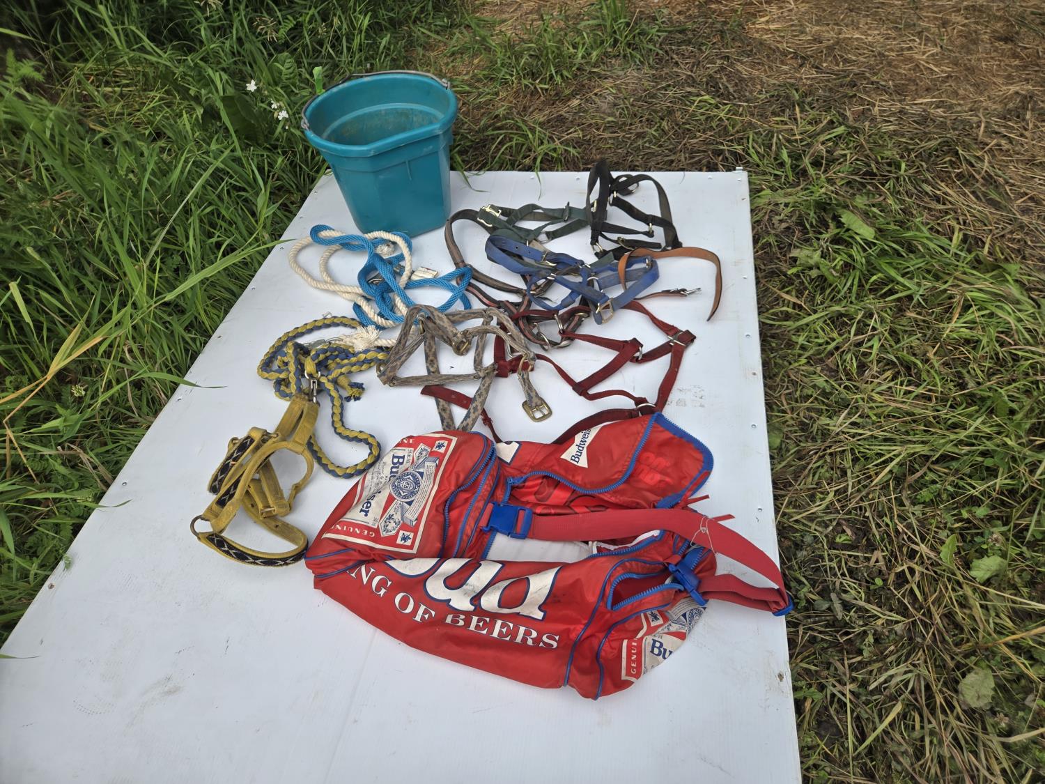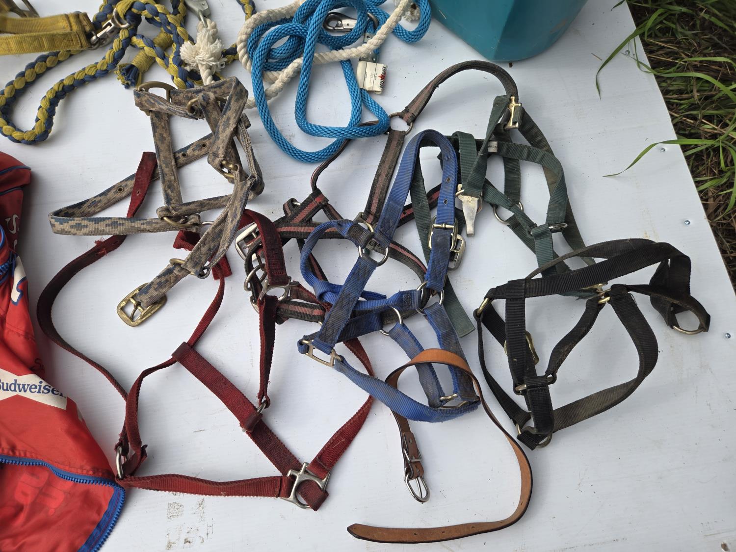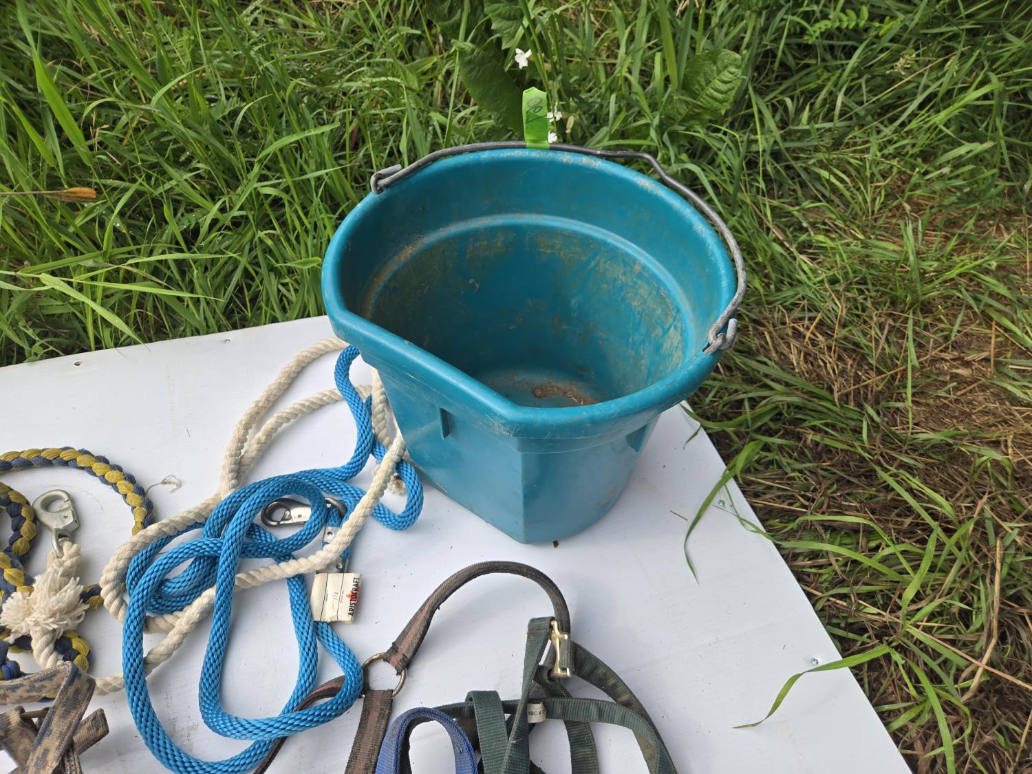 188 (7) Halters, (2) Lead Shanks & Poly Feed Bucket
