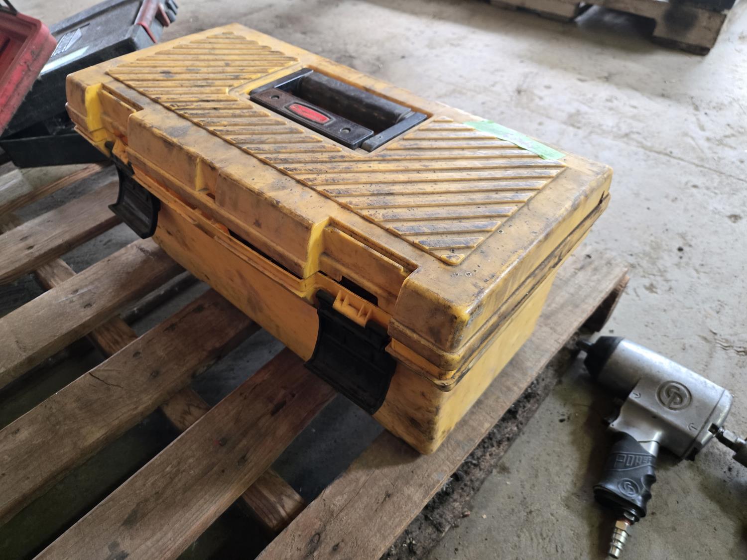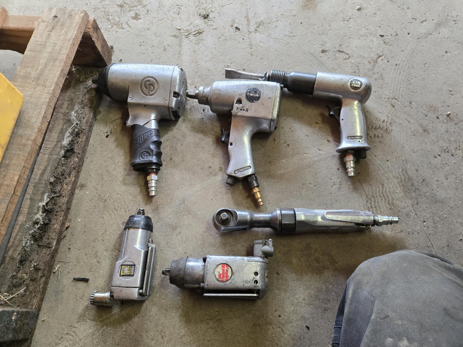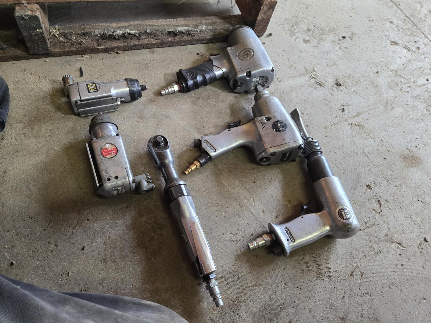 (2) 1/2 inch Impacts, (2) 3/8 inch butterfly impacts, 3/8 inch ratchet, air chisel, poly tool box