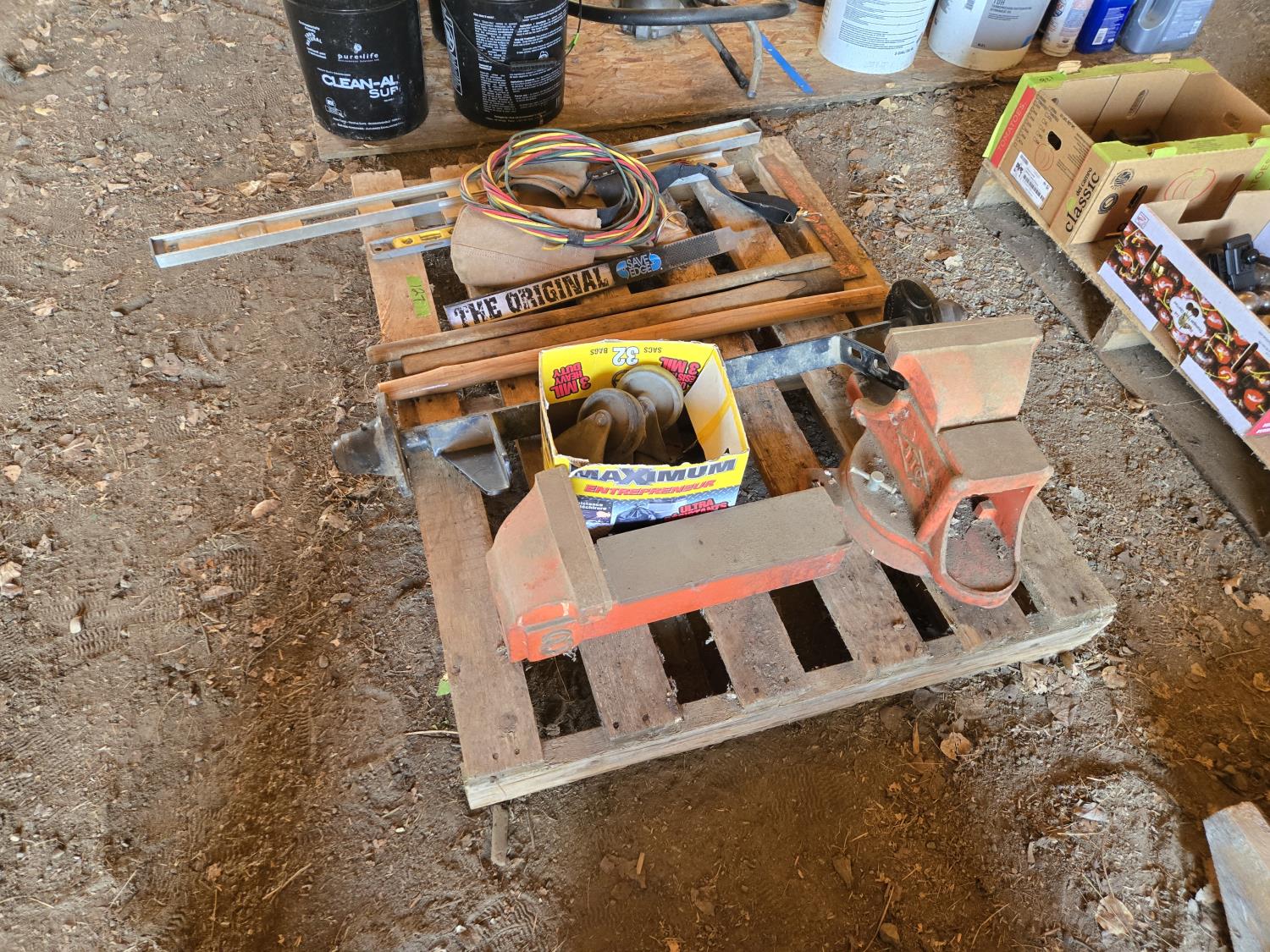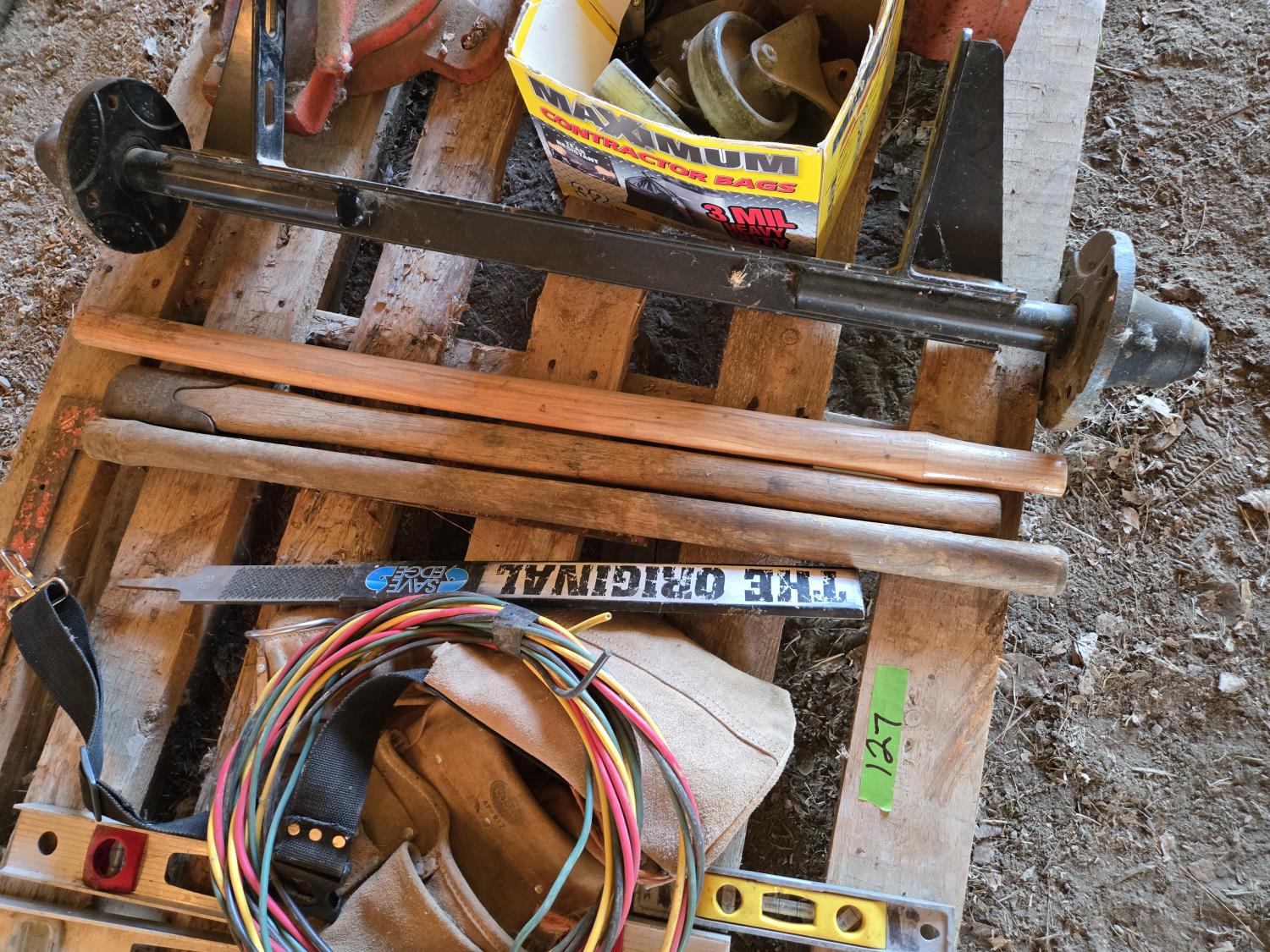 (3) levels, (2) wooden tool handles, large vise missing handle and screw, carpenters belt, small axle assembly