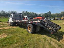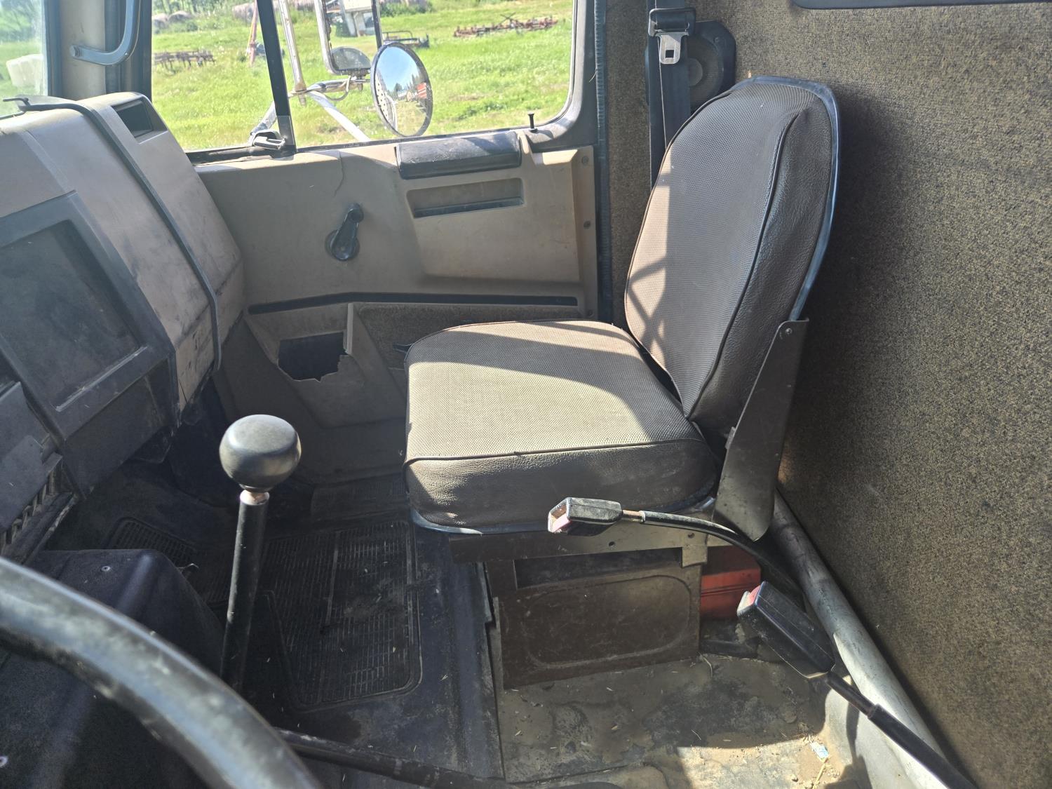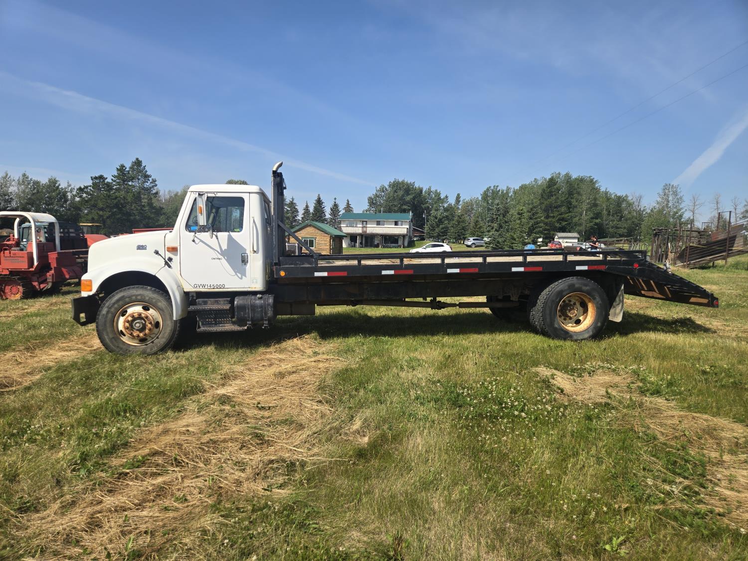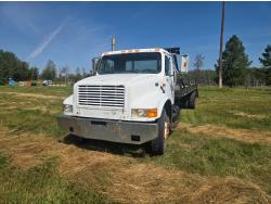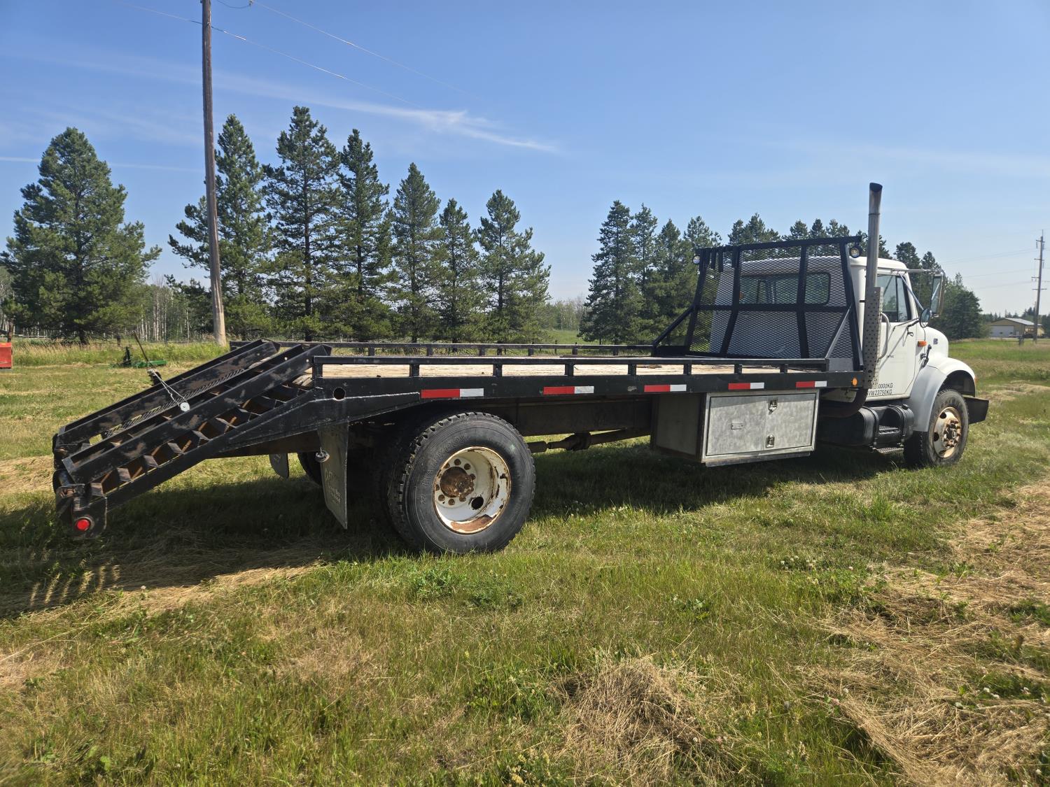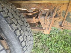 International DT466 6 cylinder diesel engine, manual transmission, 18 ft wood deck with 4 ft beaver tails, 60" flip over ramps, (1) under deck tool storage box, hydraulic brakes, spring suspension, 11R22.5 tires